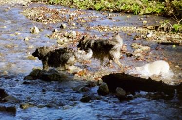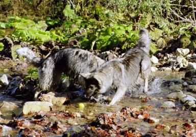 Ice und Dakota beim herumtollen im Bach
