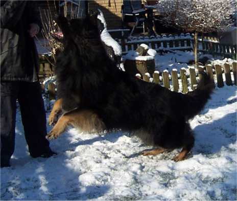 Nico ist ein absoluter Einmannhund. Seine Stärken liegen darin, keinen Menschen an "sein" Frauchen zu lassen. Diese Eigenschaft von Nico ist bei den gelegentlichen Wachdiensten von großem Vorteil. Ebenso bewacht er die Hündinnen und Welpen und duldet in "seinem Garten" nicht einmal einen Vogel. Beim spazieren gehen ist er trotz seiner Zivilschärfe ein angenehmer Begleiter, denn andere Hunde sowie Menschen werden dann von ihm völlig ignoriert. Es sei denn, die Leute sind so vermessen, seinem Frauchen zu nahe zu kommen.