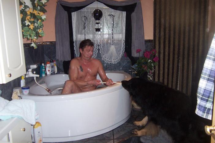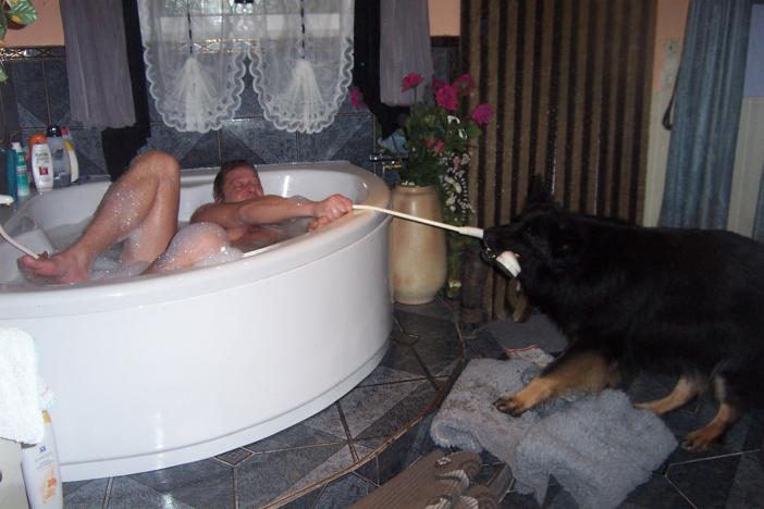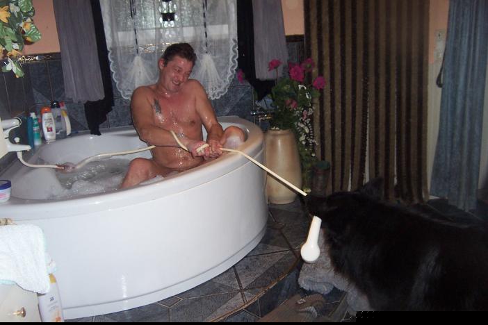 Pst..... ich muß euch was zeigen, mein Männe findet das bestimmt gar nicht so witzig wenn ich die Bilder in Netz stelle, aber egal, das kann man nicht vorenthalten... Jedenfalls ,.Herbert hat Niko geärgert, er saß in der Wanne und hat Niko immer wenn er vorbeikam am Fell geziept, Niko nicht faul wollte in die Wanne springen und Herbert auch mal "ziepen". Herbert nimmt den Duschschlauch und will Niko damit wegjagen indem er das Wasser aufdreht...... Das Resultat könnt ihr sehen...... Und ich.... ich brauch einen neuen Duschschlauch, und wer musste hinterher wieder putzen.....