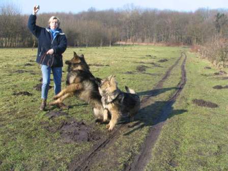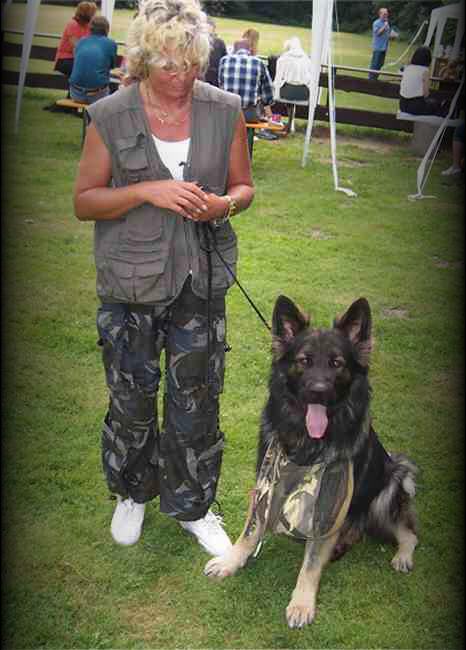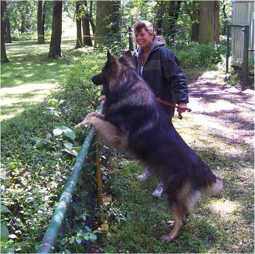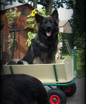 Über unseren Wotan könnte man sicherlich ein ganzes Buch schreiben. Er hat den ganzen Tag "Spökskes" im Kopf. Sein neuester Quatsch, er "klaut" Schlappen..... Mit denen rennt er dann mit hocherhobenen Kopf quer durch den Garten, damit ihn auch ja jeder sieht. Und dann will er tauschen.... Schlappen gegen Leckerli... Inzwischen hat er längst seine BH Prüfung mit 59 von 60 möglichen Punkten bestanden. Sein Röntgenbefund ist HD-Frei, er ist angekört, mit einem tollen Körbericht und hat unzählige Schauen gelaufen, immer im vorzüglich. Wotan hat sich mit seinen noch nicht ganz 2 Jahren zu einem super aufgebauten Rüden entwickelt. Er ist überaus temperamentvoll, dabei gut führig und macht einen absolut überzeugenden Schutzdienst. Er spielt für sein Leben gern, schwimmt und taucht nach fallengelassenen Gegenständen. Er ist in allen Alltagssituationen sicher und besticht jeden der ihn kennen lernt durch seine Späße. Wotan hat inzwischen bereits mehrfach gedeckt und scheint seinen breiten Kopf und seine Masse zu vererben. Am 27.7 haben wir beim Hunderennen mitgemacht, echt irre, Wotan trug meine Tasche umher, weil es mir zu lästig war sie mit herumzuschleppen. Haben auch ein paar neue Bilder gemacht, kommen nachfolgend. Übrigens hat er es gegen einen Windhund und mehreren Malinois sogar auf den 4ten Platz gebracht. Allerdings geschlagen von Sito vom schwarzen Panther. Am 28.7. habe ich ihn auch noch mal ausgestellt, er ist inzwischen Internationaler Champion und hat heute die Europe-du Continent Schau gewonnen. Übrigens ich finde es lohnt sich auch seine alten Seiten mal anzuschauen, da ist wirklich schön mitzuverfolgen wie er sich entwickelt hat.