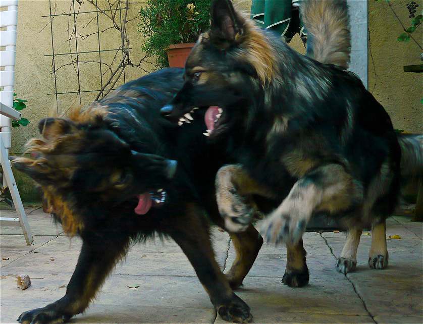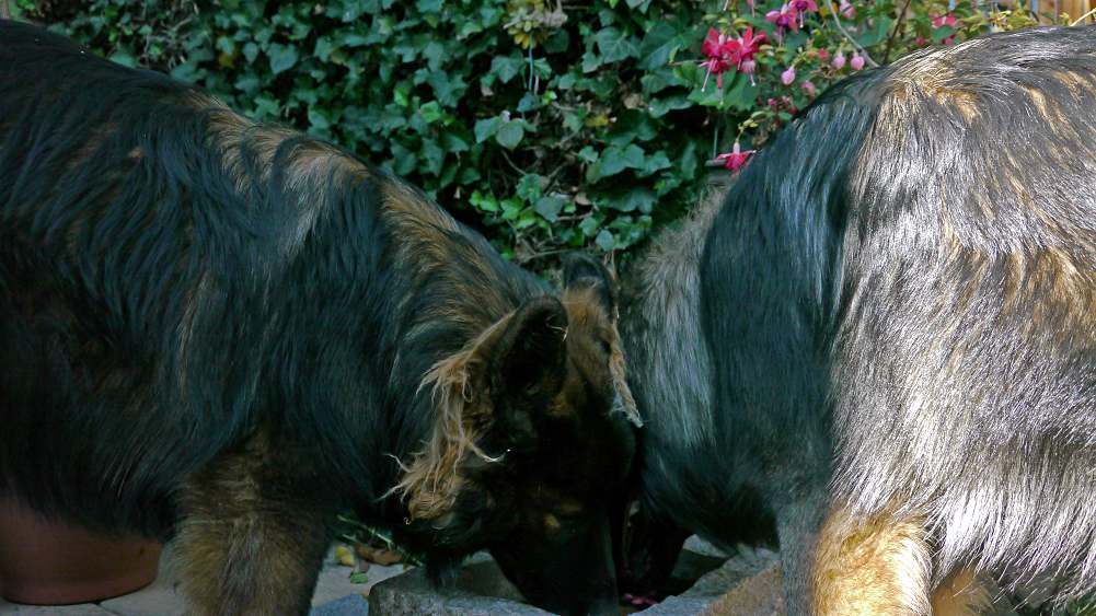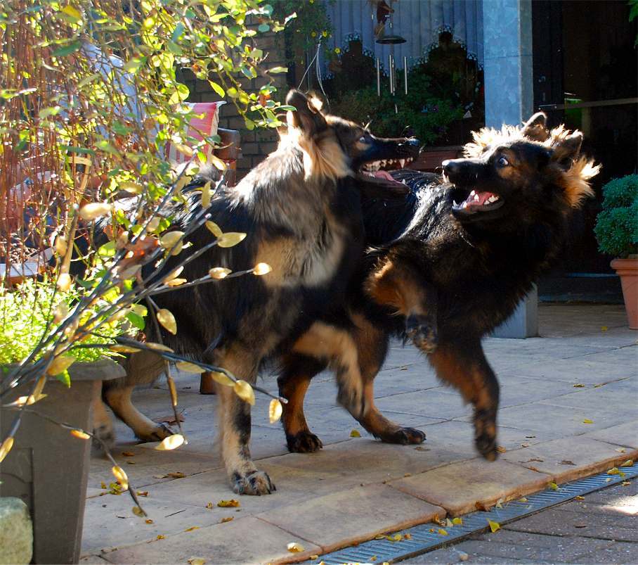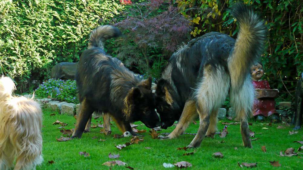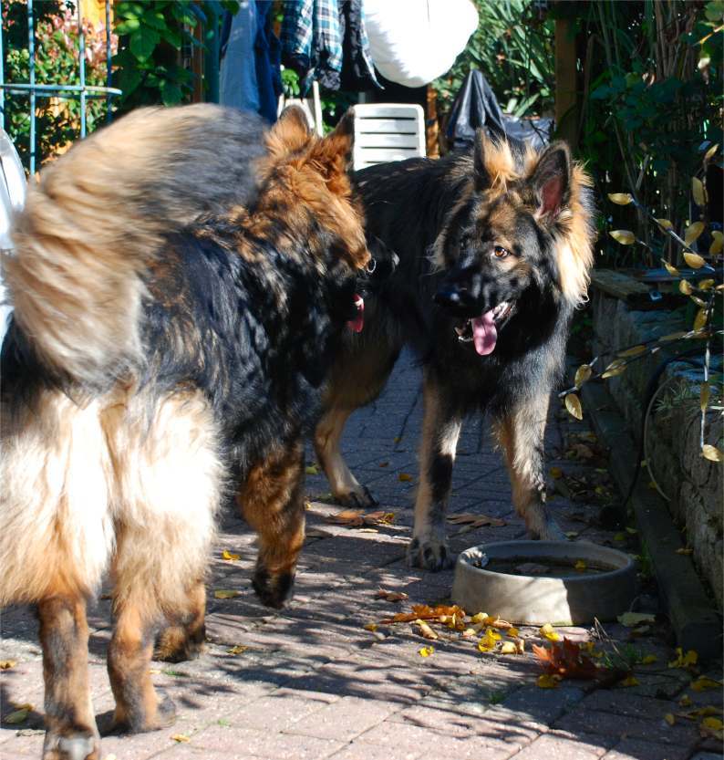Die beiden haben sich wirklich super gut vertragen, die Haare flogen nur so und "Fangen spielen" war angesagt. Über Zäune und Bänke ging es quer durch den ganzen Garten.