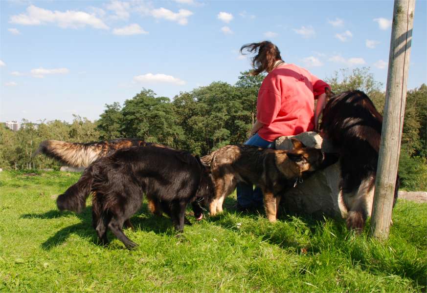 September/Oktober 2010 Irgendwie bin ich in letzter Zeit andauernd mit den Hunden unterwegs, so das kaum Zeit für die HP bleibt :-( Zudem möchte ich nächste Woche mit den Hündinnen Prüfung machen, und da ist schon ein bisschen Stress und Arbeit angesagt. Zur Zeit bin ich viel auf dem Hundeplatz, danach oder davor mit Freunden unterwegs, mein Männe sagt schon.. ich solle doch mal die Wäsche wegräumen, aber wer hat denn Zeit für so eklige banale Haushaltsdinge :-) Nee Spaß beiseite, viel Arbeit im Garten, viel Arbeit am Haus und Hunde, Prüfungen ..und schönes Wetter also...ausnutzen! Carola kam mit ihrer Hundebande vorbei und nachdem wir uns stundenlang auf dem hundeplatz "rumgequält" haben, brauchten wir noch einen kleinen oder etwas größeren Entspannungsspaziergang! Also, ich kenne da eine wunderschöne Gegend, gar nicht so arg weit zu fahren, mit total wechselndem Gelände, Wald, Wiesen, Berge (kleine zumindest) also wirklich superschön da, natürlich auch (leider) genügend Matschlöcher :-) Nachdem wir da eine Runde gelaufen sind, war auf einem der Aussichtspunkte Pause angesagt. Carola und jetzt kommts... :-) mit Bällen in der Hosentasche setzt sich zunächst auf einen der Steine und schaut sich die Gegend an, ich hab schon gesehen, das Wotan wusste, das sie Bälle in der Hosentasche hat, und hab mit Kamera darauf gewartet (mit nem Grinsen im Gesicht) was wohl als nächstes passiert :-) Natürlich dauerte es auch überhaupt nicht lange, Carola ignorierte Wotans "Bitte" ihm doch einen Ball zu überlassen, Immer wieder zappelt er vor ihr rum und machte deutlich das er ""seinen oder auch einen anderen"" Ball haben wollte... Aber.. Carola... störte sich nicht dran.. und dann kam es... Wotan um Carola rum... und "nahm" sich einen Ball, leider steckte der in der Hosentasche.. und Carolas Hinterteil steckte schließlich auch noch da drin :-) Das war ein Bild für die Götter... Carola schoss empört in die Höhe, mit "bösem" Gesicht und versuchte sich zu beschweren, sah mich... vor lauter Lachen konnte ich kaum fotografieren ... und wusste sofort, das ich das ganze schon lange beobachte :-)