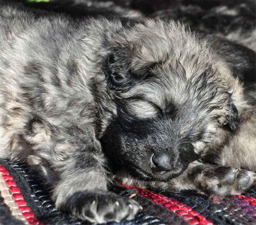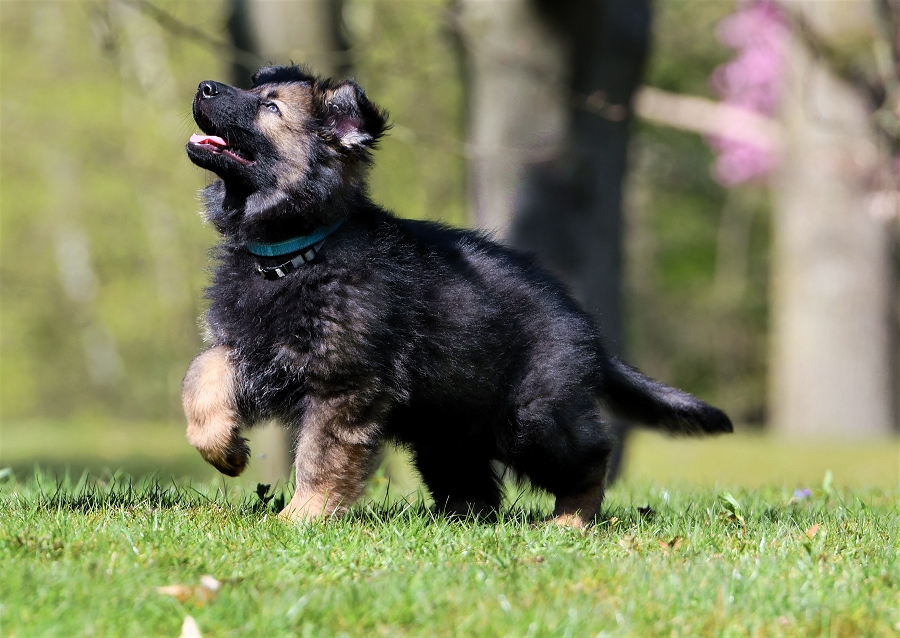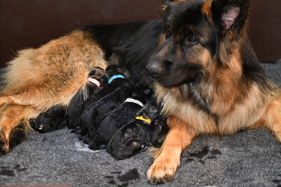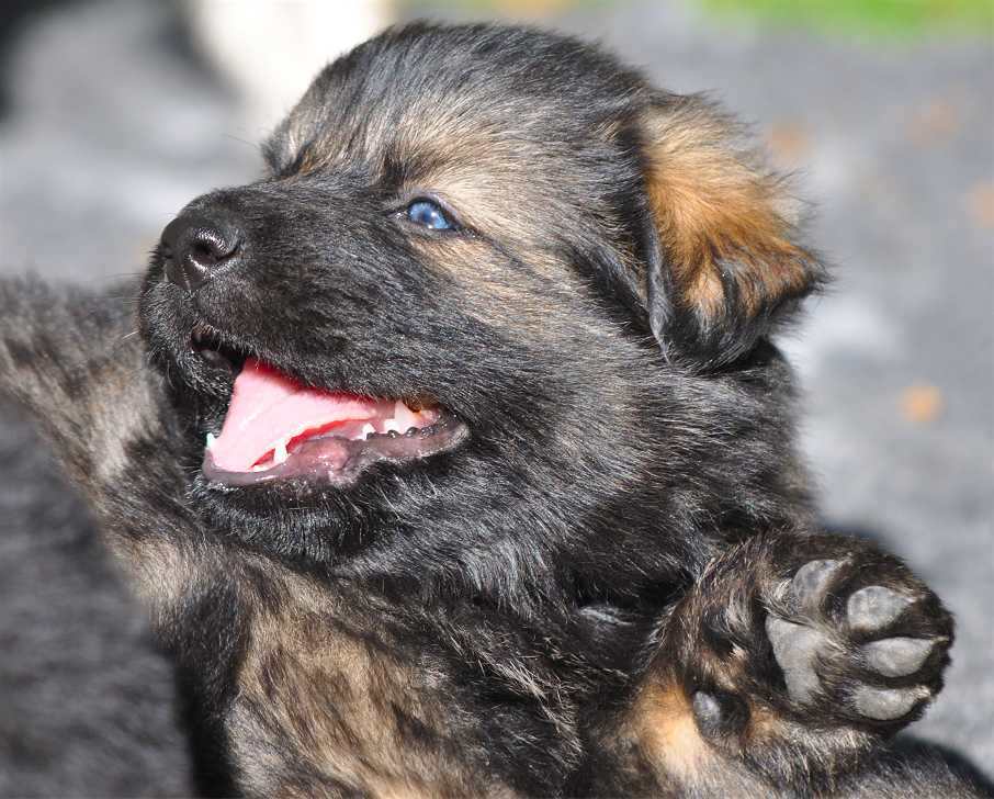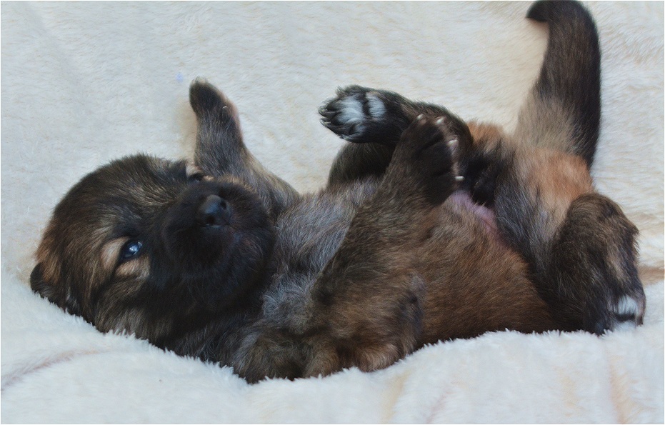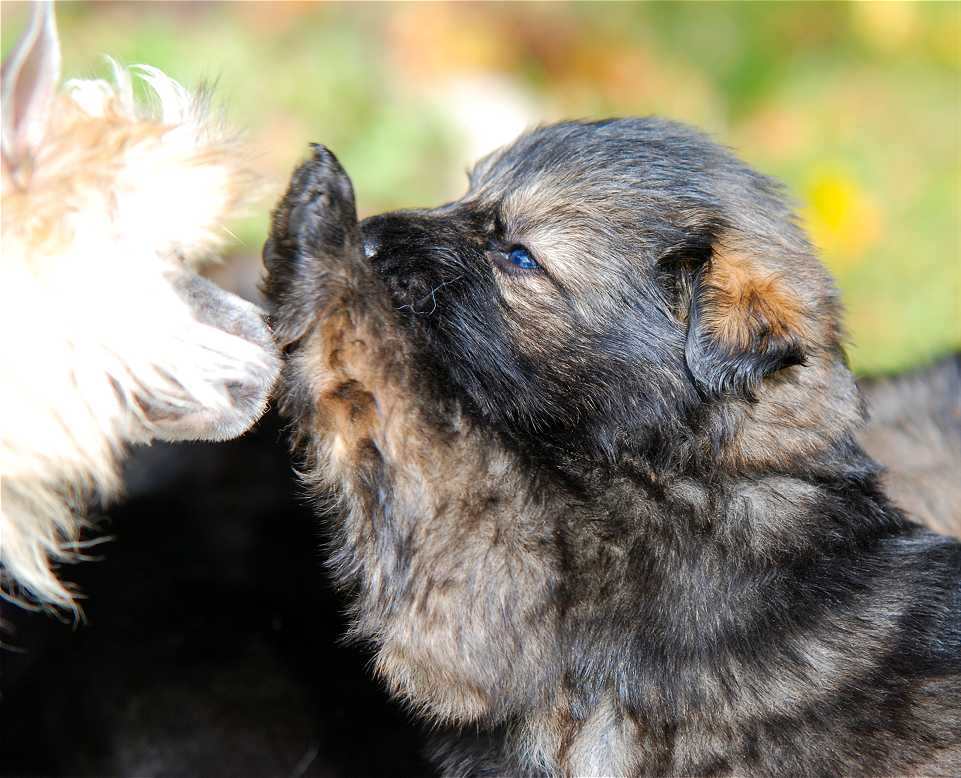 Schon mit der 2ten Woche fangen die ersten an zu bellen und den Versuch zu starten sich hinzustellen. Die Ohren und Augen fangen an sich zu öffnen und manches mal, heben sie den Kopf wenn "Mensch" den Raum betritt und sie scheinen zu lauschen. Und dann ist er da, der Tag aller Tage, meist kurz vor der dritten Woche ... Die Welpen hören und wedeln mit ihren kleinen Ruten ganz wild, wenn man den Raum betritt und sie ihre Bezugspersonen erkennen. Viel wird gesagt das ist erst ab der vierten Woche aber das ist nicht so, wir haben schon Babys gehabt die mit der 2ten Woche dieses Verhalten gezeigt haben. Und was macht Mensch.... Ein breites Grinsen erhellen in der Regel die Gesichter von Frauchen und Herrchens, wenn die Kleinen vertrauensvoll auf ihren kurzen Beinchen wedelnd zumindest versuchen heran zu kommen.