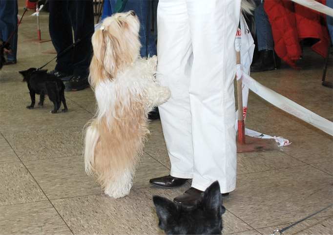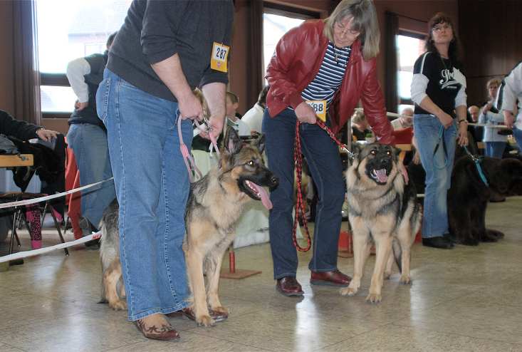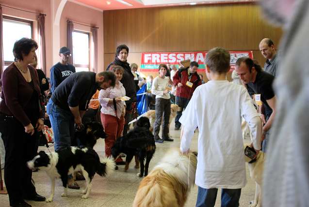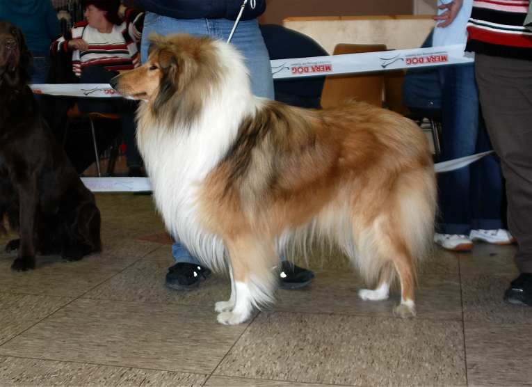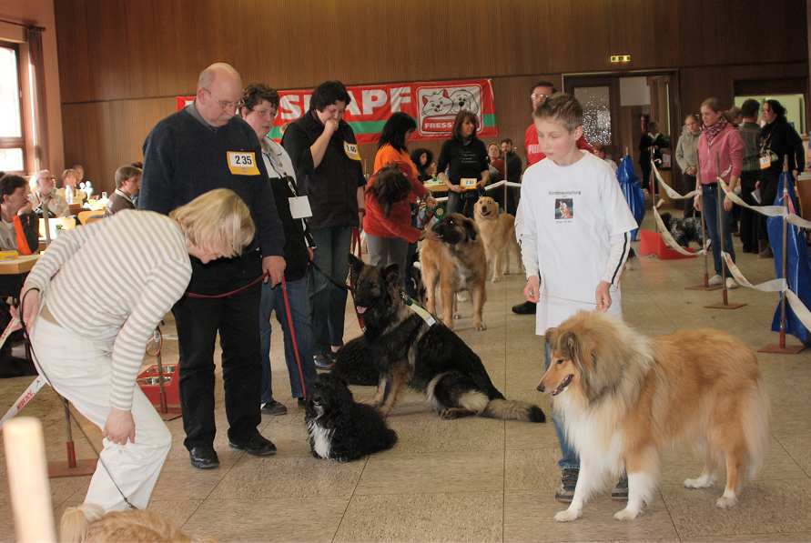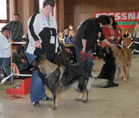 Am 6.4.08 fuhren wir zur Weltsiegerausstellung nach Stolberg, das fing morgens schon grandios an, zuerst fuhr ich auf die falsche Autobahn, dann war am Autobahnkreuz genau die Abfahrt gesperrt auf die ich die Bahn wechseln musste und zudem, um dem ganzen die Krönung aufzusetzen hatte ich im Navi eine falsche Zieladresse angegeben!! Genial, sag ich euch, im Schneegestöber und bei Regen am Sonntag, fast mitten in der Nacht :-) durch die Gegend zu fahren. Na irgendwann kamen wir dann auch tatsächlich dann an. Gerade noch rechtzeitig. Es waren viele Hunde da, und es gab unendlich viel zu sehen, interessante Gespräche rund um Hund und ums züchten überhaupt waren natürlich der Mittelpunkt. Ich hatte Shandar gemeldet, die von Sandra geführt wurde. Bei den Großhundrassen stach eine Zuchtgruppe von Neufundländern allein durch ihre machtvolle Erscheinung deutlich raus. Tolle Hunde. Zudem gab es natürlich viele Altdeutsche und auch jede menge Collies, wirklich super gepflegte und elegante Erscheinungen. Voll war es ohne Ende und gemeinerweise schien dann auch noch den ganzen Tag die Sonne, wo es auf der Hinfahrt ja nun gar nicht danach ausgesehen hatte. Viele Bilder haben wir nicht gemacht, ich kam vor lauter Quatschen nicht dazu, und die wenigen die ich habe :-((