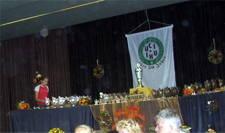 Richterin Ursel Welsch überreicht Sandra den Pokal für den ersten Platz