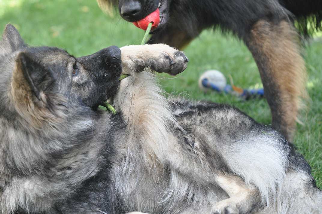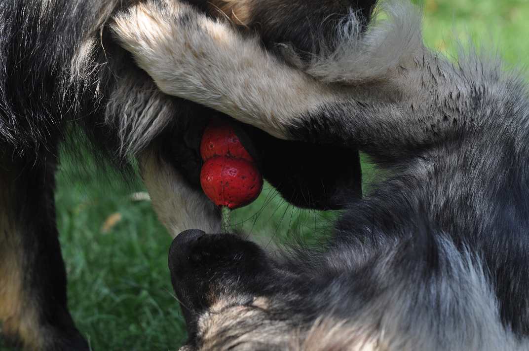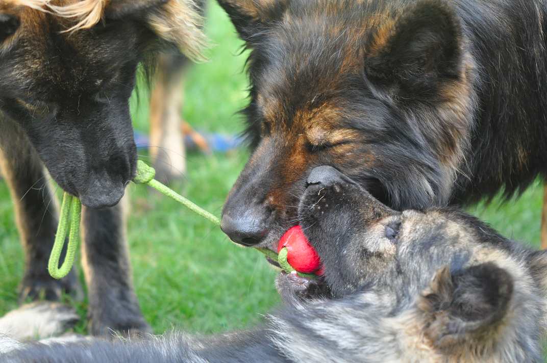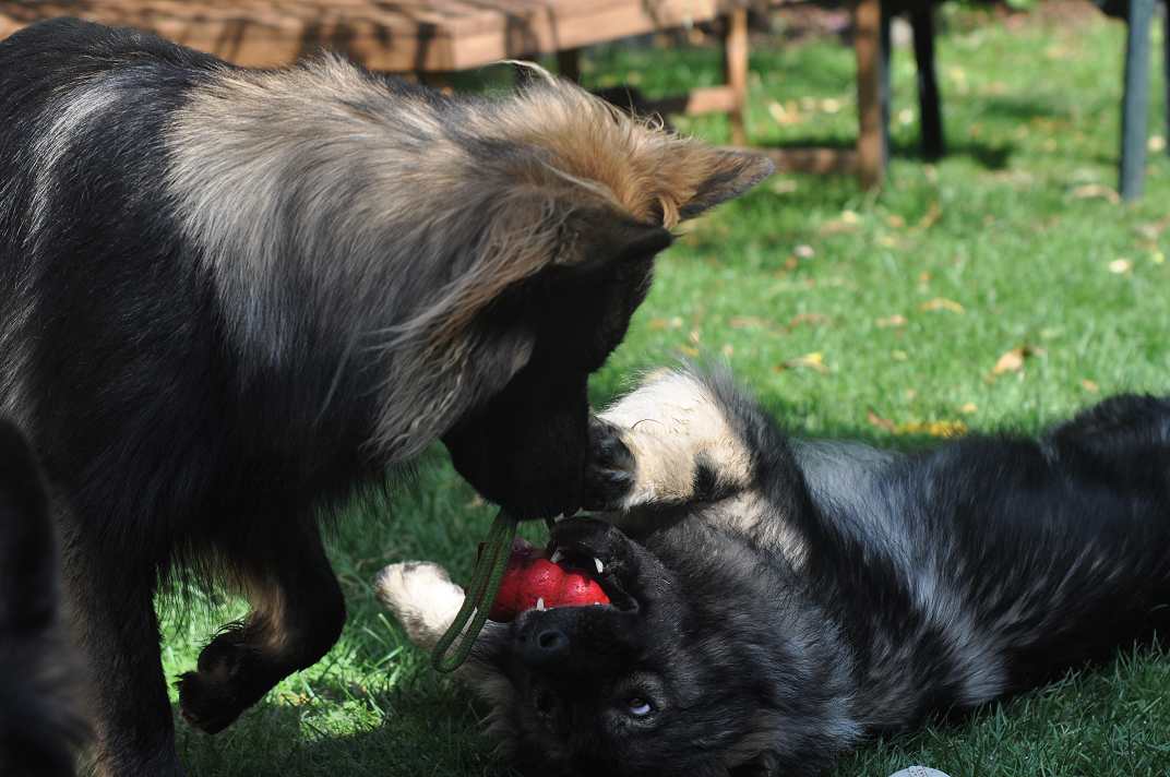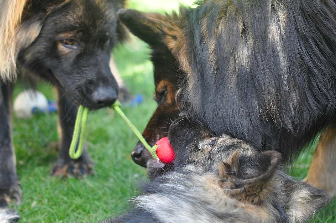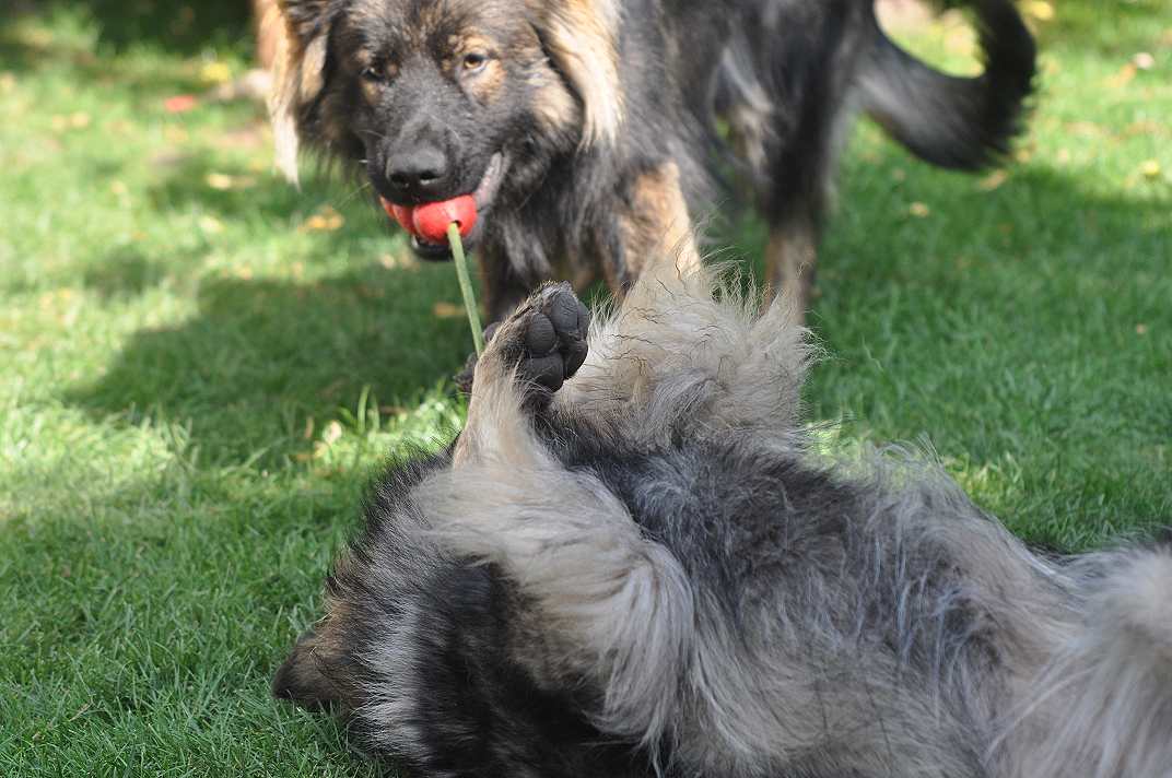 Wotan steht mit dem Ball im Fang nur einen Moment da, und gibt dann seinerseits den Ball wieder her, dreht sich um und geht! (Sicherung der Zusammengehörigkeit, innerhalb des Rudels, faszinierend)