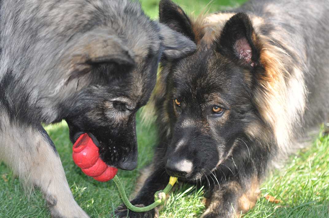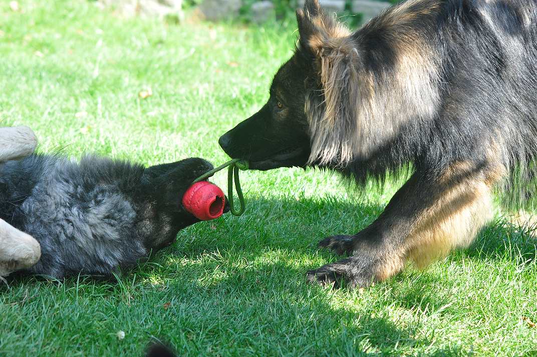 Kana`s Ball... ihr Heiligtum... und Grizz, der deutlich macht, das er nur spielen möchte, nicht kämpfen will um den Ball, sondern nur Interaktion und Spiel miteinander (Kana gibt ihren Ball niemals her, sie wird richtig böse, wenn einer der Hunde ihren Ball haben will und ihr diesen streitig macht, selbst Wotan gibt sie den (wenn Trieb..Spiel.. angesagt ist, nur sehr sehr unwillig ab, und auch erst wenn Wotan mit enormer ""Prügelstrafe"" droht) Und nun schaut wie man trotz dieser doch für Kana so wichtigen "Resource" spielen kann Grizz "bittet" um den Ball, Kana gibt ihn nicht, aber sie lässt ihren Sohn gewähren und so kann man ein Schauspiel sehen...