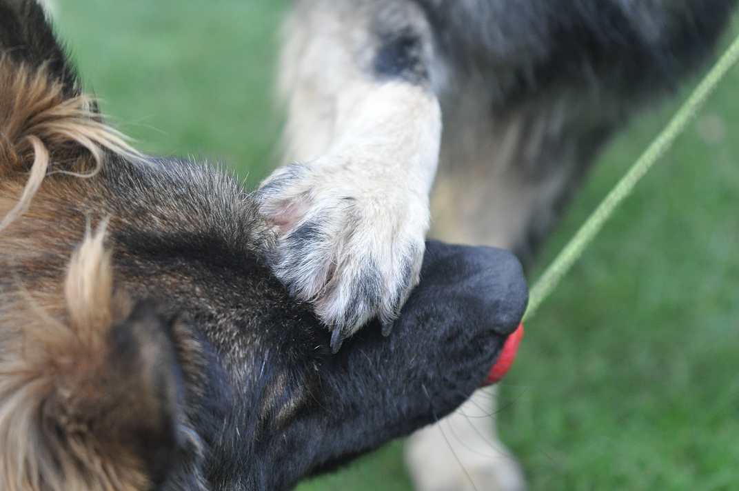 So festigen die Hunde untereinander immer wieder die Struktur in ihrer Welt. Versichern sich der Loyalität, Vertrauen einander und stärken die Bindung. Mit fremden Hunden würde das nicht gehen. Aber untereinander ist Vertrauen und Sicherheit in die Führung und die Loyalität untereinander das wichtigste für Hunde überhaupt. Niemals würden die Hunde hier Wotan ernstlich anzweifeln, ihm wird gehorcht denn er ist Bestandteil des Rudels. Er führt sicher und souverän, er kann auch alt sein, längst nicht mehr im Besitz seiner ganzen Kraft, aber in einem funktionierenden Familienverband wird er niemals angezweifelt, dient seine Erfahrung doch dem ganzen Rudel Das müssen Menschen sich erst erarbeiten! Mit Verständnis und dem Wissen, das ein Hund ganz andere Werte wie ein Mensch hat, und niemals so denken wird wie ein Mensch.