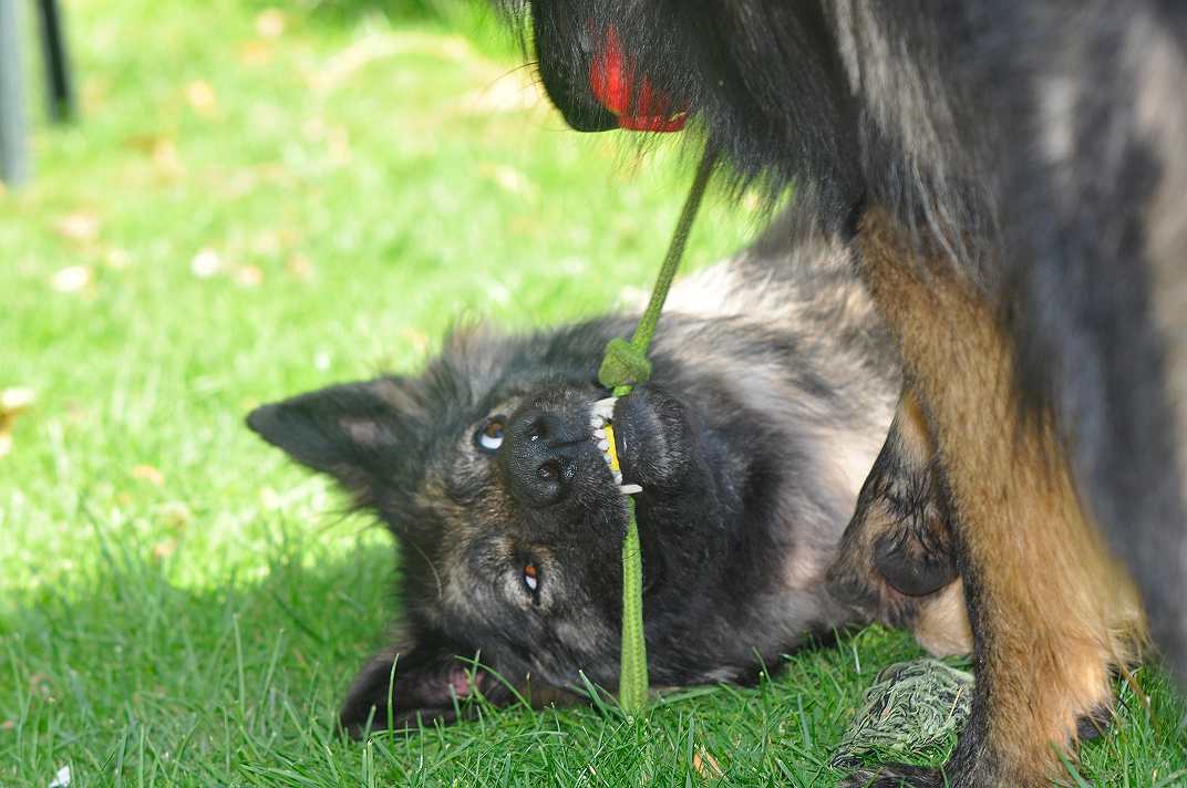 Kana rutscht das Band zwischen den Zähnen weg und sie sichert es ein bisschen.. Jetzt tritt Wotan auf den Plan, der sich das ganze, liegend seit 10 Minuten ansieht, anscheinend möchte er nun ...Disziplin.. sehen.! Grizz bedauert das, aber seine Augen und Haltung sagen jetzt schon... O.K.