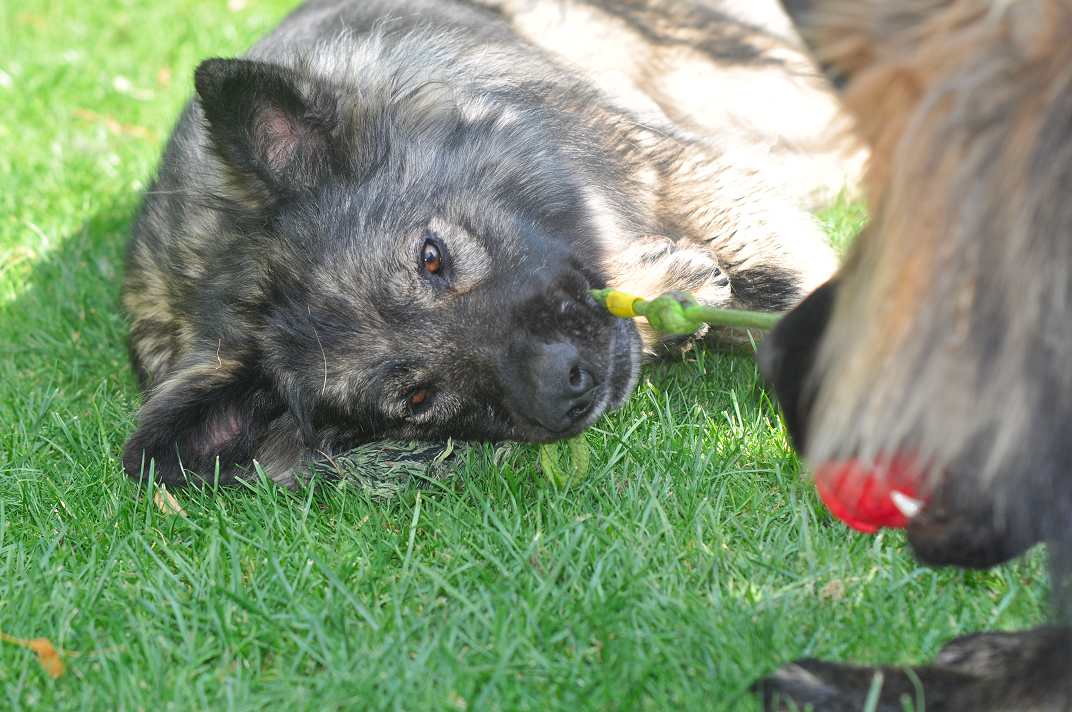 Dakota grabscht Grizz, das Spielzeug vor der Nase weg, der Blick von Grizzly, der war echt sehenswert! Überhaupt Grizzly.... diesen Hund kann ich nicht beschreiben, er ist und bleibt ein "Kanakind" Verrückt, suizidgefährdet, (er rast in halsbrecherischem Tempo Abhänge runter und vergisst komplett das man irgendwann auch mal ..Bremsen.. muss) unglaublich freundlich, gehorsam, wenn wir ihm was sagen, oder aber von Wotan oder Dakota kommt eine "Ansage" er gehorcht sofort, springt seiner Mama Chakana immer noch auf dem Kopf rum, (darf er bei Kana ungestraft) und ist völlig unaufdringlich. Er ist fröhlich, lustig und in seinem Übermut schießt er ab und an über`s Ziel hinaus :-) Das führt zu den kuriosesten Augenblicken, in denen ich schon Tränen über seinen Unsinn gelacht habe.