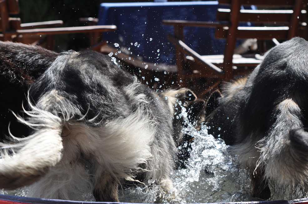 Das obligatorische MEINS.....MEINS....MEINS.. übrigens der ganze Garten, gleicht einem Spielplatz, überall, aber auch wirklich überall, liegt irgendwelches Spielzeugs rum. Am allerbesten ist es natürlich, wenn man unbedarft über die Wiese geht und dann unvermittelt auf soon Quitscheding tritt, erst erschreckt man sich furchtbar und... hat sofort alle Hunde an der Pelle hängen, die einem erklären das ich gerade mindestens einen ""Mordanschlag"" auf Quitschies und Co ausgeübt habe! Wir haben den Hundepool mit Absicht in den Hof, bzw an der Terrasse aufgestellt, die Hunde sind eh immer da wo man selber ist, also was soll er auf der Wiese stehen, wenn wir auf der Terrasse sind. Wie der Zustand der Terrasse allerdings nach so einem Badespaß der Hunde aussieht, und wie man dann selber aussieht, ich denke das brauche ich euch Hundlern nicht zu beschreiben! Natürlich wird auch nicht haltgemacht, auch mal eben schnell ins Haus zu rennen, sich ein Leckerchen zu holen, und platschenaß wieder nach draußen zu marschieren. Auf mein Geschrei, ernte ich nur unverständliche Blicke die aussagen... Na und...mir doch egal :-(