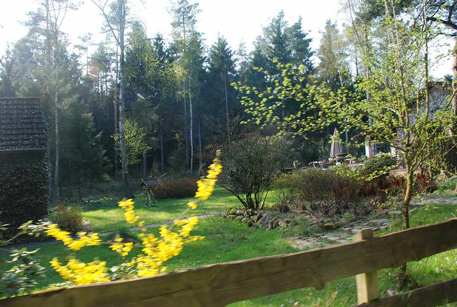 April 2009 Jau.. das war ein irrer Trip :-) Zunächst fing es damit an, das wir klein Fayana bei uns hatten. Ullrich ist nebst Familie in den Skiurlaub gefahren und wir hatten bereits vorher ausgemacht das in dieser Zeit Fayana bei uns bleibt. Ach.. übrigens habe ich nun auch einen kleinen C.C im Alter von 12 Jahren bei mir, aber das ist eine andere ziemlich traurige Geschichte. Die erzähl ich ein anderes mal. Jedenfalls hatten wir supertolles Wetter und Petra und ich hatten schon lange ausgemacht, das ich sie mal besuchen werde. Also.. ab ins Auto und los gehts, mit der Hundemeute Richtung Jesteburg. Nach einigen Stunden sagte mir mein Navi .. da... soll ich abbiegen, mmmhhh.. da?? nun denn.. nach ca 1 1/2 km ´Feldweg stand ich dann urplötzlich vor einem Haus??? Und da.. mitten im Wald .. da wohnt Petra :-))