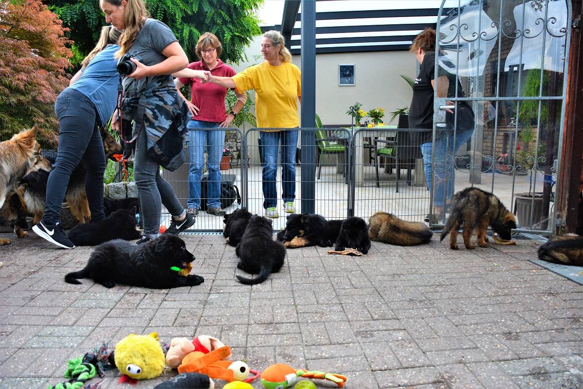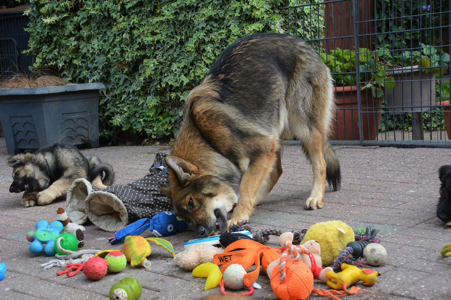 Zum Auftakt hatten wir viel Spielzeug und auch die eine oder andere Leckerei auf den Hof gelegt. Zudem haben wir Welpengitter aufgestellt, das ein bisschen Kontrolle ausgeübt werden konnte Das waren nämlich ganz schön viele kleine, nur Blödsinn im Kopf habende, Hunde :-)