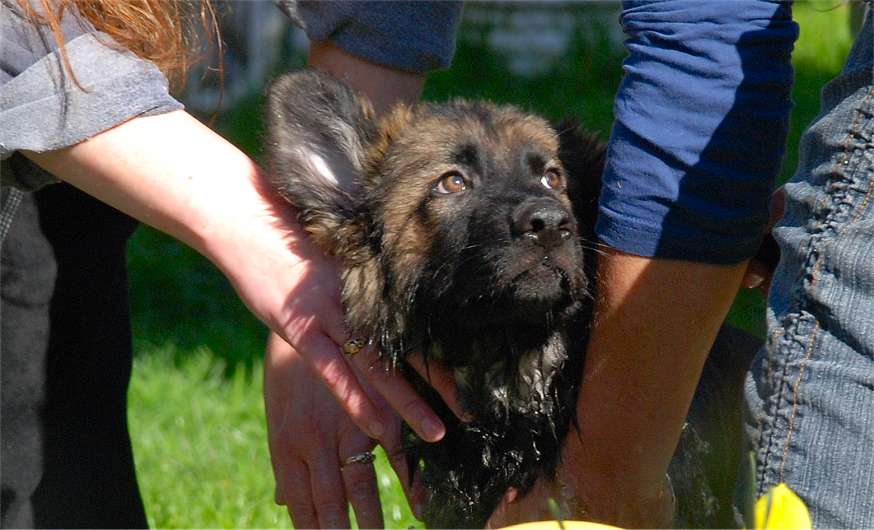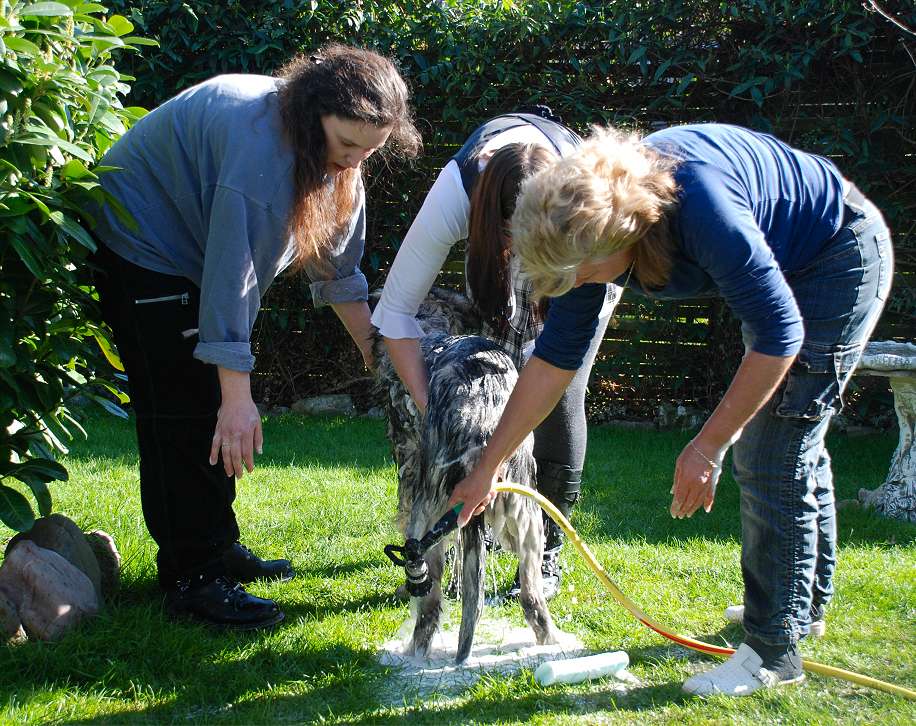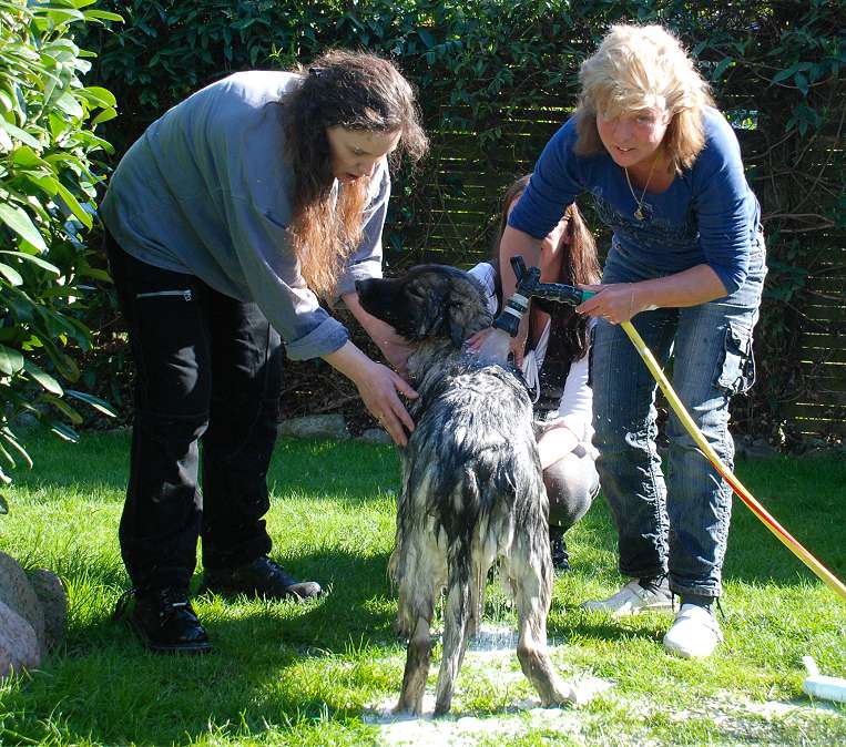 Noch minimal skeptisch, aber ich denke, ihm gefällt es eigentlich auch... Warmes Wasser überall und ganz viele Hände... Was will "Hund" mehr?