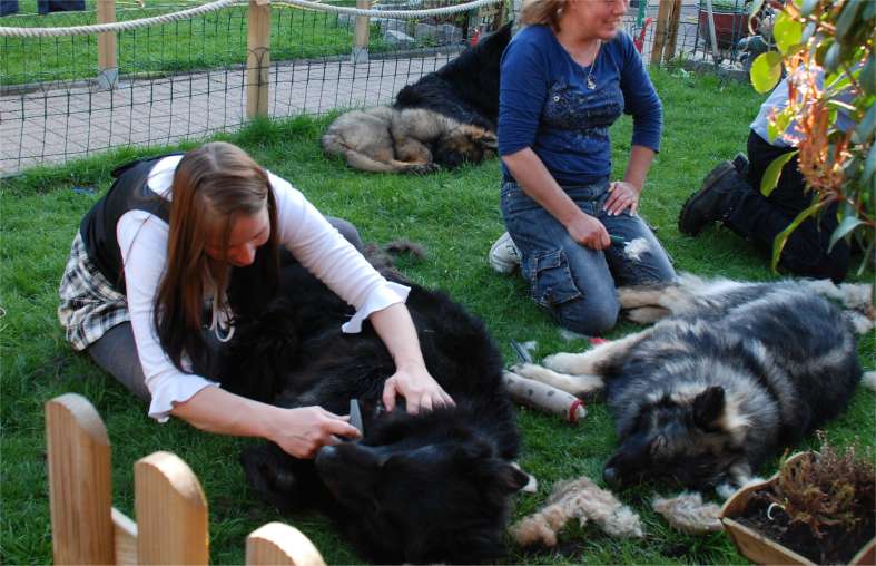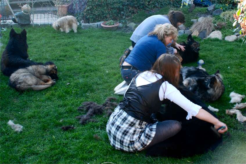 Danach war Garten "Verwüstung" angesagt.... Alle Hunde haaren ab... Winterfell und lange Haare braucht man nun nicht mehr... :-)) Wir armen Weiber haben auf der Wiese in Reih und Glied gehockt, während sich die Männer das eine oder andere mal so nen "Spruch nicht verkneifen konnten ... Meine Hunde finden es toll und ehrlich... ich war so froh das ich es nicht alleine machen musste... :-) Danke Nicole, Danke Carola :-))