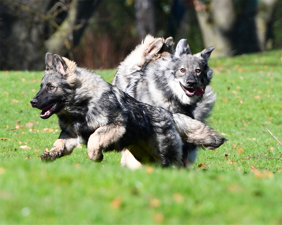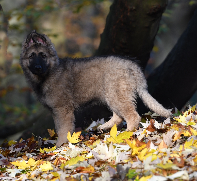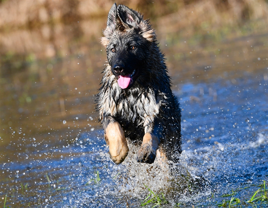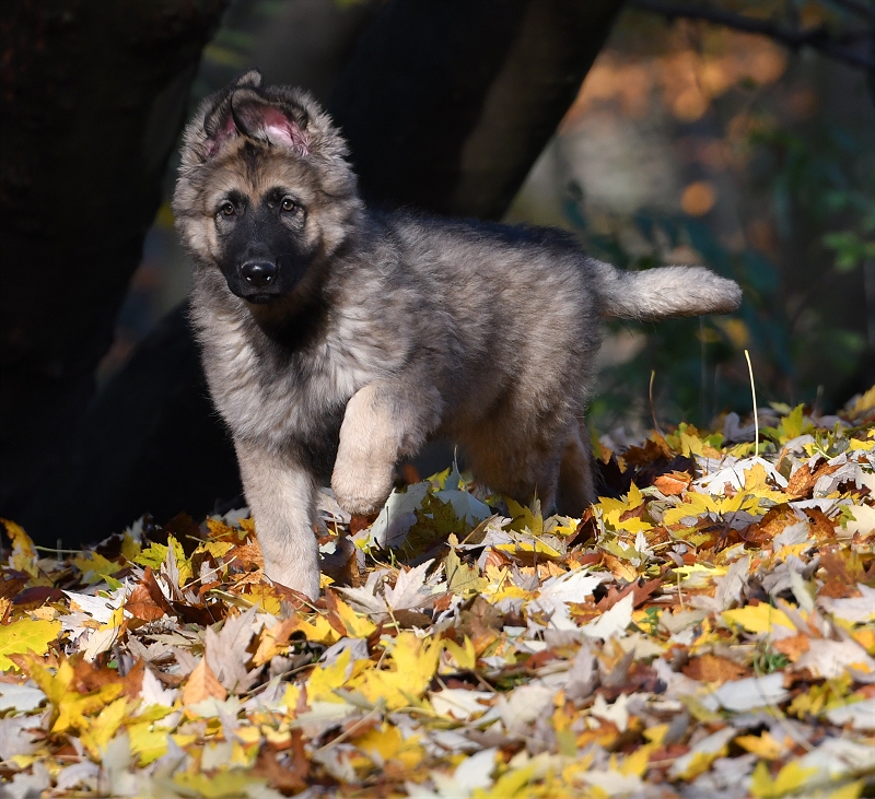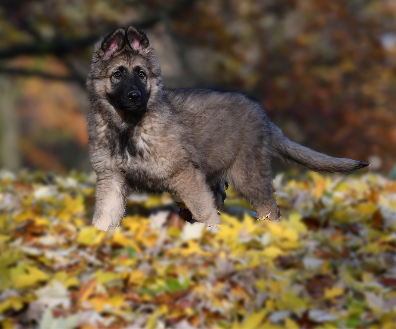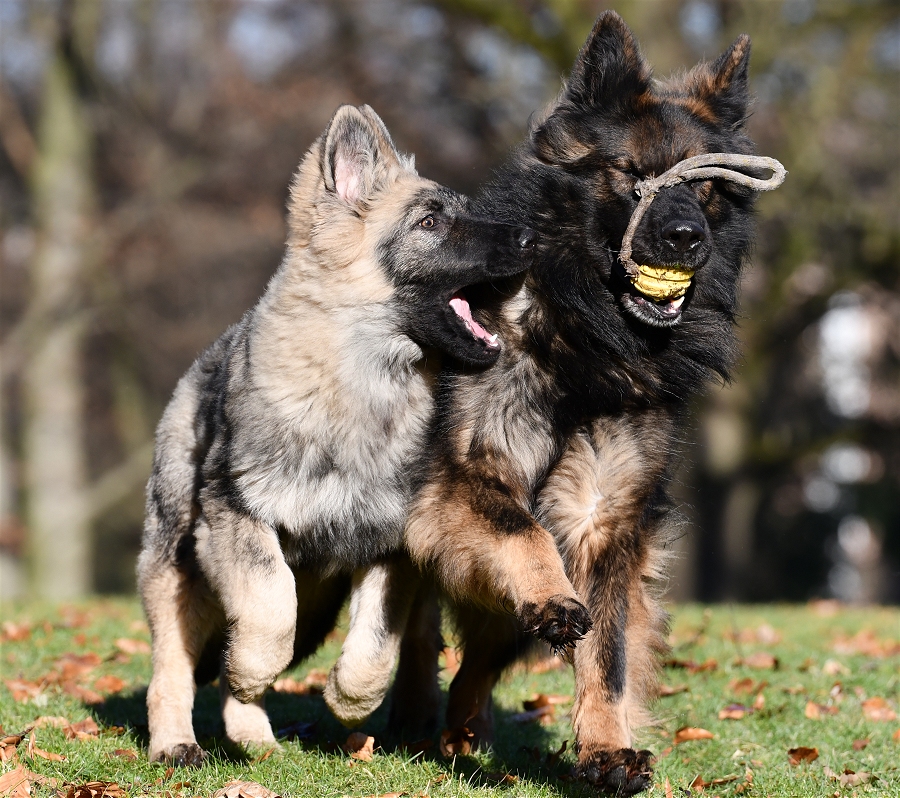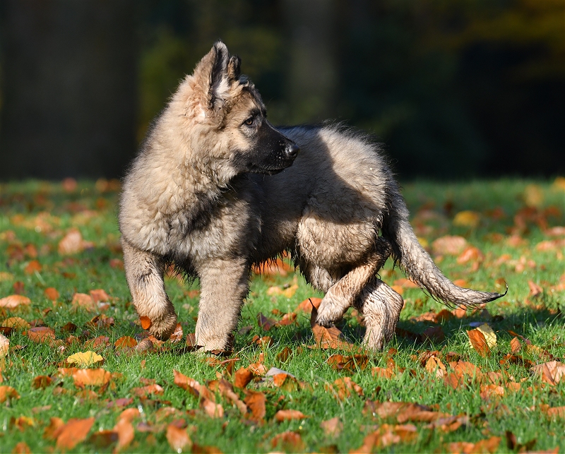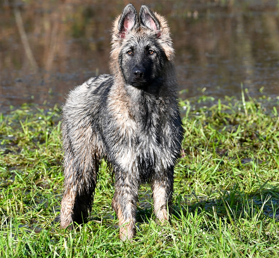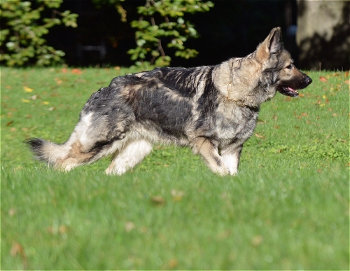 ![]() November... meine Herren, wie schnell die Zeit vergeht ist schon echt unheimlich. Blue ist nun auch schon 14 Monate alt und das Babyfell ist verschwunden. Das kindliche Aussehen hat sich mit dem Flauschfell auch verabschiedet. Sie wirkt erwachsen. Blue ist selbstsicher, überheblich und bekommt ab und an eine Ansage von Ninja. Das nimmt sie auch hin, aber ihr *Arbeitseifer* ist auch nach Ansagen umgebrochen und sie versucht weiterhin Ninja oder LaToya den begehrten Ball abzujagen. Blue ist schnell und wenn ich sage schnell, dann meine ich das auch so. Schneller als alle anderen unserer Hunde, lauffreudig und begeistert von allen neuen Situationen. Sie ist eine sichere und große Hündin, wie alle unsere Hunde sehr gehrorsam. Sie hat einen sehr guten Spiel und Beutetrieb und wird später auch eine wachsame und aufmerksame Hündin sein. Zur Zeit ist sie schlank, hochbeinig und wirkt im Augenblick nicht so wirklich wie ein Schäferhund, sondern eher sehr wölfisch. Ihr Fang ist noch lang und der Kopf mit den engstehenden Ohren eher schmal. Ihr Laufen ist nicht schwingend wie bei den Schäferhunden, am deutlichsten zu sehen im raumgreifenden Trab. Ihr Trab ist knapp über den Boden, schnürend, schnell, der Rücken eine komplett gerade Linie. Sie bewegt sie sich schneller im Trab voran als unsere anderen Hunde. Ihr Blick ist nach vorne gerichtet und vervollständigt das Bild eines Wolfs. Auf den Fotos ist diese Besonderheit natürlich nicht zu erkennen. Auf Videos schon. Nun ich denke sie wird sich auslegen und das jetzt so ausgeprägte wölfische Aussehen wird nach und nach (leider) verschwinden und dem Bild eines Schäferhundes weichen. |