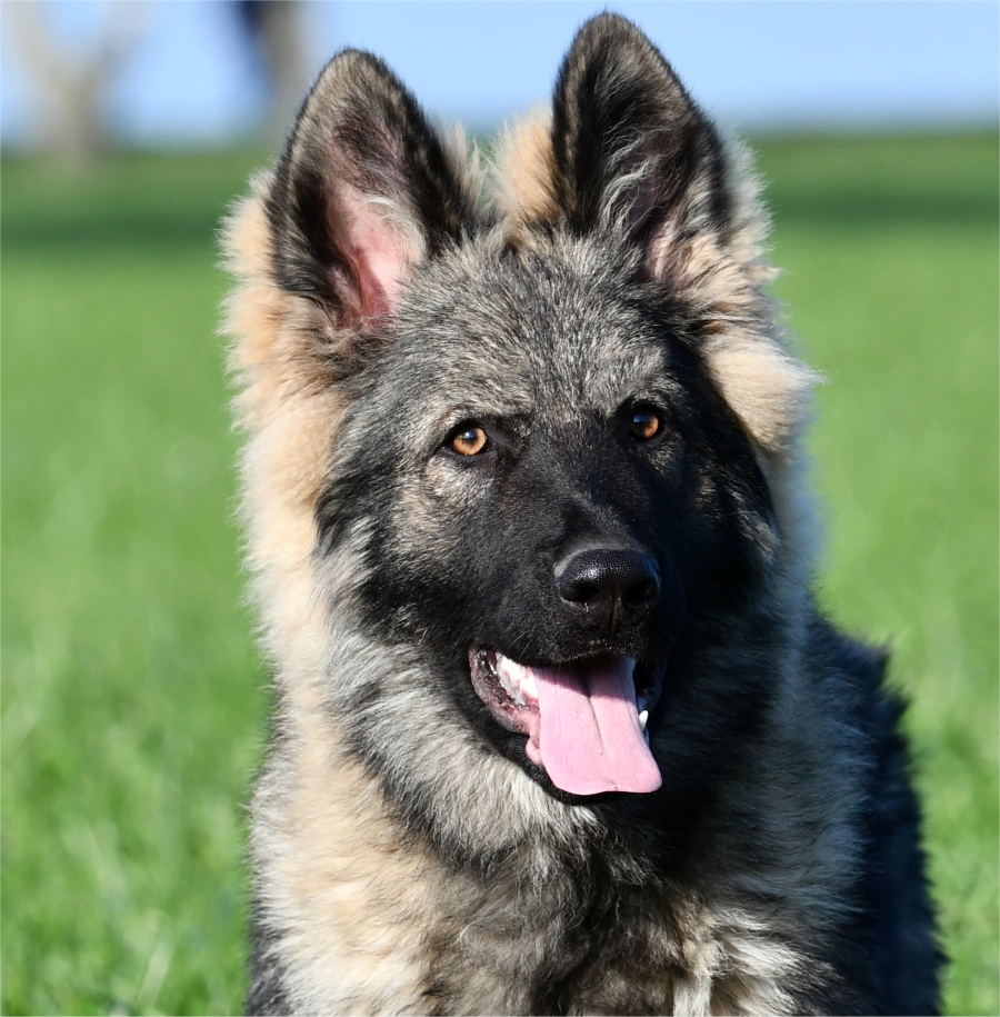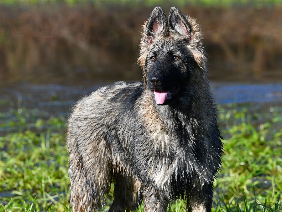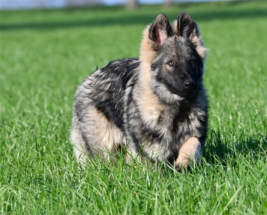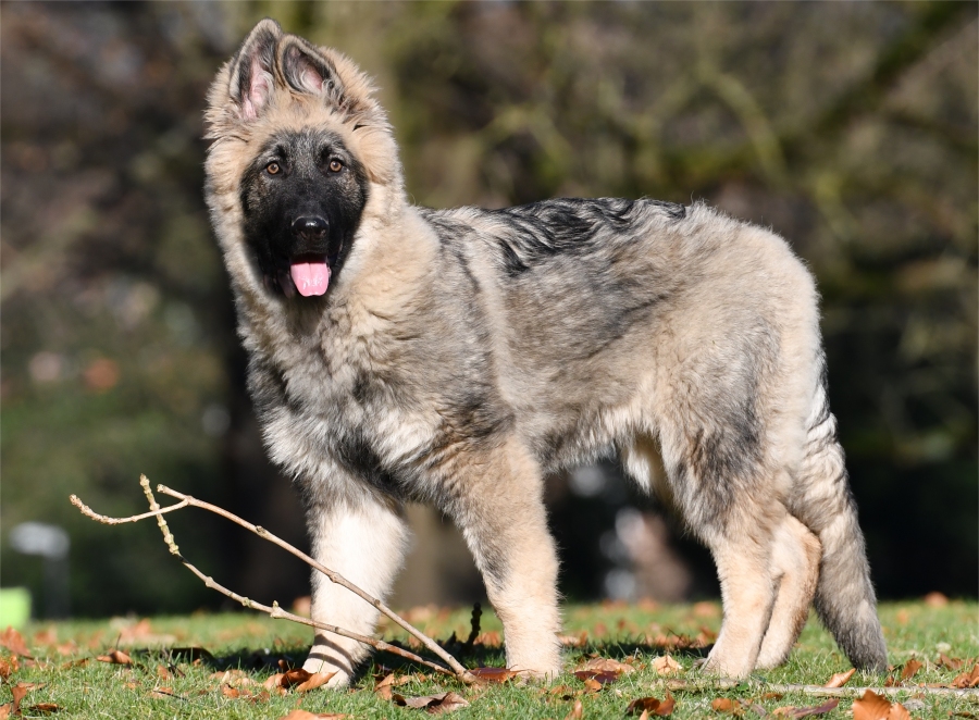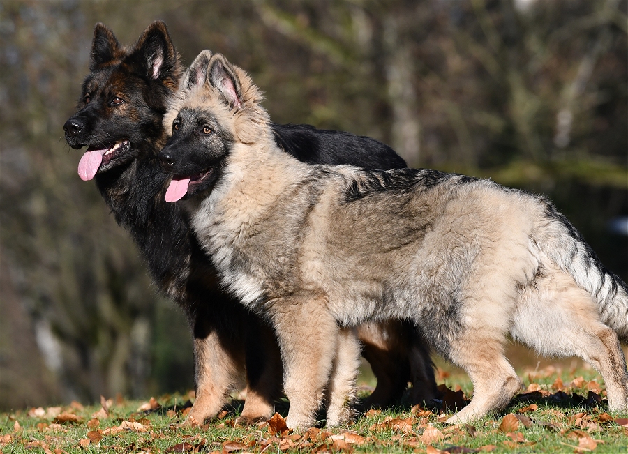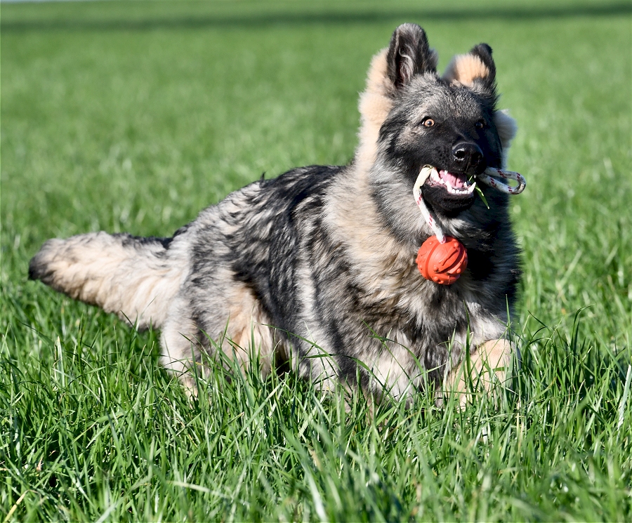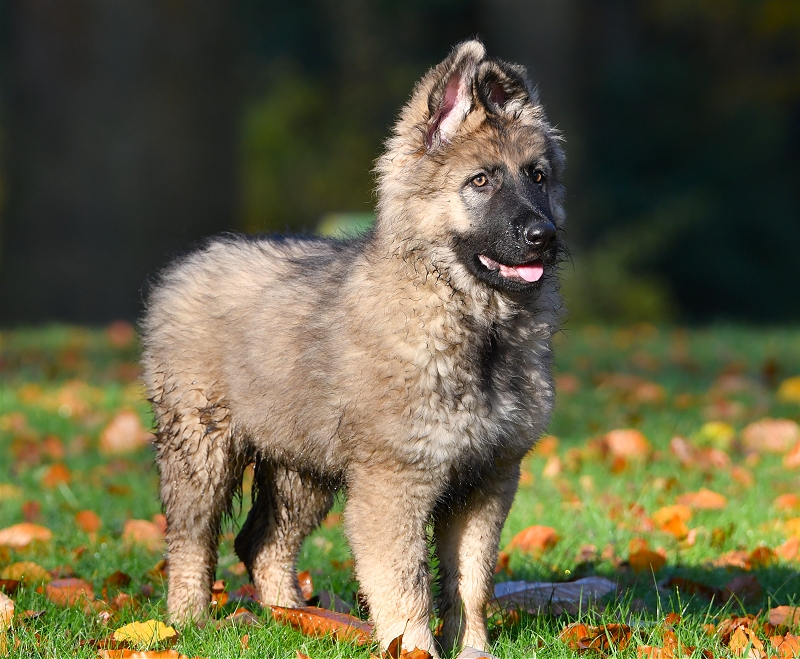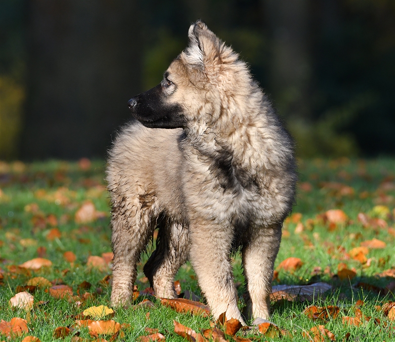 ![]() November... meine Herren, wie schnell die Zeit vergeht ist schon echt unheimlich. Blue ist nun auch schon 14 Monate alt und das Babyfell ist verschwunden. Das kindliche Aussehen hat sich mit dem Flauschfell auch verabschiedet. Sie wirkt erwachsen. Blue ist selbstsicher, überheblich und bekommt ab und an eine Ansage von Ninja. Das nimmt sie auch hin, aber ihr *Arbeitseifer* ist auch nach Ansagen umgebrochen und sie versucht weiterhin Ninja oder LaToya den begehrten Ball abzujagen. Blue ist schnell und wenn ich sage schnell, dann meine ich das auch so. Schneller als alle anderen unserer Hunde, lauffreudig und begeistert von allen neuen Situationen. Sie ist eine sichere und große Hündin, wie alle unsere Hunde sehr gehrorsam. Sie hat einen sehr guten Spiel und Beutetrieb und wird später auch eine wachsame und aufmerksame Hündin sein. Zur Zeit ist sie schlank, hochbeinig und wirkt im Augenblick nicht so wirklich wie ein Schäferhund, sondern eher sehr wölfisch. Ihr Fang ist noch lang und der Kopf mit den engstehenden Ohren eher schmal. Ihr Laufen ist nicht schwingend wie bei den Schäferhunden, am deutlichsten zu sehen im raumgreifenden Trab. Ihr Trab ist knapp über den Boden, schnürend, schnell, der Rücken eine komplett gerade Linie. Sie bewegt sie sich schneller im Trab voran als unsere anderen Hunde. Ihr Blick ist nach vorne gerichtet und vervollständigt das Bild eines Wolfs. Auf den Fotos ist diese Besonderheit natürlich nicht zu erkennen. Auf Videos schon. Nun ich denke sie wird sich auslegen und das jetzt so ausgeprägte wölfische Aussehen wird nach und nach (leider) verschwinden und dem Bild eines Schäferhundes weichen. |