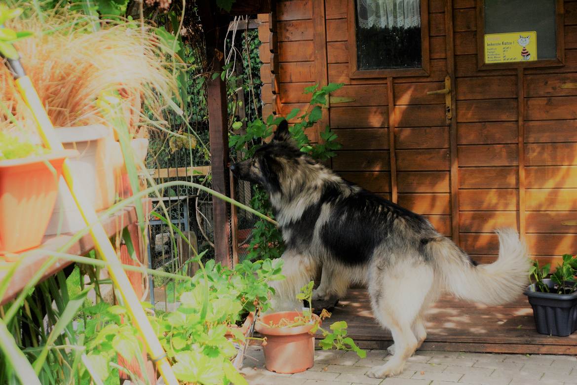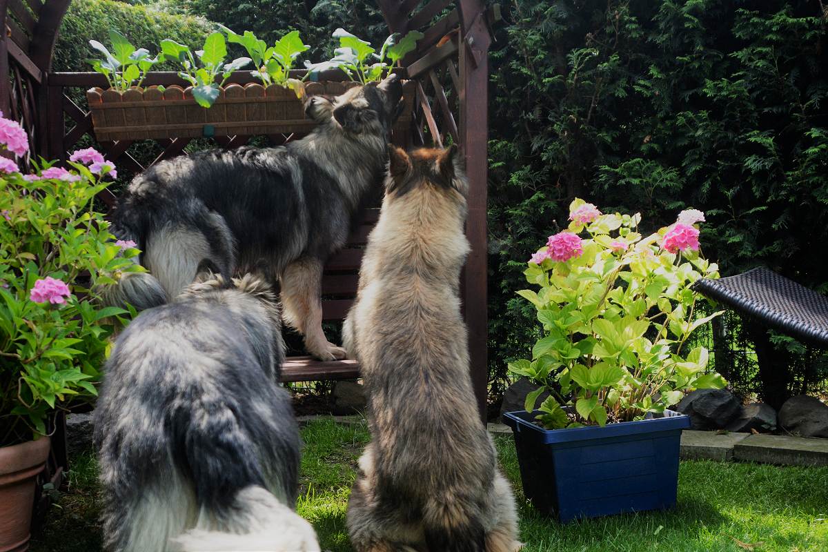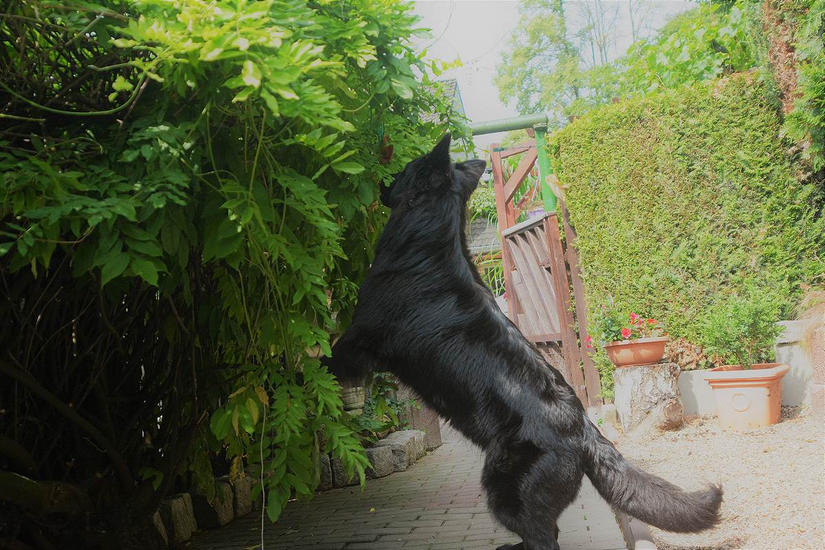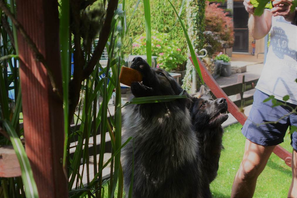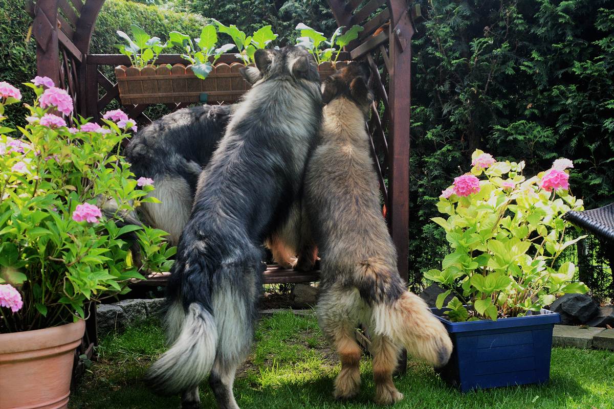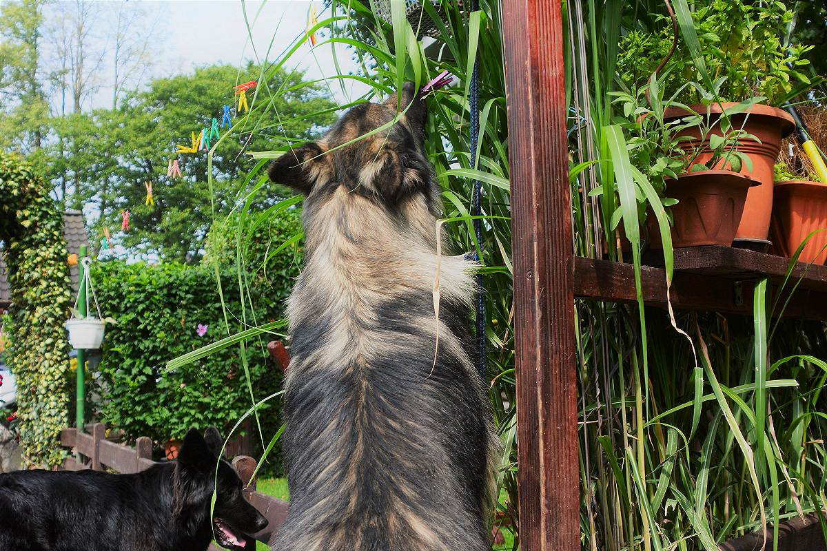Ab und an machen wir uns einen Spaß daraus, im gesamten Garten alle möglichen Leckerchen zu verstecken. Alle Hunde müssen dafür ins Haus, und wir laufen mit 3 Mann umeinander und jeder glaubt die besten "Verstecke" zu kennen. Da hängen dann Frolic an Wäscheklammern, oder kleine Fleischstückchen an Bäumen. Genauso gibt es Leckerstangen unter Steinen versteckt, oder auf Autoreifen findet man auch was, wenn man nur angestrengt genug sucht. Sprich, egal ob oben oder unter, die Hunde müssen suchen, und haben einen unglaublichen Spaß. Keiner kann es erwarten, das das Spiel endlich losgeht. Es ist schon mehr als interessant zu sehen, das sich die Hunde zum Teil gegenseitig beobachten, sprich einer hat etwas entdeckt und die anderen.... versuchen es ebenfalls zu bekommen. Meist guckt dann der ehrliche Finder in die Röhre, er hat die Mühe und "knibbelt" das ""BobBon"", so nennen wir das Spiel, mühselig aus einer Wäscheklammer, es fällt zu Boden... und der der artig einfach nur wartet, und nichts getan hat, hebt es dann auf und schwupps ... weg... isses :-) Ist wie im richtigen Leben, der eine der sich abmüht und der andere der einfach aufhebt :-) Schaut und genießt den Sommer, er ist viel zu kurz wie ich finde.. und das ist ein Nachmittag im Garten...