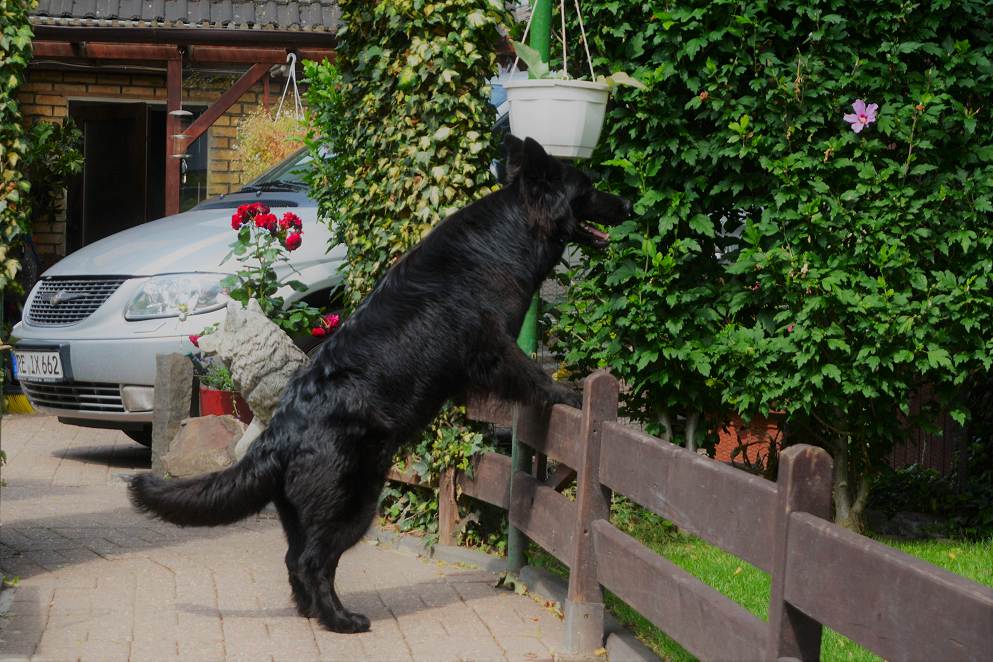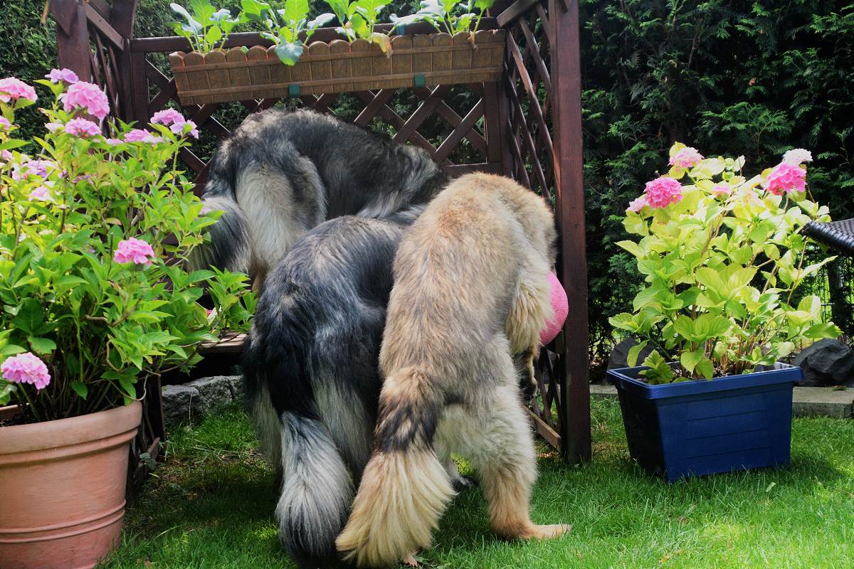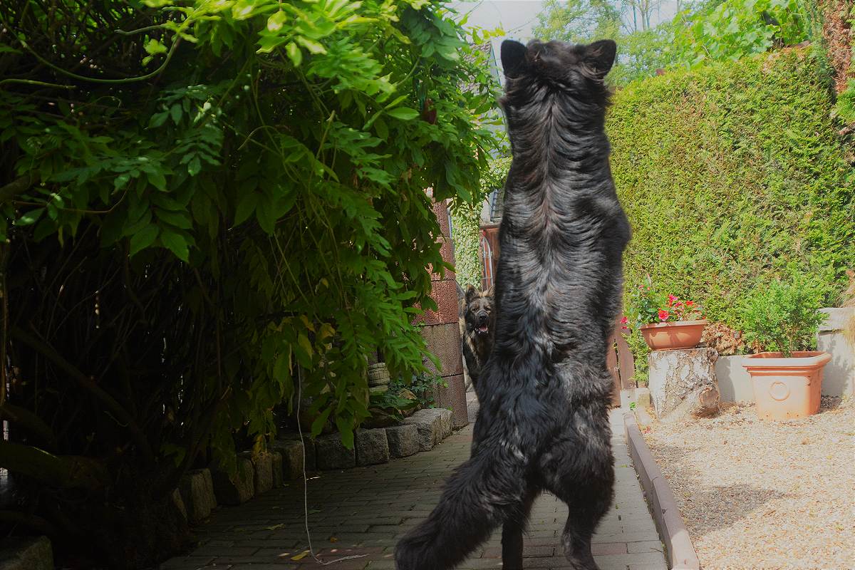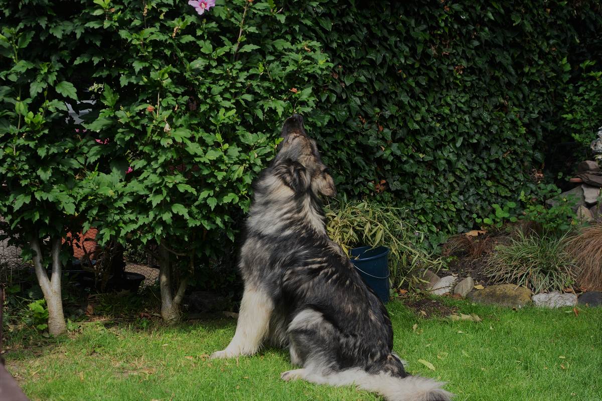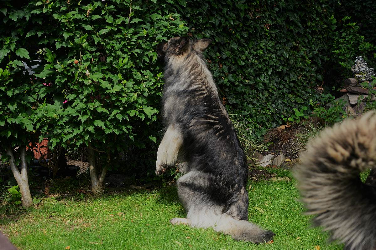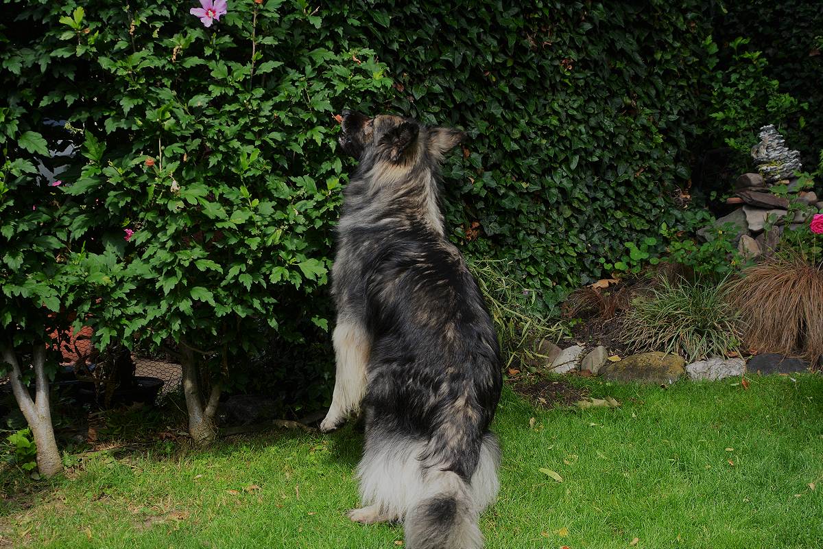 Ab und an machen wir uns einen Spaß daraus, im gesamten Garten alle möglichen Leckerchen zu verstecken. Alle Hunde müssen dafür ins Haus, und wir laufen mit 3 Mann umeinander und jeder glaubt die besten "Verstecke" zu kennen. Da hängen dann Frolic an Wäscheklammern, oder kleine Fleischstückchen an Bäumen. Genauso gibt es Leckerstangen unter Steinen versteckt, oder auf Autoreifen findet man auch was, wenn man nur angestrengt genug sucht. Sprich, egal ob oben oder unter, die Hunde müssen suchen, und haben einen unglaublichen Spaß. Keiner kann es erwarten, das das Spiel endlich losgeht. Es ist schon mehr als interessant zu sehen, das sich die Hunde zum Teil gegenseitig beobachten, sprich einer hat etwas entdeckt und die anderen.... versuchen es ebenfalls zu bekommen. Meist guckt dann der ehrliche Finder in die Röhre, er hat die Mühe und "knibbelt" das ""BobBon"", so nennen wir das Spiel, mühselig aus einer Wäscheklammer, es fällt zu Boden... und der der artig einfach nur wartet, und nichts getan hat, hebt es dann auf und schwupps ... weg... isses :-) Ist wie im richtigen Leben, der eine der sich abmüht und der andere der einfach aufhebt :-) Schaut und genießt den Sommer, er ist viel zu kurz wie ich finde.. und das ist ein Nachmittag im Garten...