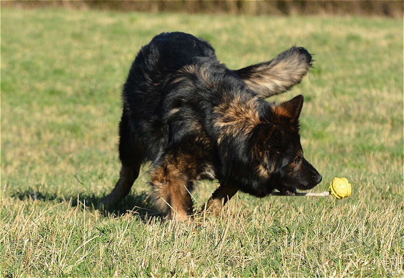 ![]() Sie apportiert jetzt recht ordentlich, vorher hat sie den Ball jahrelang ignoriert, aber inzwischen findet sie es erstrebenswert ihn tragen zu dürfen. |
