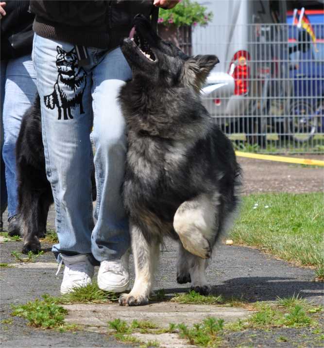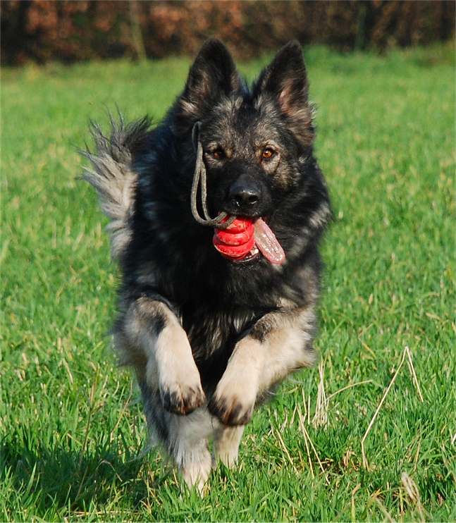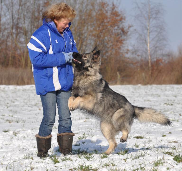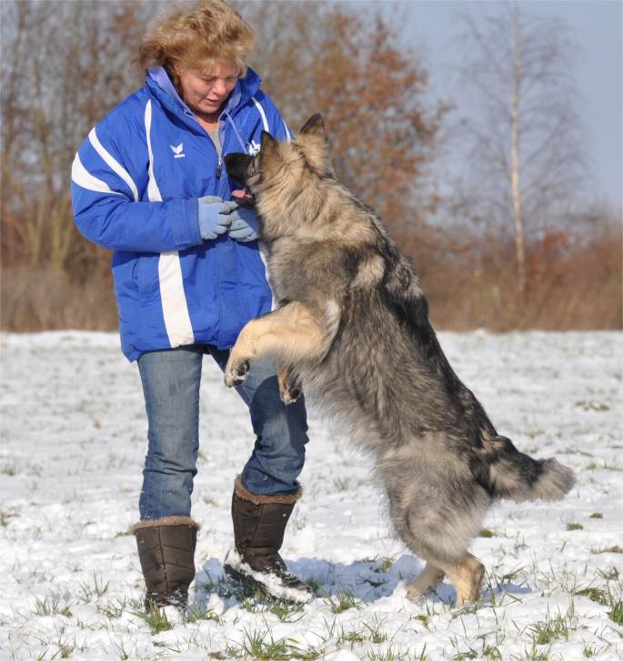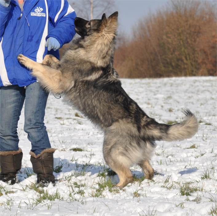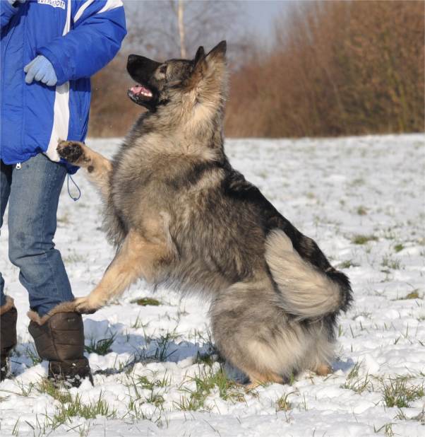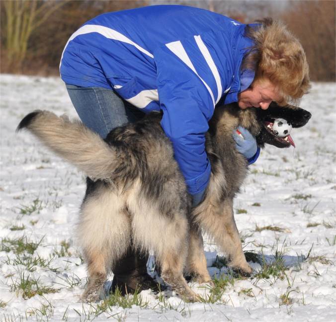 Lachen...Lachen.. Lachen... Ich habe nun Zeit gehabt, habe mit ihr gearbeitet (gespielt) und ihr Blödsinn beigebracht. Sie macht in Anlehnung an Dogdancing viele Kapriolen, sie will immer.... Mit Laetina arbeitet sie zusammen, leider geben diese Bilder das alles nicht wieder, ich sollte dazu mal ein Video machen, sie ist irre. Ich habe ihr gelehrt, das sie sich auf Handzeichen ´(hoffentlich synchron mit Laetina um sich selber drehen soll) Natürlich tut sie das... mit einer solchen Begeisterung, das sie mich regelmäßig von den Beinen haut... Erst den kopf in meine Beine rammen, beim Drehen versteht sich und dann unfairer Weise den Hintern eine 10tel Sekunde später vor dasselbe Bein.. Die blauen Flecke kann ich kaum noch zählen, die sie mir dabei verpasst hat, sie sitzt dann lachend vor mir und erwartet ihr Lob, ihr Bällchen und überhaupt will sie das ich mich mit ihr freue. Wir haben Bilder davon, aber ich weiß nicht, ob man das darauf erkennen kann?