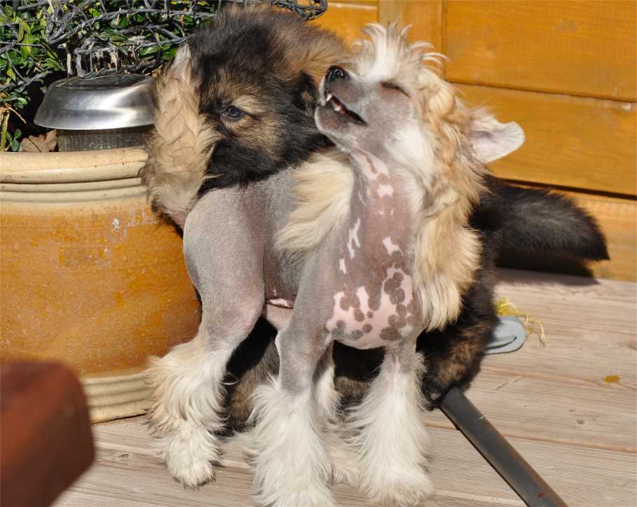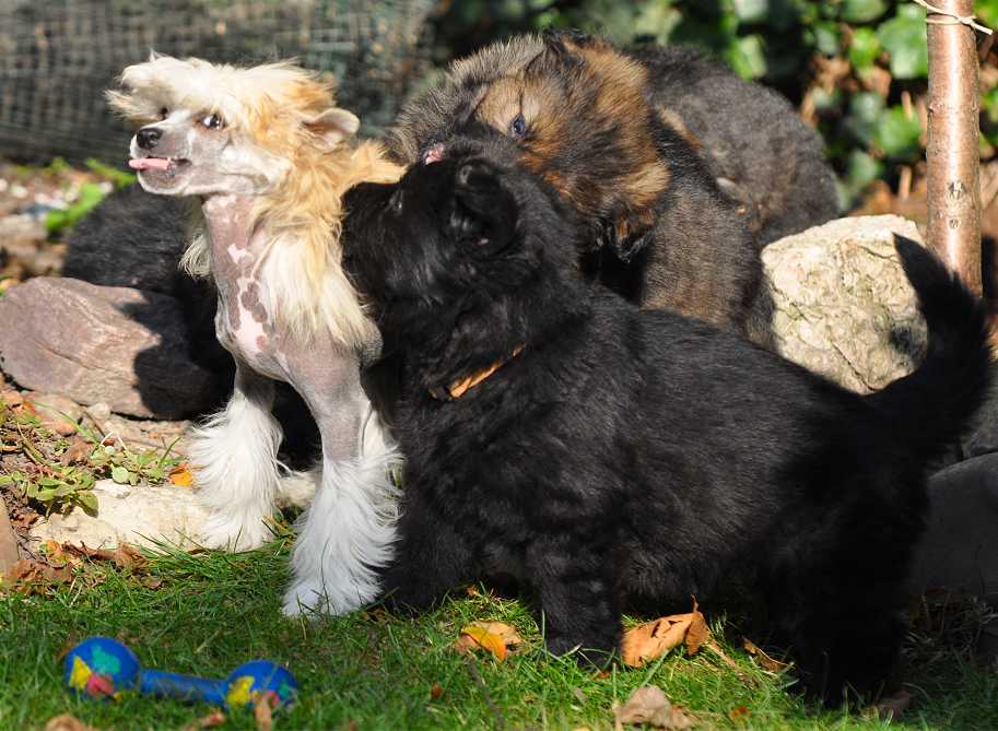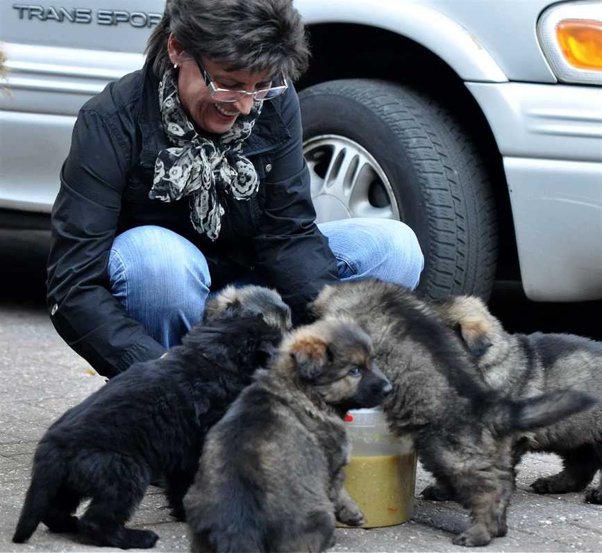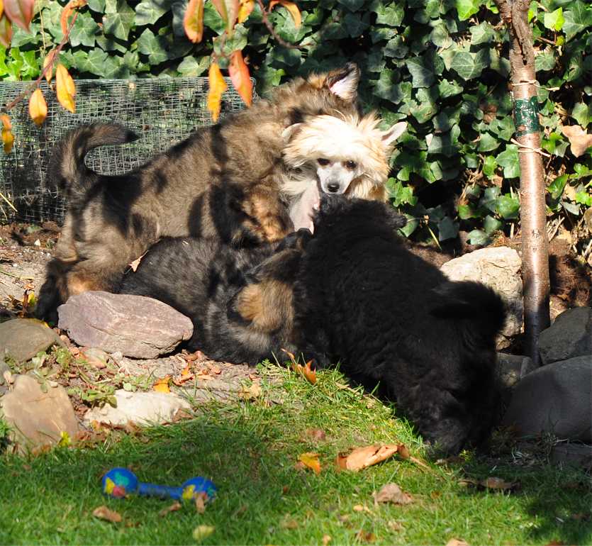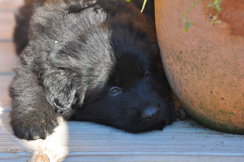 23.10. jetzt erst komme ich dazu die Bilder von den letzen Tagen zusammenzustellen. Die Kleinen sind super drauf, zerlegen meinen Garten nach allen Regeln der Kunst und ... kommen auf Fotos gar nicht wirklich rüber. Wir hatten natürlich viel Besuch. Die erklärten Publikumslieblinge haben sich im Status etwas verändert. Vorne mit dabei natürlich klein Azar. Der ist aber auch zu schön. Inzwischen ist er auch mein auserkorener Herzenshund. Azar hat einen Charme, dem kann sich kein Mensch entziehen. Er ist so unglaublich freundlich und gewand, er freut sich das er vor lauter Wedeln hintenrüber fällt und ist völlig angstfrei, auf den Arm kann man ihn gar nicht nehmen, er zappelt und macht und tut. Ihm doch egal wenn er fällt, der Mensch wird's schon richten!!! Fast jeder hat bestimmte Charaktereigenschaften die jetzt schon ziemlich genau zu erkennen sind. Das Wetter ist toll, und ich verbringe den gesamten Tag draußen bei den Kleinen, Spülen und Wäschewaschen ...alles wird zu erklärten Nebensache...schließlich..die Kleinen müssen raus :-) Wir haben auch viele Fotos, Einzelfotos, aber... jeder ist anders drauf, der eine oder andere hat nun wirklich keine Lust nett in die Kamera zu gucken und dann auch noch still zu sitzen, dem anderen macht es nichts. Also wieder einmal verschiedene Fotos auf der Suche die Kleinen so zu treffen das sie auch so dargestellt werden wie sie wirklich sind, aber.. es klappt immer weniger. Es gestaltet sich ungeheuer schwierig die Meute zum mitmachen zu bewegen, und der einzelne kommt da nicht richtig rüber. Sie haben unglaublich viel Fell, was sagt Mike wie er sie gesehen hat... Menno.. die sind doch schon ..fertig... Kann ich meinen jetzt nicht mitnehmen? Die Welpen sind jetzt erst 5 Wochen alt... aber ..schaut selber!