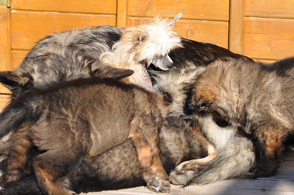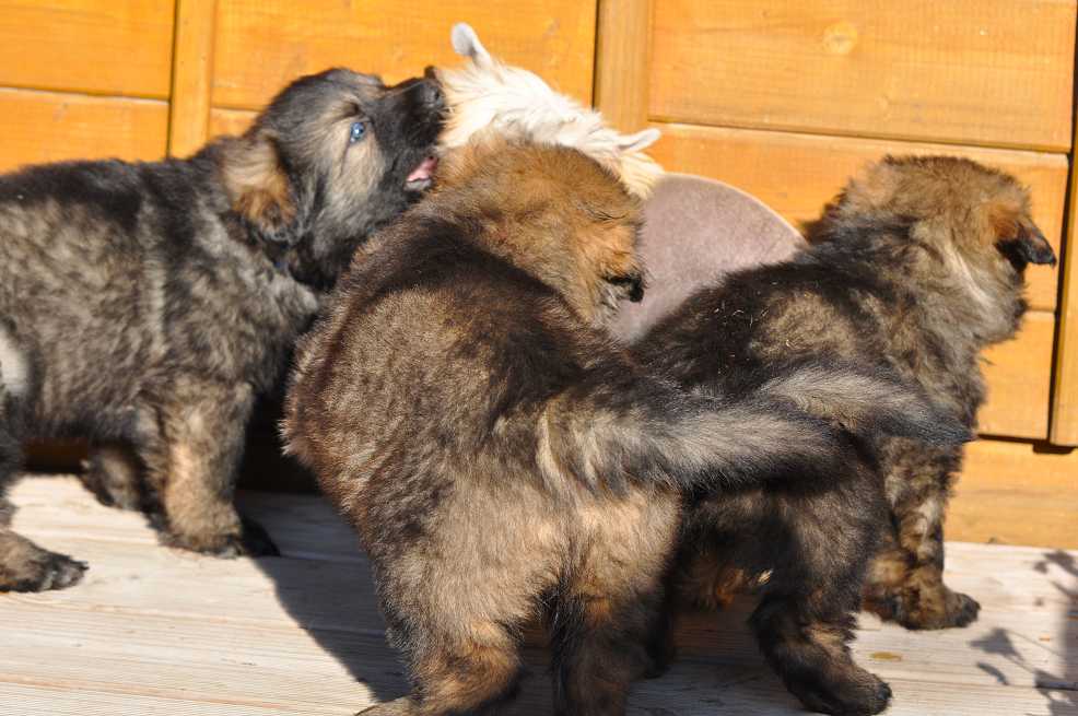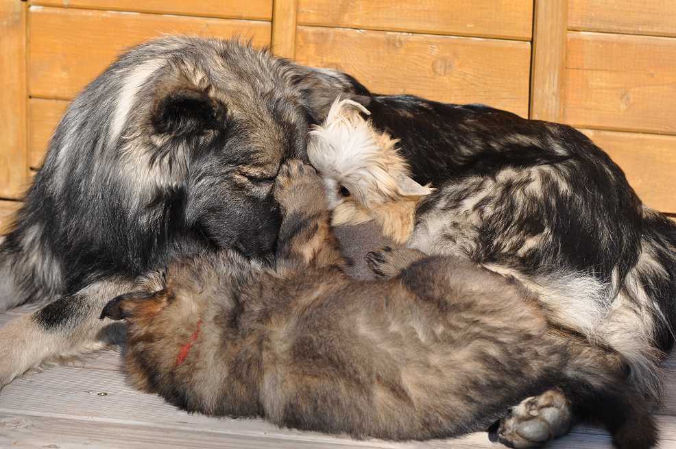 Alaska hat kein ganz leichtes Spiel mehr :-) So manches mal muss ich sie retten, weil... einer der Welpen hält sie an der Rute fest und ein anderer zerrt am Schopf.. raus... Raus kommt sie aus dieser Zwickmühle dann nicht mehr :-)