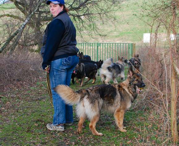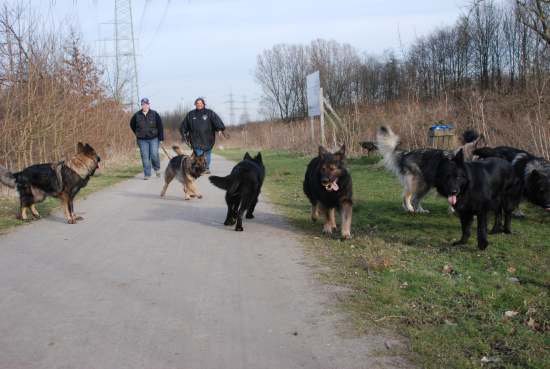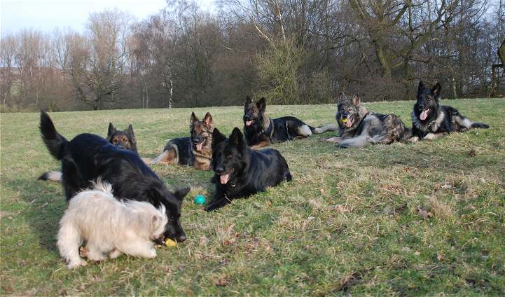 Nachdem man echt urlange von mir nichts Neues mehr gelesen hat, konnte ich es beruflich einrichten, mal nicht nur bei Karin nen schnellen Kaffee zu trinken, sondern auch mal wieder mit ihr und den ganzen Hunden spazieren zu gehen. Gedacht, getan, der Termin stand, datt Wetter spielte mit, ich also meine Hunde ins Auto gepackt, nach Karin gefahren, dort noch nen Kaffee getrunken, zwischendurch bei Sandra angerufen und nachgefragt, ob sie nicht auch Lust hätte mit uns mitzukommen. Sandra fand die Idee prima und schlug gleich den Wald bei ihr quasi umme Ecke vor (sie meinte, das dort selten Leute seien und man toll dort gehen könnte), ich sag nur: „ja ja ja….“ abba, mehr dazu später…. Karin ihre Hunde also inne Boxen ins Auto verteilt, Hoftor auf, Auto raus, und ich im Schlepptau mit meinem Auto hintendran, muss ich hier erwähnen, datt Karin nen unmöglichen Fahrstil hat, ich glaub nich, oder? Hatte es ja schon bei der ein oder anderen Fahrt erwähnt…..sie blinkt im letzten Moment, wenn überhaupt, ne Ampel kriegt man noch bei gelb mit, wenn man von jetzt auf gleich kräftig beschleunigt…. Ich also unter einiger Missachtung der Verkehrsregeln hinter ihr her, einmal, kannte ich den Weg ja nich und zum zweiten, wollte ich auch net den Anschluss verpassen! Wir kamen an dem vereinbarten Treffpunkt an, es standen da zwar paar Autos rum, aber weit und breit keene Spur von uns Sandra! Karin nahm datt Handy zur Hand und rief bei Sandra an, niemand ging ran, wir warteten und warteten, nix, Karin betrieb bei Sandra Telefonterror und versuchte sie zu erreichen, Sandra ging beharrlich nich dran. Gerade als wir uns entschlossen haben ohne sie zu gehen, kam Sandra angebraust, bremste und Karin und ich standen in einer Staubwolke! Und dabei sagt man doch immer, frische Luft is so gesund! Auch die, die mit Staub versetzt is? *denk* Da Sandra nu da war, meinte Karin, datt wir ja jetzt losgehen könnten, sie öffnete nacheinander die Türen vonne Boxen und die Meute sprang raus, hab ich schon gesagt, datt ich fast nen Jahr so mit Karin und den Hunden nich mehr zusammen spazieren war? Wie reagiert Snake auf Wotan? Beides sind ja nun mal gestandene Rüden, aber, meine Bedenken waren unbegründet, die beiden beschnupperten sich und wir konnten losgehen….. Datt heisst, wir trieben mit insgesamt 7,5 altdeutschen (der halbe war Karin´s Laetina) einen Opa mit Fahrrad vor uns her, der arme Opi konnte gar nich so schnell trampeln…. watt nu abba nich heisst, datt wir ihn absichtlich gejagt haben, nöööööööö, haben wir nich, der fuhr leider auf demselben Weg, den wir auch nehmen wollten. Karin schmiss einen Ball in die entgegensetze Richtung, datt ganze Rudel hinter dem Ball hinterher, der Opi suchte sein Heil in der Flucht und versteckte sich (so sah es zumindest für uns aus) im Gebüsch und wartete bis wir an ihm vorbeizogen. Schätze mal, es is echt für Außenstehende beeindruckend, wenn so ne große Hundegruppe von nur 3 Leuten angeführt wird! Wir fallen ja nich nur wegen der Hunde auf, sondern bestimmt auch wegen des Lärms, der durch datt Gebell entsteht…..
