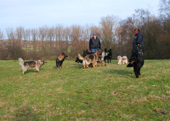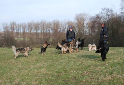 Auf dieser Wiese wurde auch ne Pause gemacht, Karin hatte ihre Kamera mit und wollte Bilder vonne Hunde schießen, so mussten Sandra und ich versuchen, die Hunde zusammenzuhalten, jeder sollte schön inne Kamera gucken. Tja, irgendwie klappte datt nich so ganz, wenn wir glaubten, datt sie jetzt alle liegen, stand der erste wieder auf, und trabte durch´s Bild, datt ganze also noch mal von vorne. Geschätzte Stunden später hatten wir es dann mal ganz kurz geschafft…..