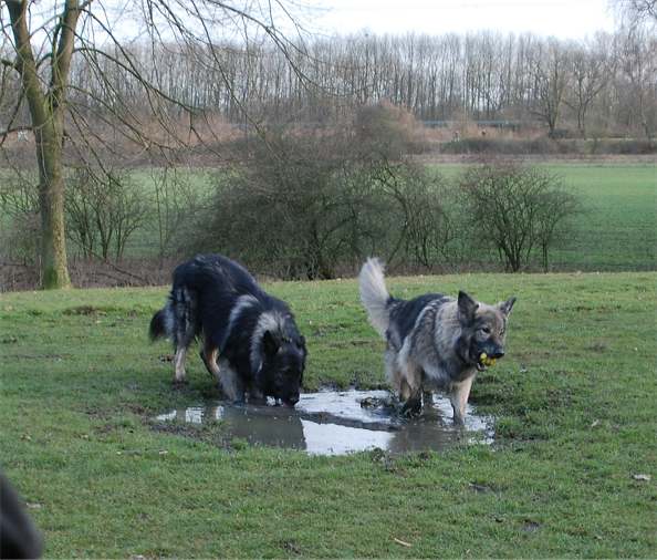 Unterwegs machte Sandra uns ja immer auf datt ein oder andere Hindernis aufmerksam, einmal meinte sie nen Reh zu sehen, wir die Hunde zu uns gerufen, Ball in andere Richtung geworfen und datt vermeintliche Reh entpuppte sich als Gebüsch….einen Verlust hatten wir auch zu vermelden, Dakota oder Bengasha verloren einen Ball, dieser verschwand unauffindbar in den weiten des Waldes oder in der kleinen Pfütze, die die Hunde leer gesoffen haben…Aber, wir fanden auch einen Ball, auf einer großen Wiese, den Sandra und Karin eine Woche vorher dort verloren hatten! Auf eben dieser Wiese rasten die Hunde nach den Bällen, und wie der Zufall es will, war dort eine kleine Matschpfütze! Alle Hunde sprangen beim Rennen über diese Pfütze, nur meine beiden, die standen mittendrin und holten sich dreckige Füsse! Karin und Sandra lachten mich aus, wo ich meinte, datt meine Wohnung geputzt wäre, und ich brüllte, datt die Hunde da rausgehen sollten….ok, wer Hunde hat, putzt eh jeden Tag, ich hatte Sonntag einiges zu fegen und mit dem Dreck, den ich zusammengekehrt hab, konnte ich doch glatt ne Blume umtopfen ;o) Hey, es is schlimm, wenn 6 Hunde über die Pfütze springen und zwei mitten rein, datt is soooooooooooooo ungerecht, hätte nich auch Laetina da rein hüppen können, sonst sieht sie ja auch meist aus, wie ne Matschkugel *denk* und ausserdem, kann man Laetina viel viel besser inne Wanne stecken, als nen Altdeutschen!
