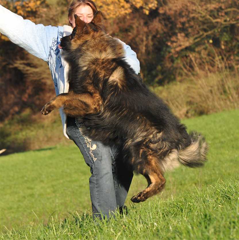 Sieht das gefährlich aus :-) Er springt nicht nach Heike, sondern zu dem Ball den sie in der Hand hochhält