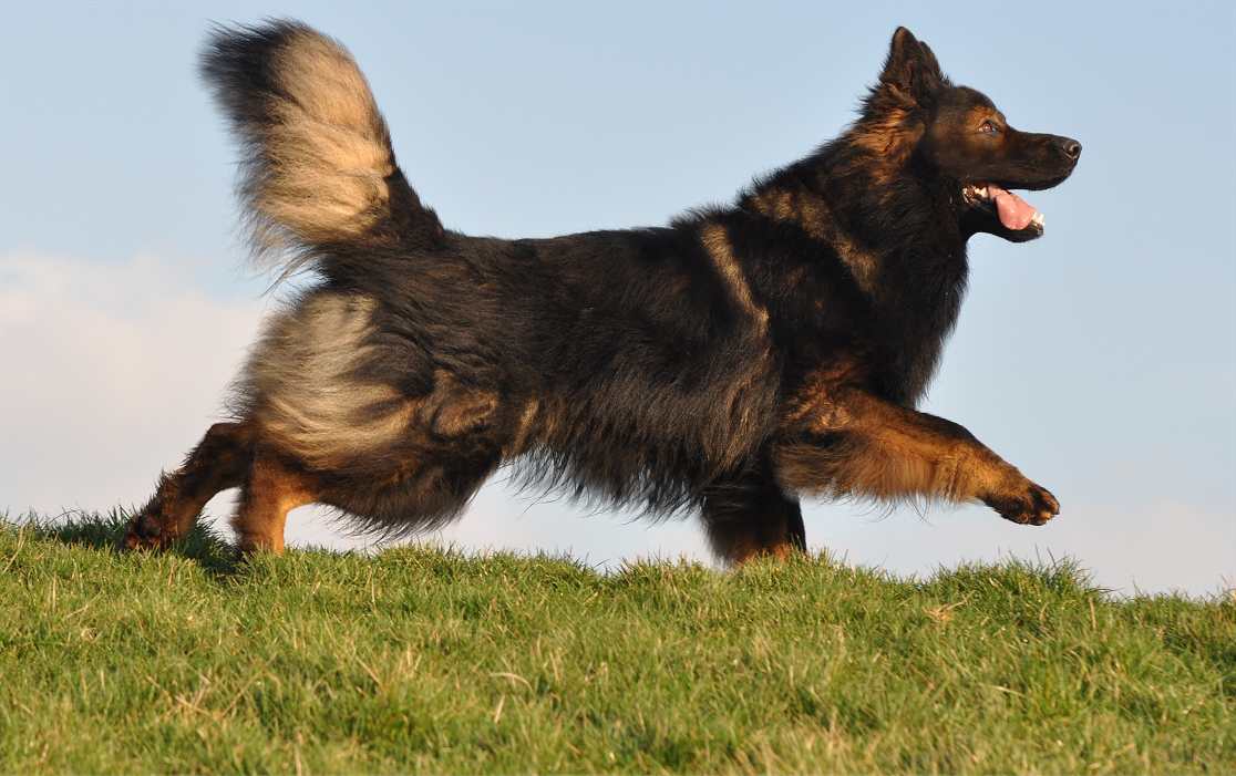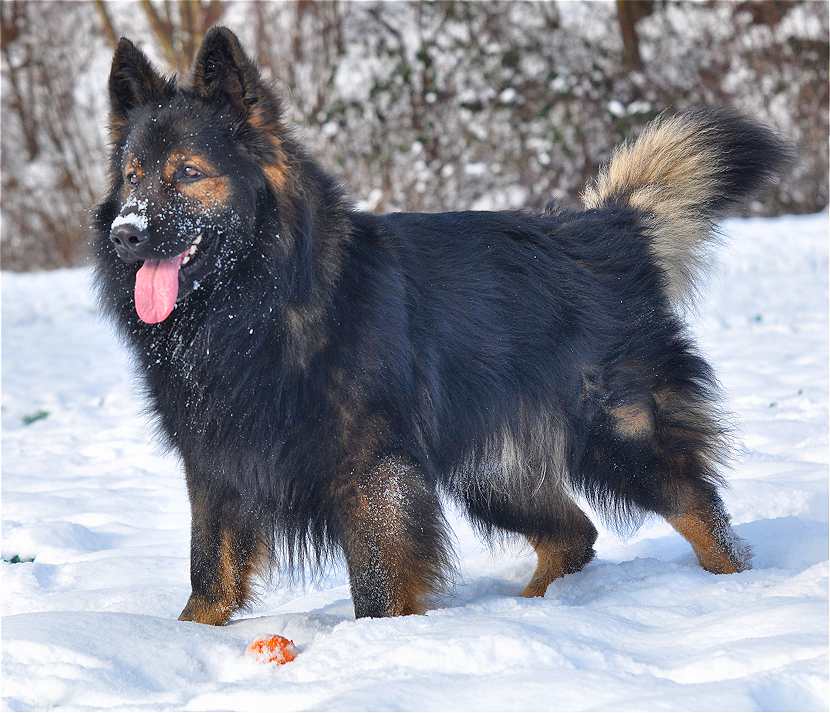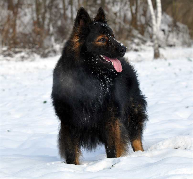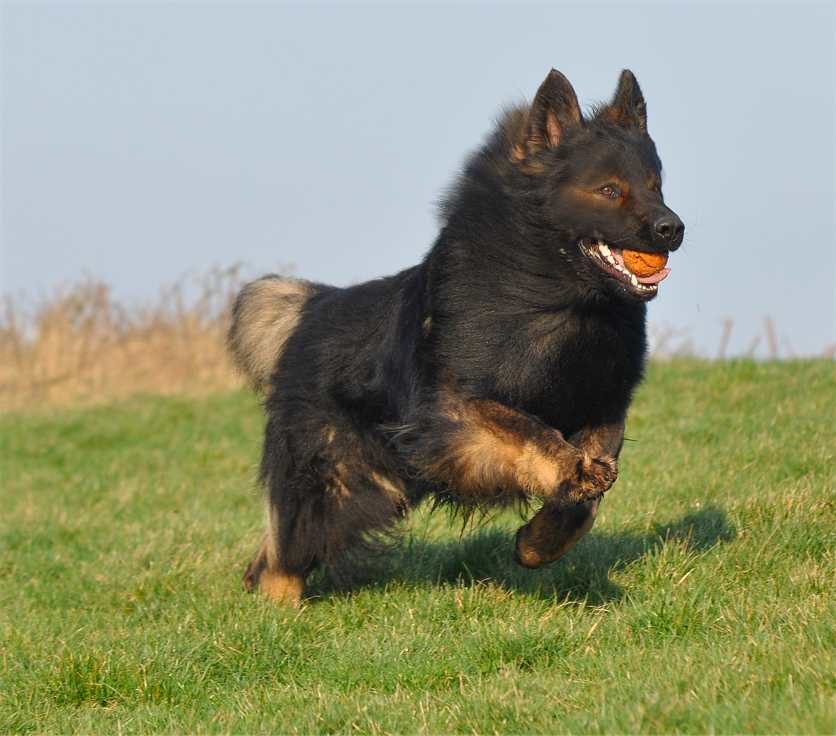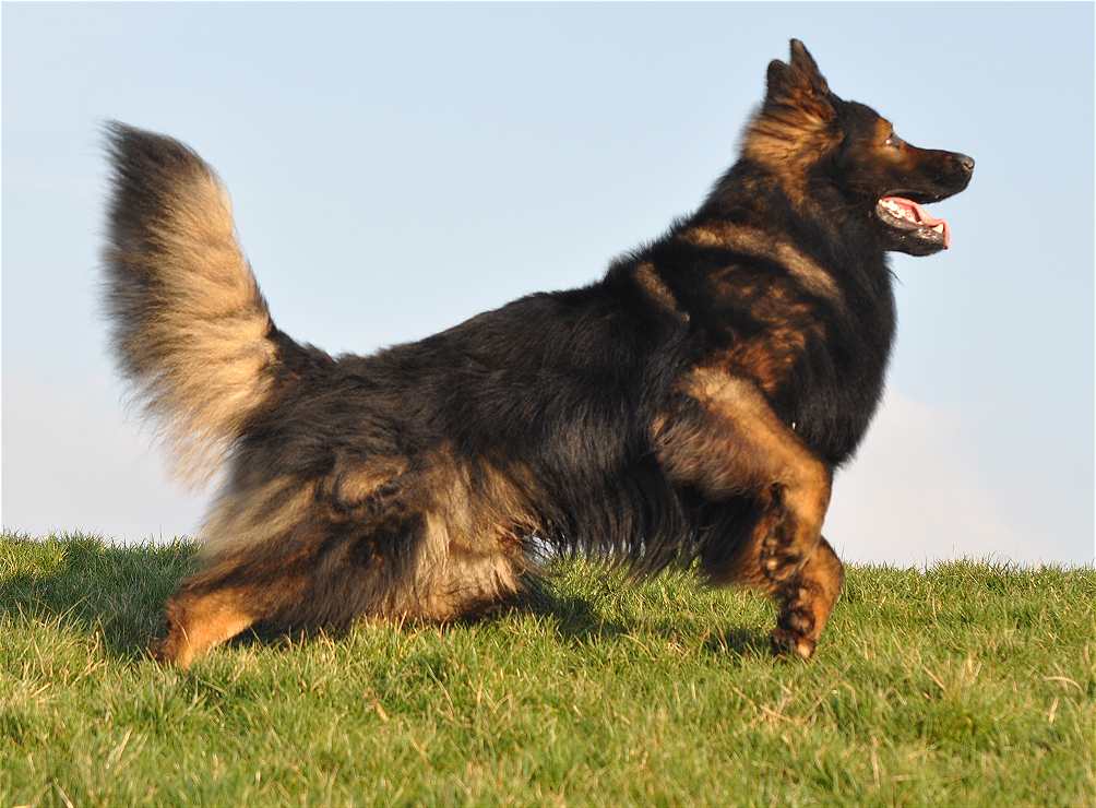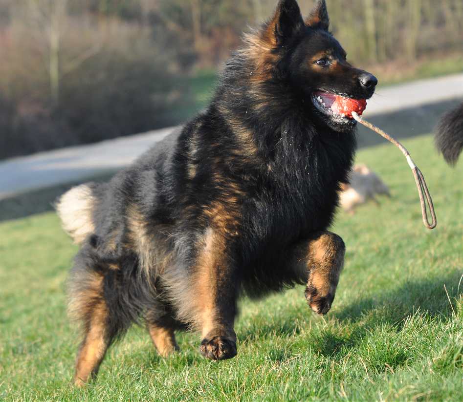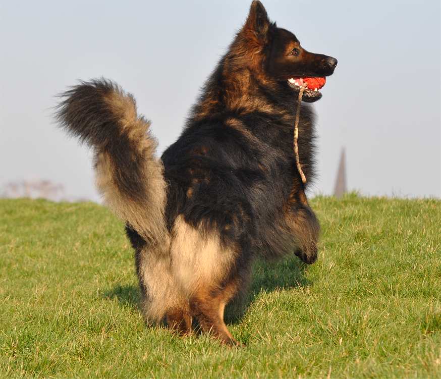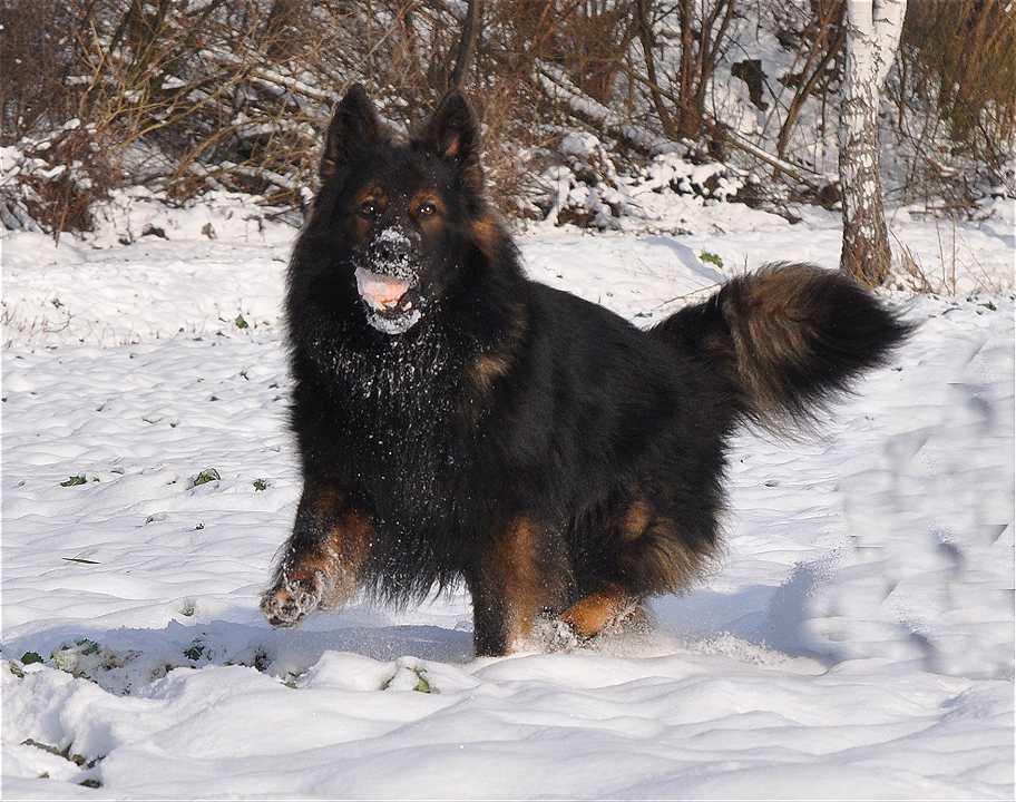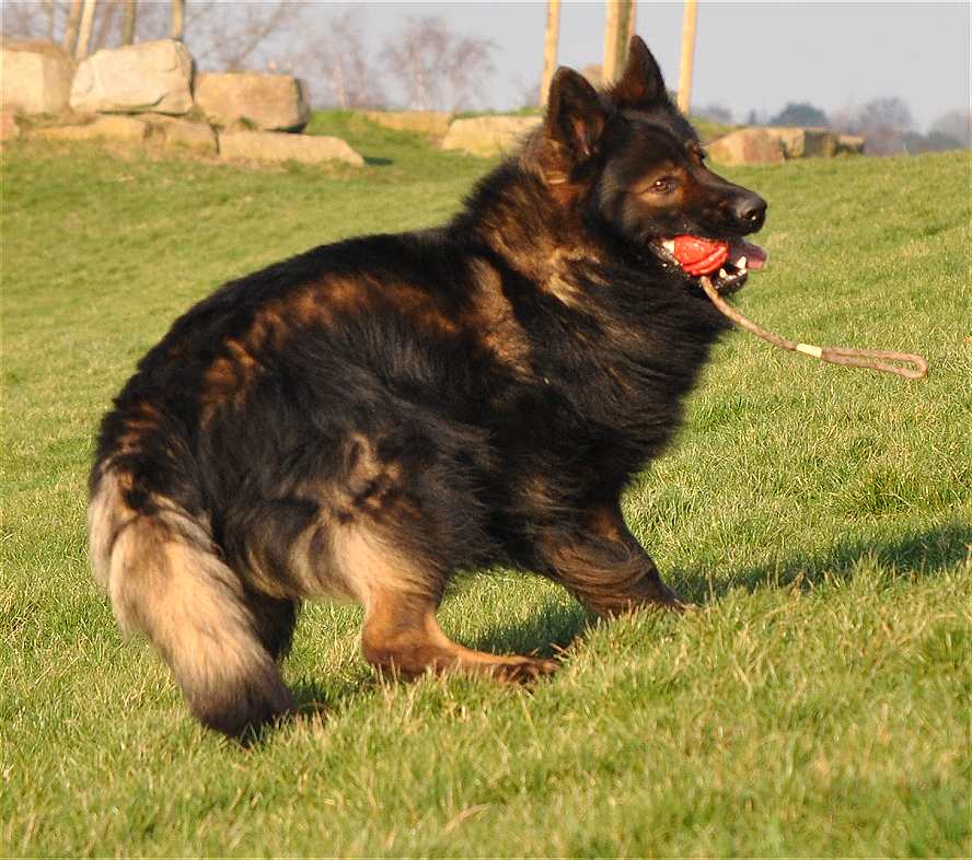 Sein Gangwerk ist so ausgreifend, das er mühelos und richtig federnd kilometerweit neben dem Fahrrad herlaufen kann und es auch sehr gerne tut. Dazu kommt, das dieser Hund alles für mich tun würde, und das immer mit Freude und Begeisterung im Gesicht. Seine Nachzucht, zumindest die die ich gesehen habe, denen vererbt er Fell ohne Ende, und auch seine Farbe sowie Festigkeit und Straffheit. Dazu ist er nicht lang im Rücken auch das vererbt er. Bisher hat er sein Wesen nicht vererbt, da ist ja auch die Hündin noch ganz maßgeblich dran beteiligt. Aber seine Vorzüge, die sieht man in jedem seiner Nachkommen.