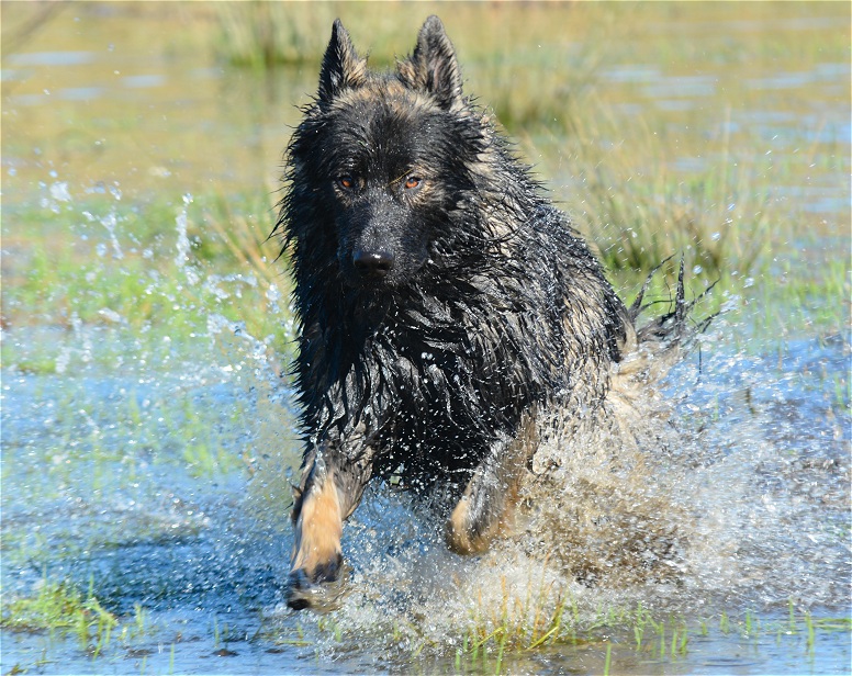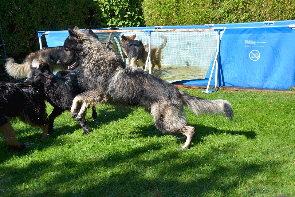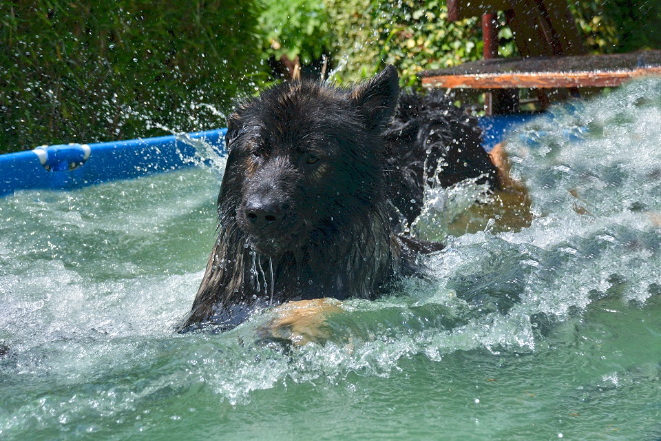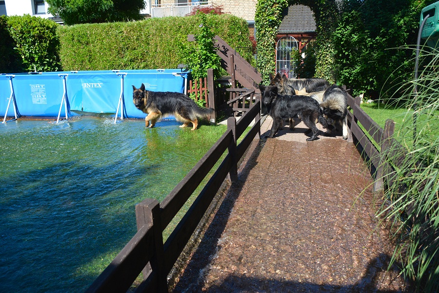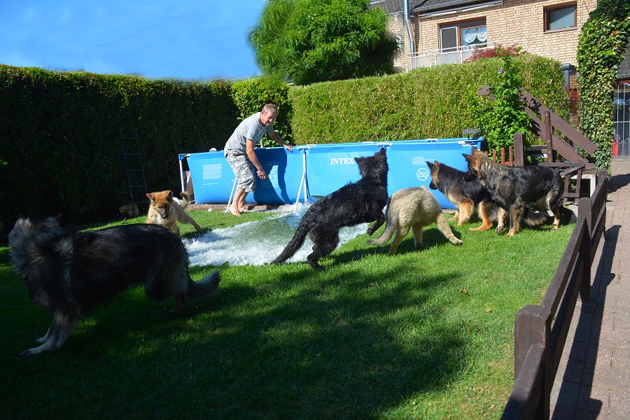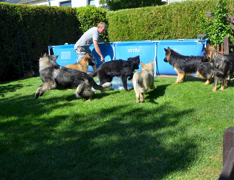 megaheiße Tage oder die Hunde haben zusammen beschlossen wir brauchen kein Pullover, ein "Top" reicht völlig? Keine Ahnung, aber alle haben nun ihre Jacke ausgezogen, so nackige Schäferhunde hatte ich wirklich noch in keinem Sommer. Jay sieht aus wie komplett kurzhaarig, Die anderen haben hier und da noch ein paar längere Strippen hängen und sehen ansonsten irgendwie Mottenzerfressen aus.? Wasser ist das Gebot des Tages und der neue Pool ist schon zuhauf eingeweiht. Diego ist optisch wirklich ein richtig schöne Hund geworden. Er ist noch sehr jung und ich bin wirklich sehr gespannt wie er sich weiterentwickelt. Er wiegt jetzt bereits 47 Kilo. Ist dabei nicht übermäßig groß, aber sehr kraft und gehaltvoll. Er ist Gewichts und größenmäßig mehr als sein Vater Nazar. Nur Haare ... die haben sie zur Zeit alle nicht! Dafür Spaß .....und das ganze Jungvolk tobt ausgelassen durch den Garten. |