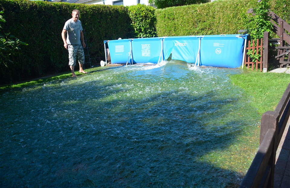 ![]() Klatschnass und zur Pause gezwungen .... Und dann das große Finale......der alte Pool, ziemlich zerzaust und qualitativ nicht mehr so ganz frisch....sollte er nun ein würdiges Ende bekommen. Als das Wasser dreckig genug war, wollte Herbert die Hunde "FLUTEN"!! Wir haben uns also mit Kamera und Handy postiert um das große Ereignis ja nicht zu verpassen. Herbert also ... bewaffnet mit einem langen Messer... schleicht sich an den Pool an.. In der Hoffnung auf tolle Fotos ...wenn das Wasser da rausschießt waren wir voller Erwartung...... |