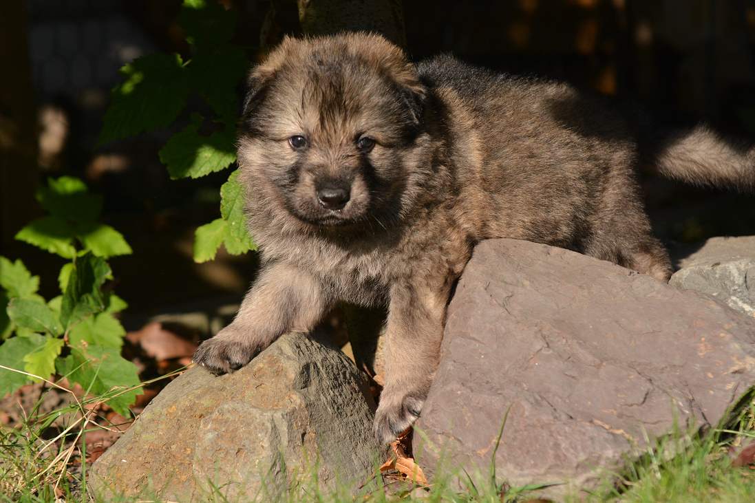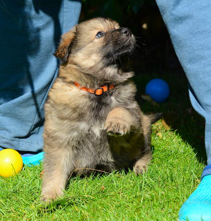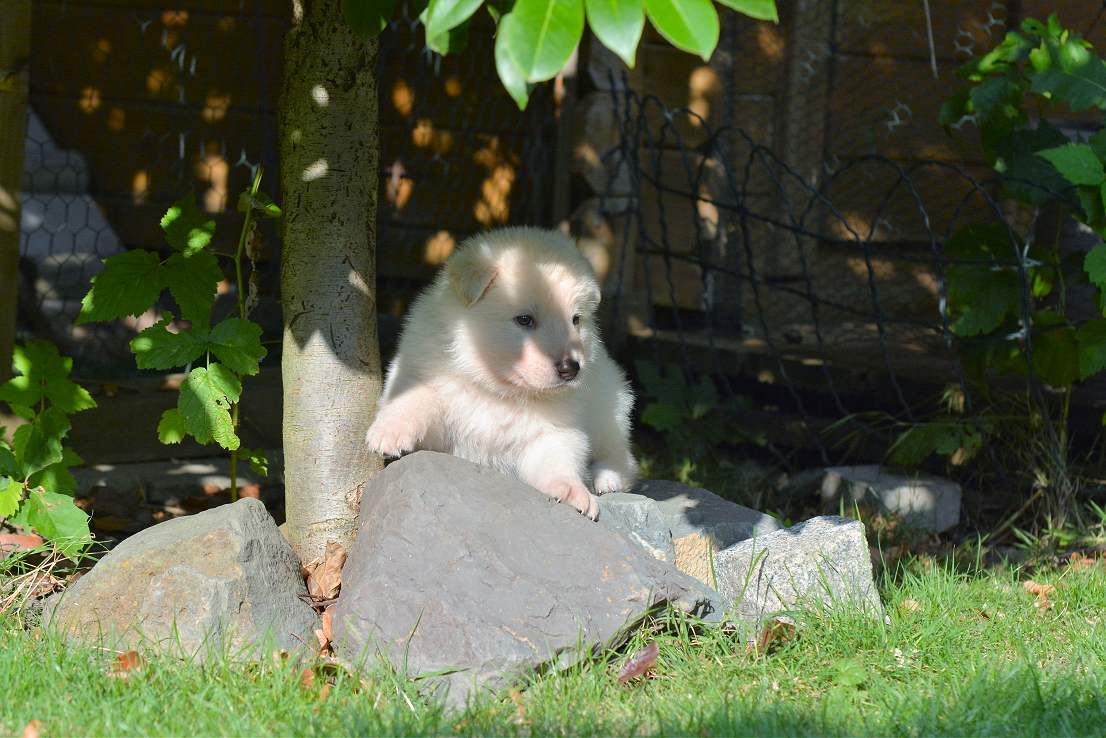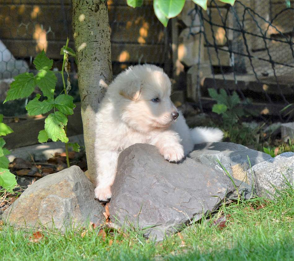 Inzwischen ist .. Schwarz.. meiner Meinung nach, der beste vom Verhalten von der gesamten 11er Bande Er ist komplett offen, freundlich, total neugierig und macht sich vor nix inne Buxe. Man kann ihn in neue und unbekannte Situationen bringen... Schwarz ist easy und erkundet das "Neue", wo seine Brüder und Schwestern erst mal den Rückwärtsgag einlegen, da bleibt er völlig gelassen ! Tja so kann sich das Blatt auch wenden! Schwarz, eindeutig ein Hund der abschätzt, Situationen einordnen kann und schon jetzt zeigt das er später ein wirklich guter Kumpel sein wird! Schwarz.... mit richtigem Namen Snow Storm Aragon :-)