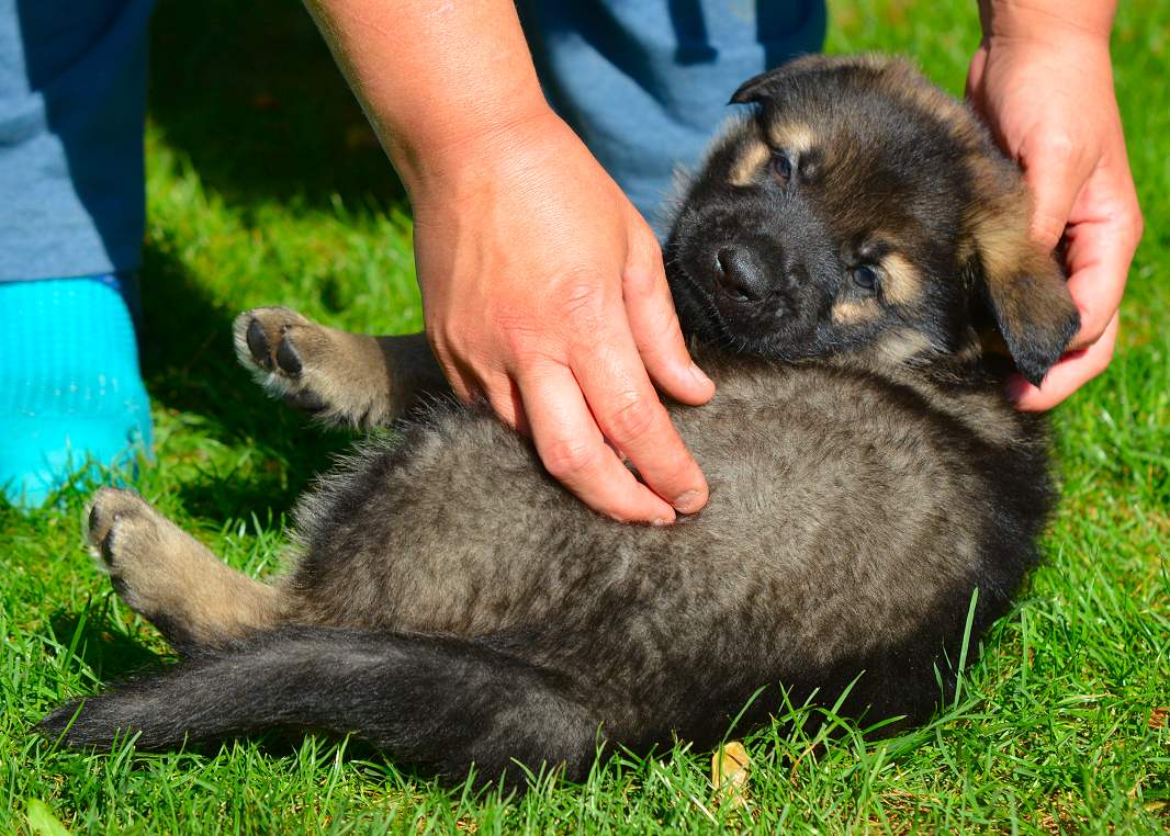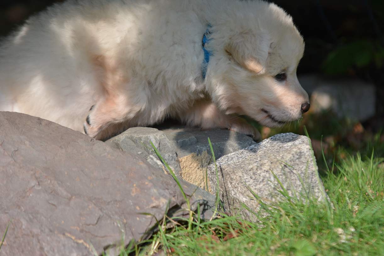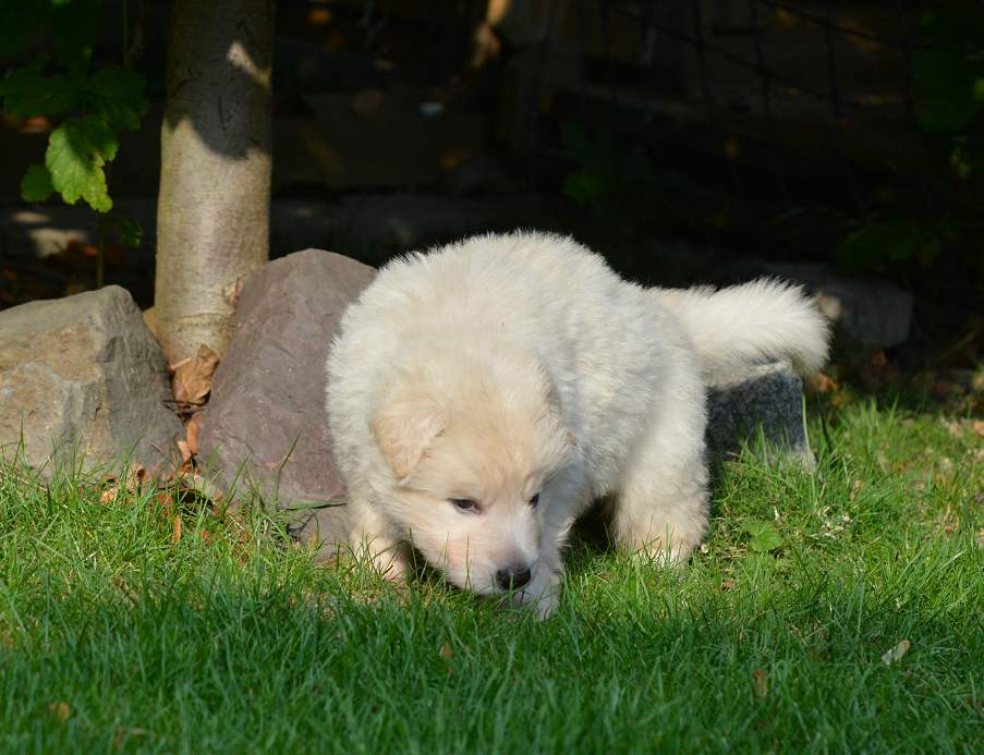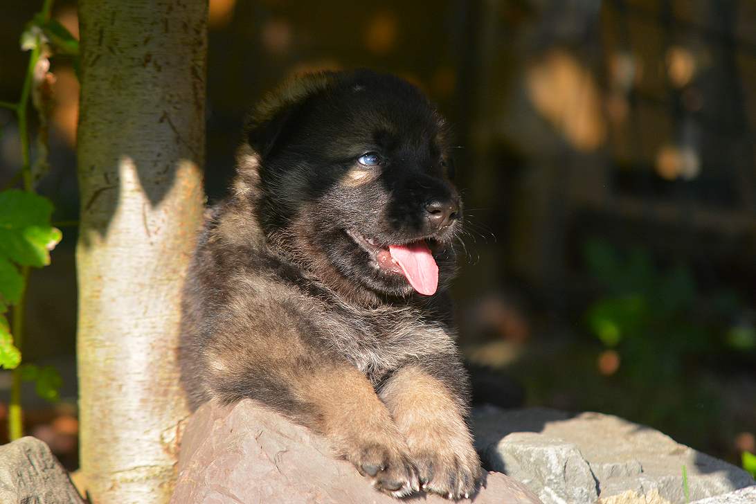 Inzwischen ist .. Schwarz.. meiner Meinung nach, der beste vom Verhalten von der gesamten 11er Bande Er ist komplett offen, freundlich, total neugierig und macht sich vor nix inne Buxe. Man kann ihn in neue und unbekannte Situationen bringen... Schwarz ist easy und erkundet das "Neue", wo seine Brüder und Schwestern erst mal den Rückwärtsgag einlegen, da bleibt er völlig gelassen ! Tja so kann sich das Blatt auch wenden! Schwarz, eindeutig ein Hund der abschätzt, Situationen einordnen kann und schon jetzt zeigt das er später ein wirklich guter Kumpel sein wird! Schwarz.... mit richtigem Namen Snow Storm Aragon :-)