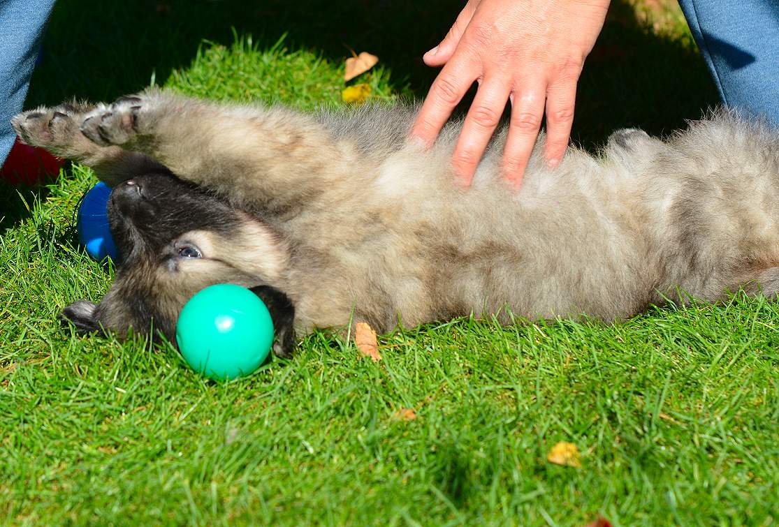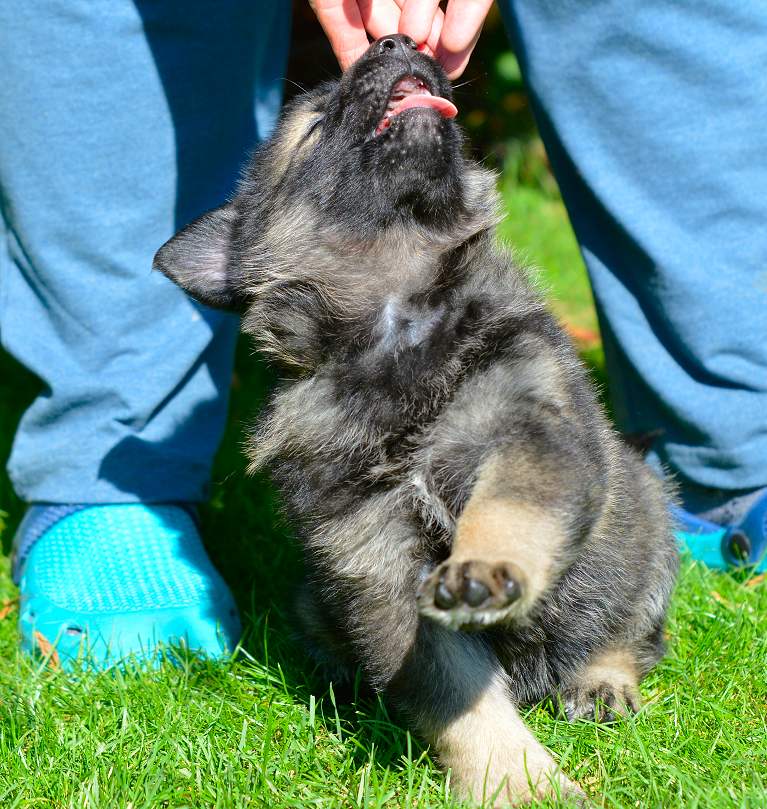 Ohne... übrigens mit richtigem Namen... San Diego Lord.. ist mit Abstand einer der Welpen die man Herzensbrecher nennt, aber .. Ohne .. ist auch ein Biest, inzwischen längst nicht mehr so hilflos, verhaut er auch mal gerne seine Schwestern, und man muss ihn aus den Haaren von Sandra ziehen. Füße beißen und vergessen das Zehen darunter sind, gehören bei ihm zum Standartprogramm. Ich sage dazu ..er testet, mental ist er ganz schön stark, die anderen sagen, ach.. er ist noch klein. Ja nee... is klar!!! Ohne .. eben!