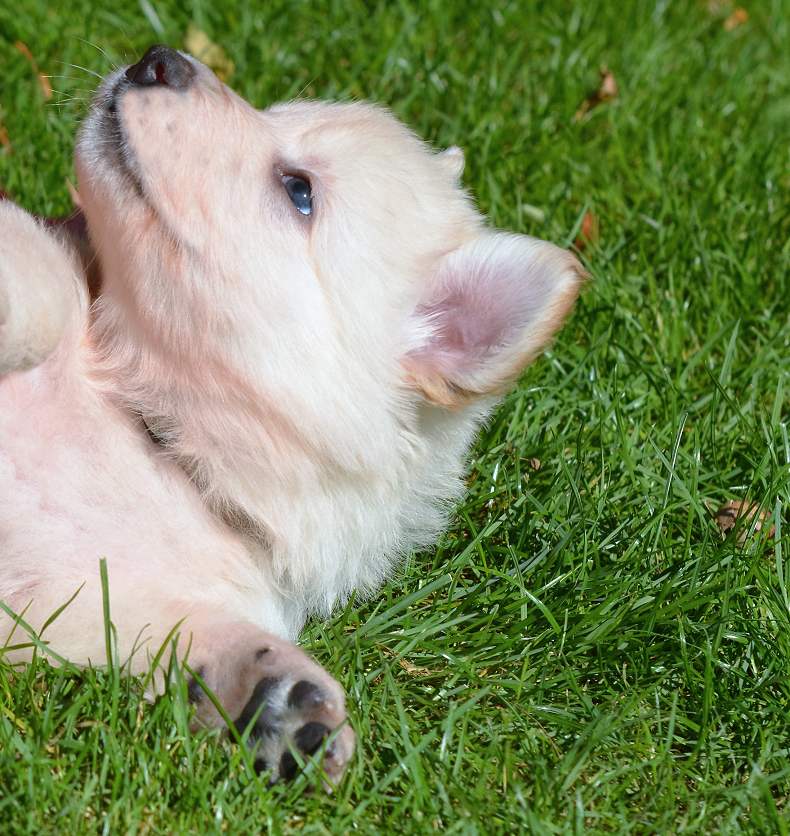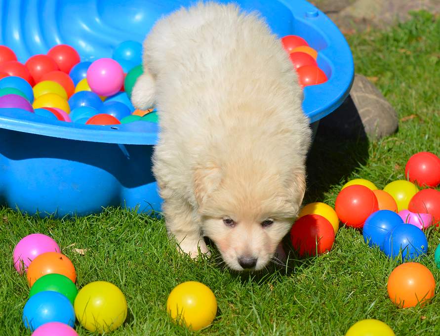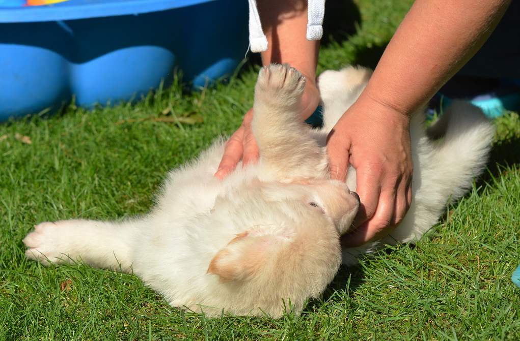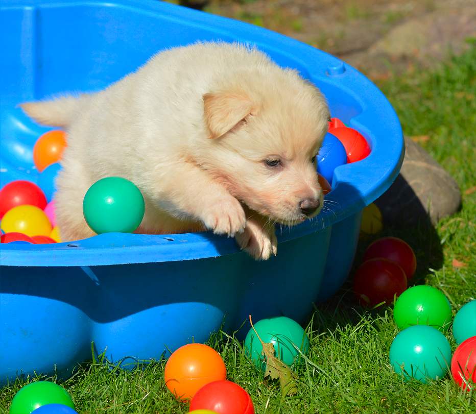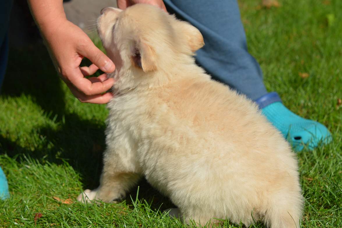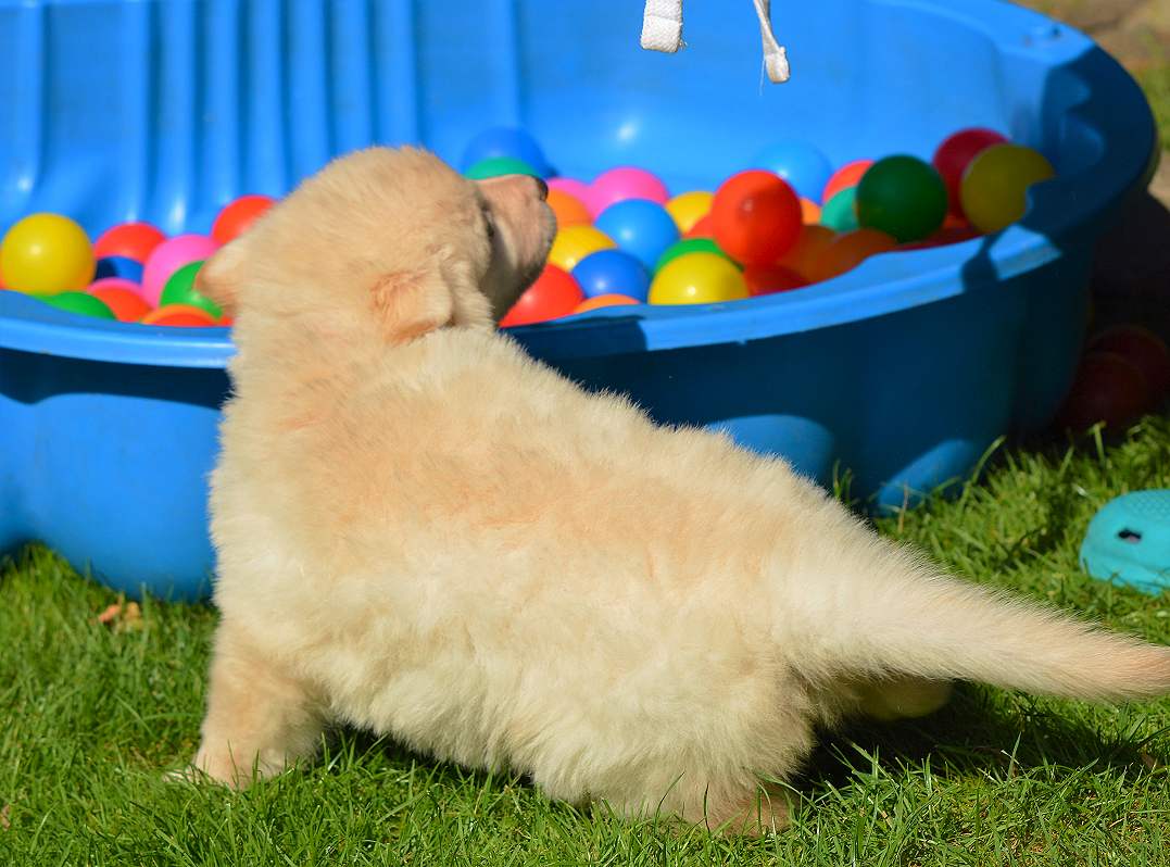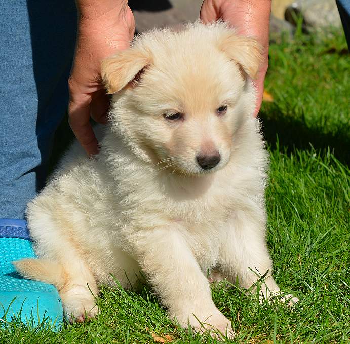 Lustig finde ich das fast immer die Namen die wir vergeben passend zu den Hunden sind. Summer Dream ist tatsächlich die so ziemlich gelbste Hündin im Wurf.. Summer eben.. wie der Sommer.. .-)