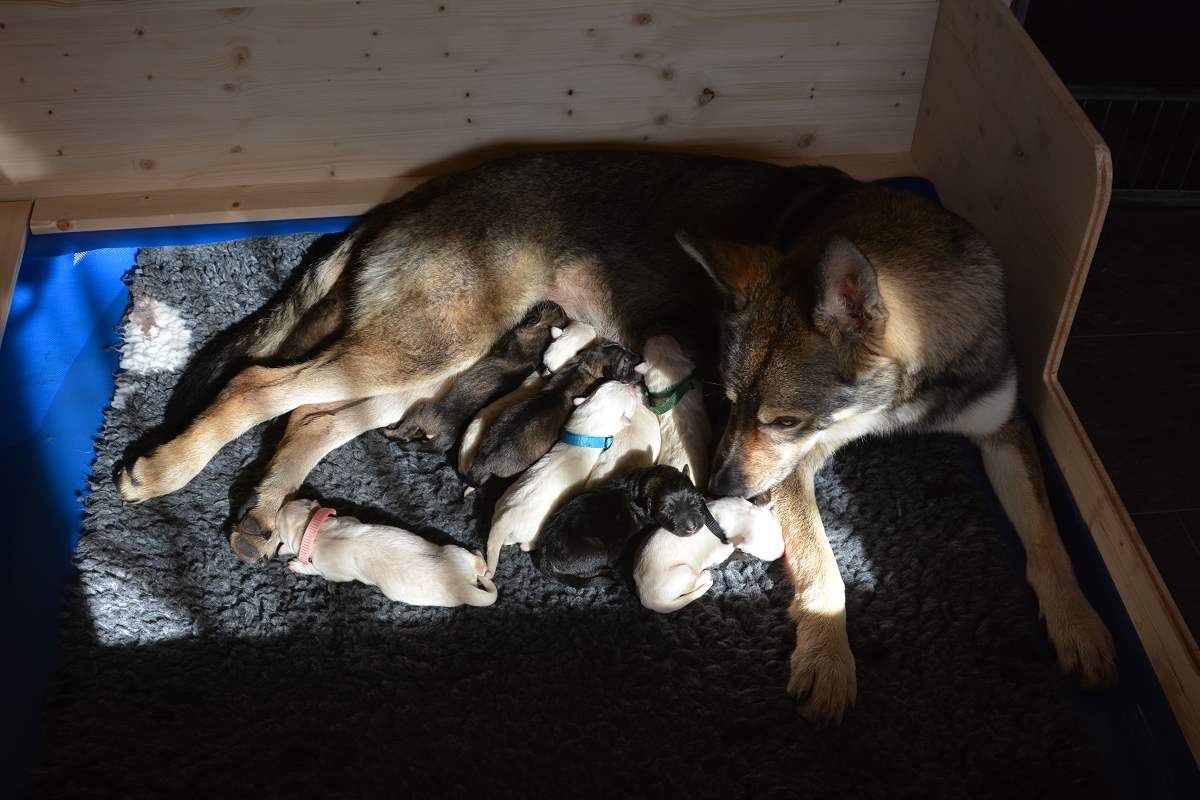 Irgendwie haben sich die ganzen Halsbandfarben für uns als "Namen erwiesen. Bei uns heißt es nur.. Grün...hat schwarz umgeschmissen. .Hellblau... hat heute mehr gefressen als gestern. Rosa... war wieder sehr laut... Und so weiter... Also.. bitte nicht wundern, wir kommen da irgendwie nicht von weg. Wir führen von jedem einzelnen Welpen Buch, und auch in diesem stehen die Halsbandfarben und nicht die Namen der 11er