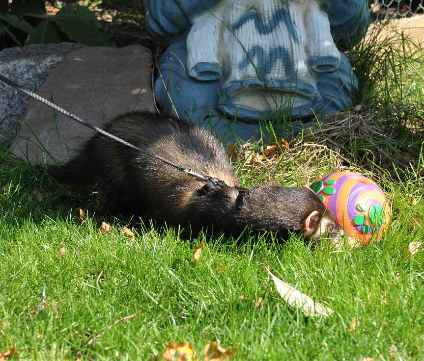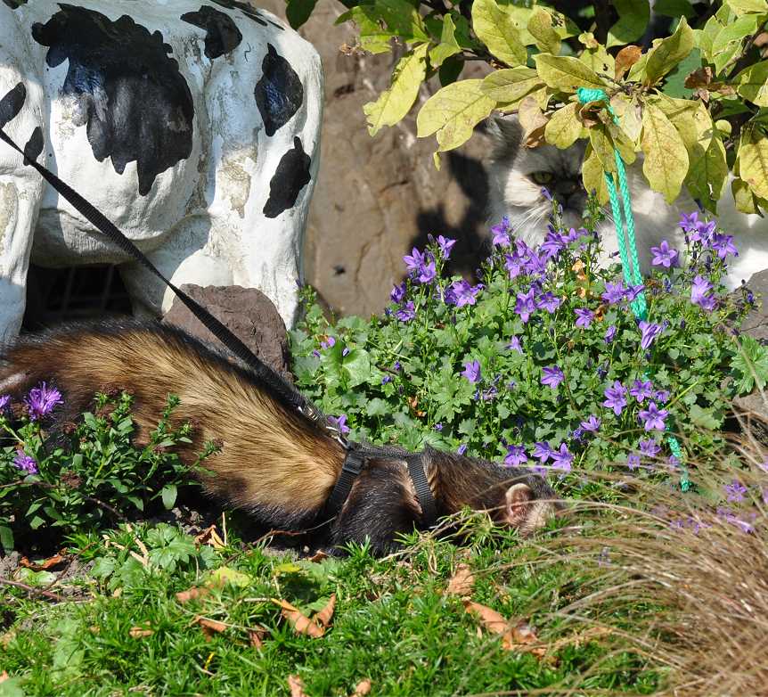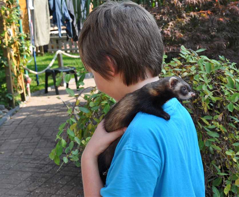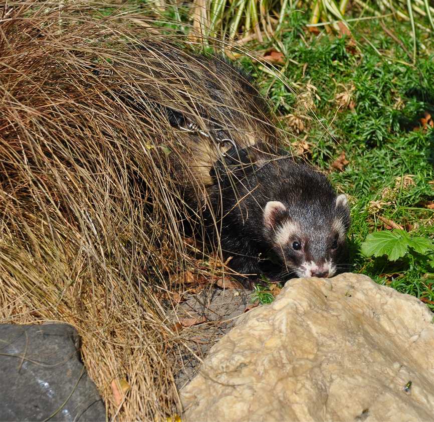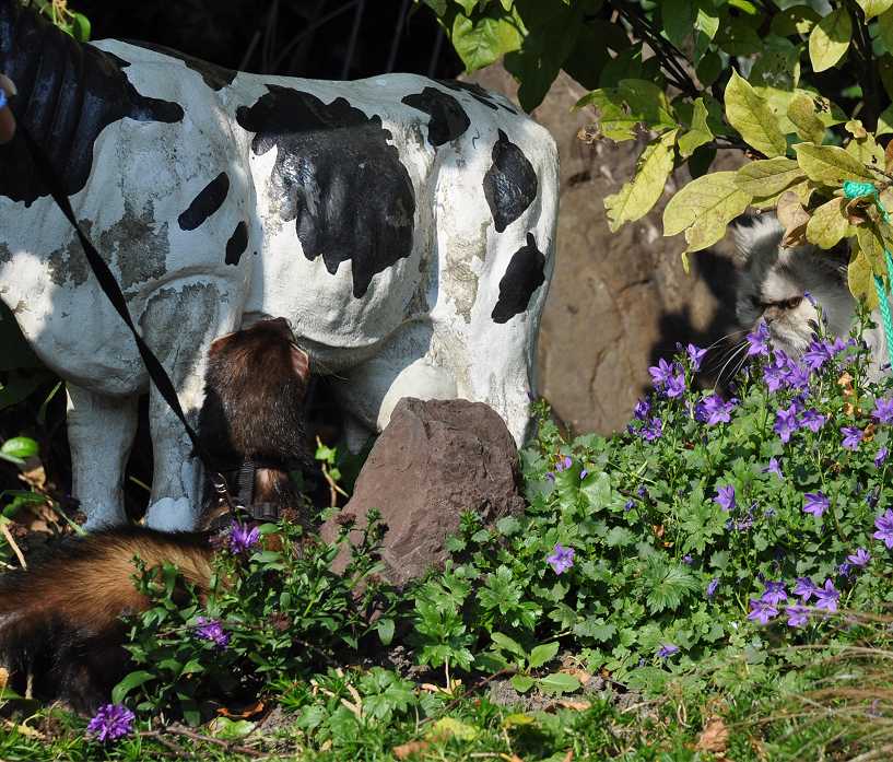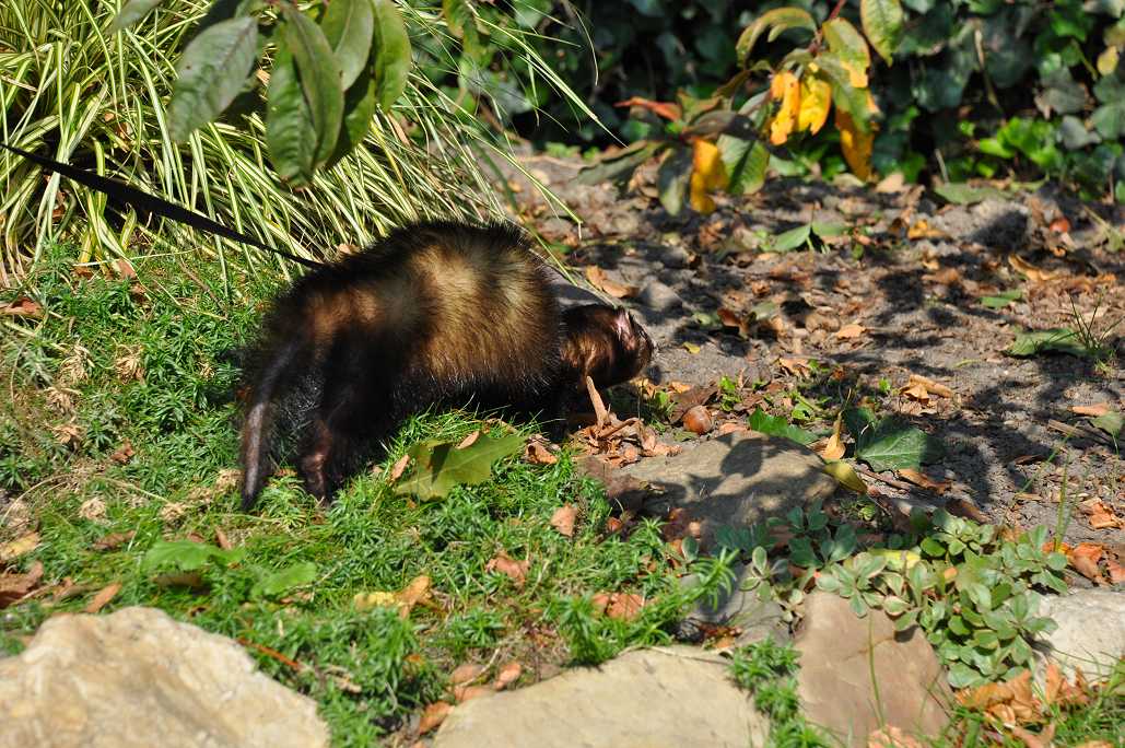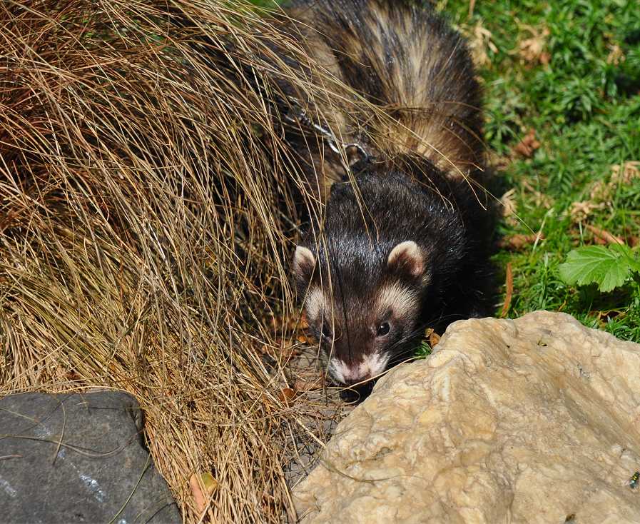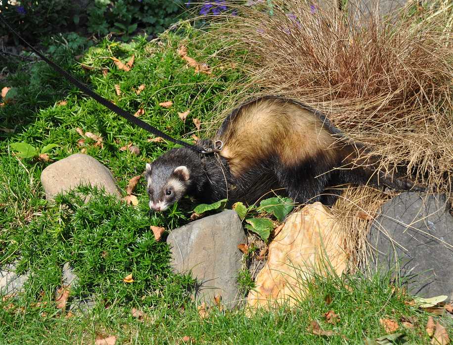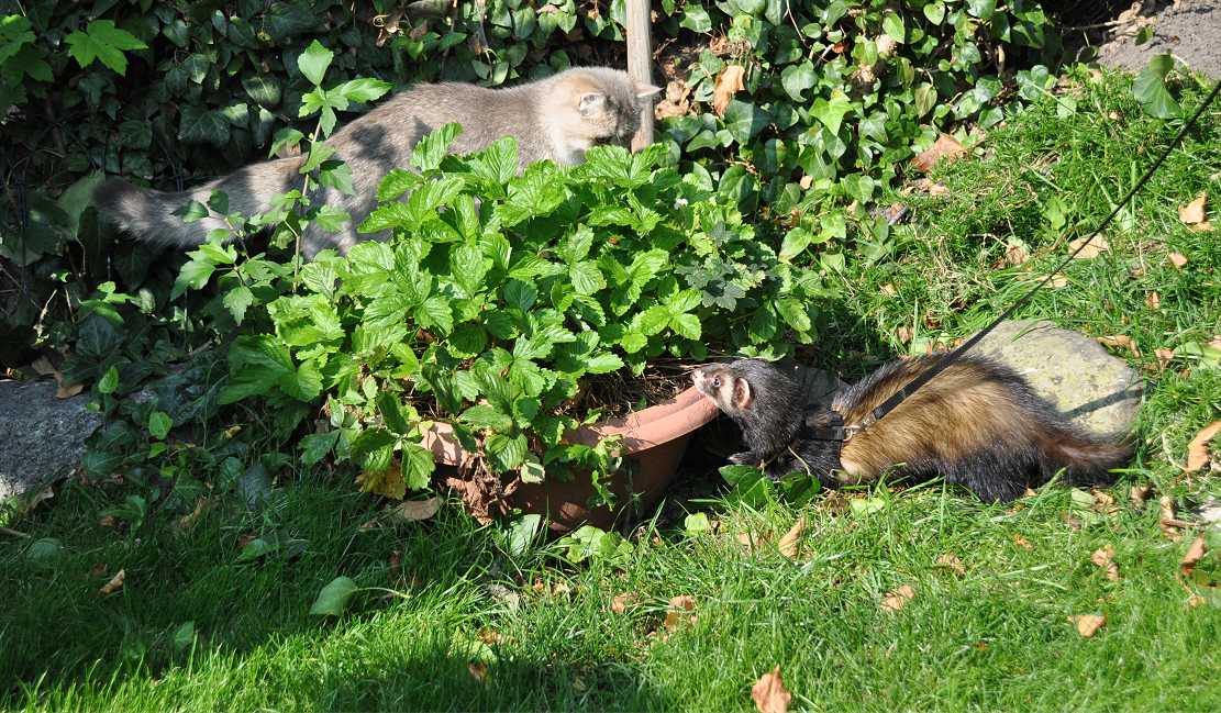 Auf unserem Sommerfest hatten wir uns schon ein bisschen kennen gelernt und Tobi erzählte dort von seinen Frettchen. Vor Jahren hatte ich einmal ein Frettchen auf der Straße gefunden, und es mit nach Hause genommen, Frieda wie ich (stellte sich später heraus) "ihn" nannte ... hatte mich schon damals bezaubert. So ein Spaß wie ich mit "Frieda hatte... Herbert... dem ist es Recht geschehen, war er doch dabei als ich "Frieda fand... Ich hatte im Vorfeld, ist fast 18 Jahre her, noch niemals zuvor ein Frettchen gesehen. Jedenfalls lief "irgendwas" über die Straße,,, ich fragte damals Herbert....WAS IST DAS????.... Er meinte lapidar... ein Frettchen.. Zufällig hatte ich Katzenfutter dabei und ging zu dem Gebüsch in dem Frieda sich aufhielt. Nachdem ich das Katzenfutter hingelegt habe, erschien zügig ein weißes langes Tier.. Es nahm das Futter und schnüffelte an mir rum.. Herbert übrigens in drei Meter Entfernung, ...hab ich ihn gefragt.. Was nun,? Er meinte ....nimm es mit, es ist bestimmt wo abgehauen und die Leute suchen es. Gut... ich hatte aber nichts wo ich es hinpacken konnte, also nahm ich es auf und steckte es unter meinen Pulli. Es fand es wohl gut da und nach einigen hin und her rollte es sich an meinem Bauch zusammen. So nahm ich es mit nach Hause. Dort angekommen, Herbert immer in großer Entfernung zu mir??? fragte ich und nun? Wir holten einen großen Käfig aus dem Keller und packten Frieda da rein. Leider waren die Gitter zu weit auseinander und Frieda turnte rein und raus wie "er" wollte. Nachdem ich mich wunderte warum Herbert mit den Füßen auf dem Sessel saß und ich ihn fassungslos fragte.. Was machst du da eigentlich? und warum hilfst du mir nicht Wasser und Futter reinzustellen? meinte er nur..... Biste wahnsinnig... weißte eigentlich was.... DIE FÜR ZÄHNE HABEN!!!!! Ich hätte ihn erwürgen können, hatte ich doch Frieda unterm Pulli transportiert... Frieda blieb drei Wochen bei uns, bevor der Frettchenschutzbund ihn abholen konnte. In diesen drei Wochen.... hatte ich einen Heidenspaß, Herbert lebte grundsätzlich nur auf Tischen und Stühlen und sprang von Couch zu Couch und wenn das auch nix nutzte..rannte er los und schloß sich im Badezimmer ein.. Letzte Zuflucht nannte ich das :-) :-) Frieda hatte es aber auch auf ihn abgesehen, sobald er den Raum betrat, rannte er los und versuchte Herbert in die Zehen zu zwicken, ich hatte gemeinerweise richtig Spaß!!!! Bei mir war Frieda der liebste, er "half" mit wischen, er ging schön aufs Katzenkloo, und spielte mit Bajana meinem damaligen Chinesen und mit den Katzen verstand er sich super. Nur Herbert...... die beiden.... das war Spaß pur. Ich war super traurig als sie kamen um ihn zu holen, leider steckte ich damals mitten im Umzug und konnte Frieda nicht behalten, aber ich nahm mir vor... irgendwann gibt es bei mir auch ein Frettchen.. In Anbetracht meiner Hunde .. habe ich es aber dann nie verwirklicht, und jetzt.... jetzt kommen Frettchen...wenn auch nur zu Besuch, aber.... das war toll..... schon damals fand ich diese possierlichen katzenähnlichen Wesen unglaublich.
