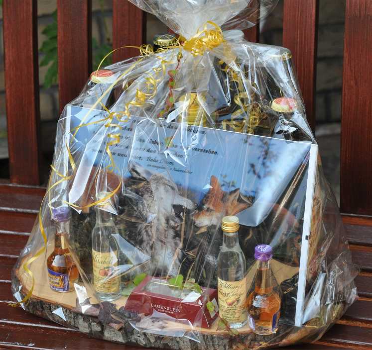 Wir bekamen noch ein ganz tolles Präsent aus Bayern, eine SELBSTGESCHNITTENE Baumscheibe mit richtigen Blättern geschmückt und Leckeres aus Bayern darauf platziert!