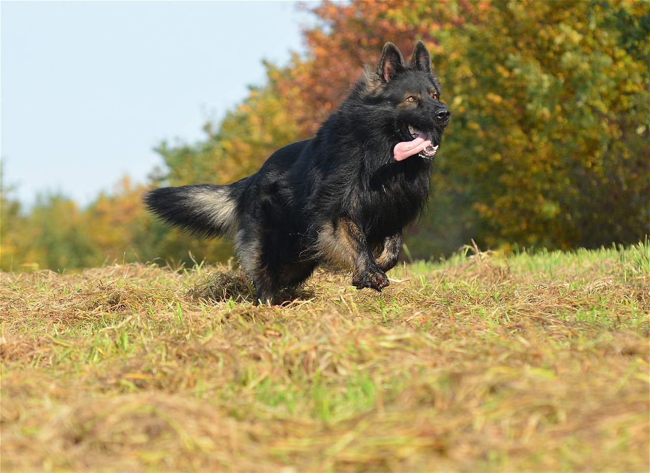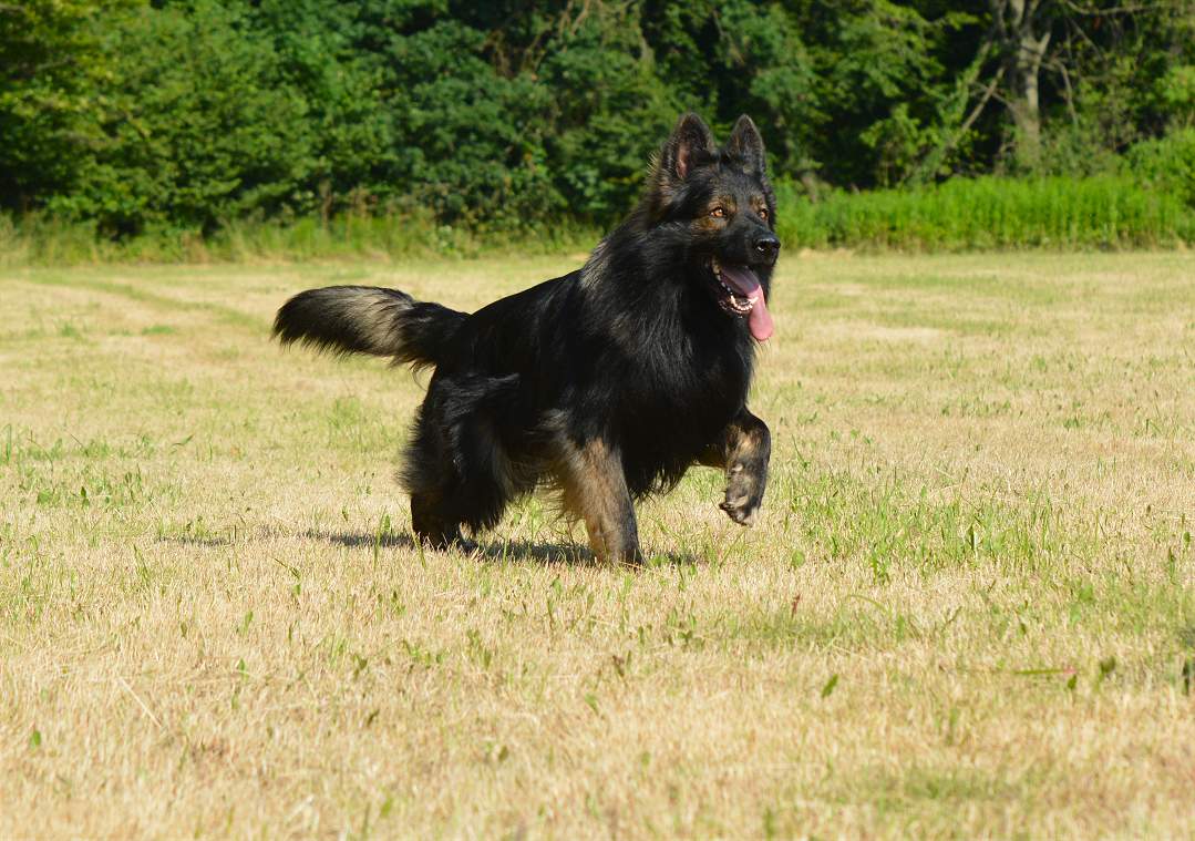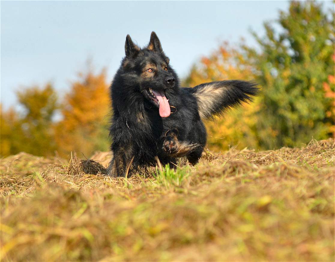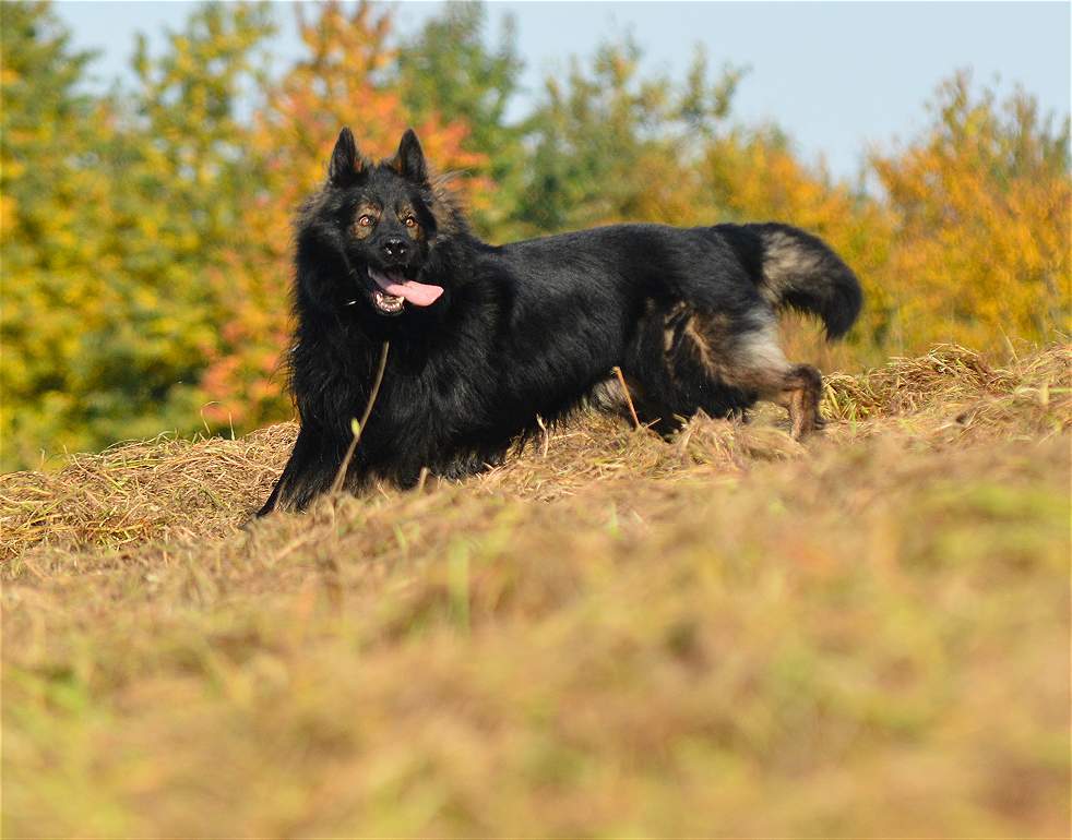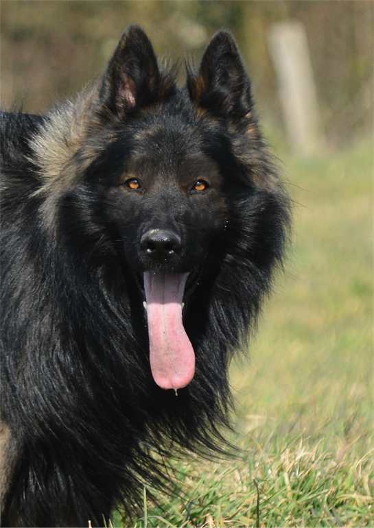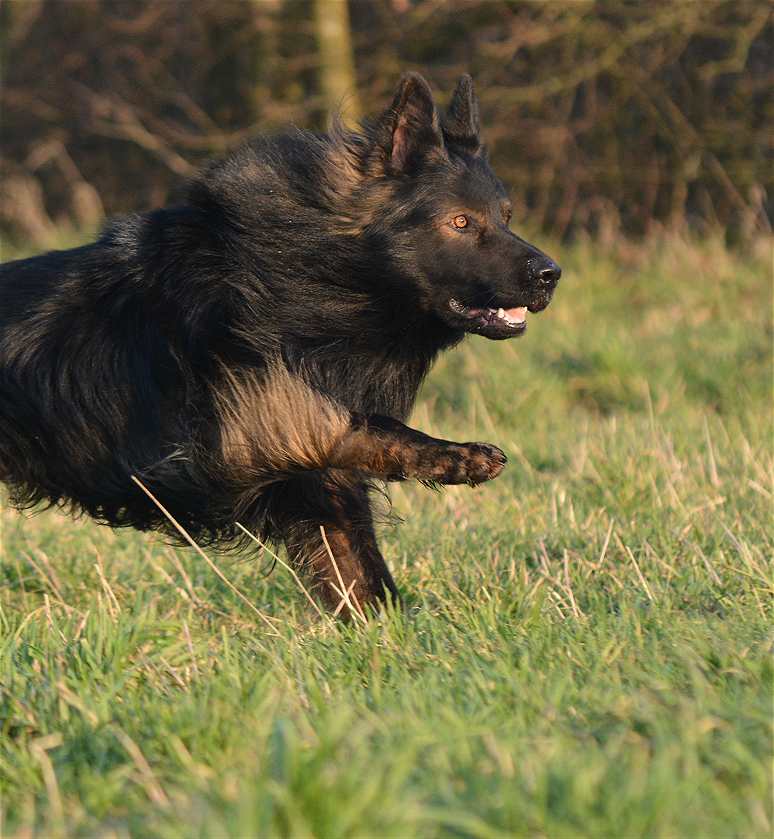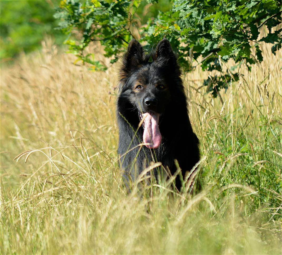 Grizzly hat einen wölfischen Ausdruck und meist bewegt er sich auch so. Oft hält er den Kopf tiefer was den Eindruck verstärkt. Ich finde er ist ein wirklich schöner und ausdrucksstarker Hund. Seine Augenfarbe in dem dunklen Gesicht verstärkt den Eindruck noch. In der Sonne ist er beeindruckender Hund, im Schatten oder im Halbdunkel jedoch sieht er wirklich richtig imposant aus.