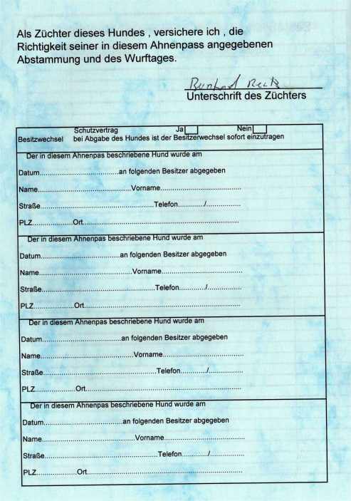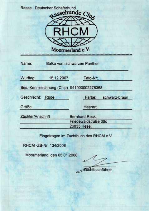 Ich hätte nie gedacht das ich mal eine solche Seite benötige, aber bei diesen Vorkommnissen muss ich wohl zu solchen Mitteln greifen. Die ganze Geschichte begann damit das ich einen Anruf erhielt, ín dem mir eine junge Frau sagte, das sie einen Hund von mir hätte der sehr krank wäre??? Der Hund hieß Balko vom schwarzen Panther wog 2,5 Kilo und sollte 12 Wochen alt sein. Sie hatte diesen Hund in Moormerland gekauft hatte, bei einem Herrn Janssen. Schnell stellte sich heraus, das der Hund natürlich nicht von mir ist, aber er hat den Zwingernamen vom schwarzen Panther. Nachdem ich die Unterlagen in der Hand hatte rief ich dort an. Frech wurde mir gesagt, na und... meine Hunde können doch auch vom schwarzen Panther heißen!!! Ich informierte die HFI bei der dieser Verein eingetragen ist. Frau Lehmann von der HFI reagierte sehr freundlich und kompetent, und versicherte mir das sie in dieser Sache tätig wird und das es auch in ihrem Sinn ist, solchen Vereinen bei derartigen Vorkommnissen sofort zu kündigen. Diese Geschichte geht nun natürlich auch noch weiter, rechtliche Schritte sind selbstverständlich eingeleitet worden, denn wie viele Hunde mit diesem Namen gibt es schon? Wir suchen nun auch die anderen Besitzer die einen Welpen bei Herrn Janssen in Moormerland gekauft haben und die den Namen vom schwarzen Panther tragen. Bitte melden Sie sich bei uns. Untenstehend habe ich die Papiere des Hundes und auch einige Bilder eingefügt, bei Interesse bitte lesen. Zudem existieren für diesen Hund auch zwei verschiedene Impfpässe, diese habe ich ebenfalls einmal eingefügt. Den Ahnenpass habe ich allerdings auf das wesentliche gekürzt