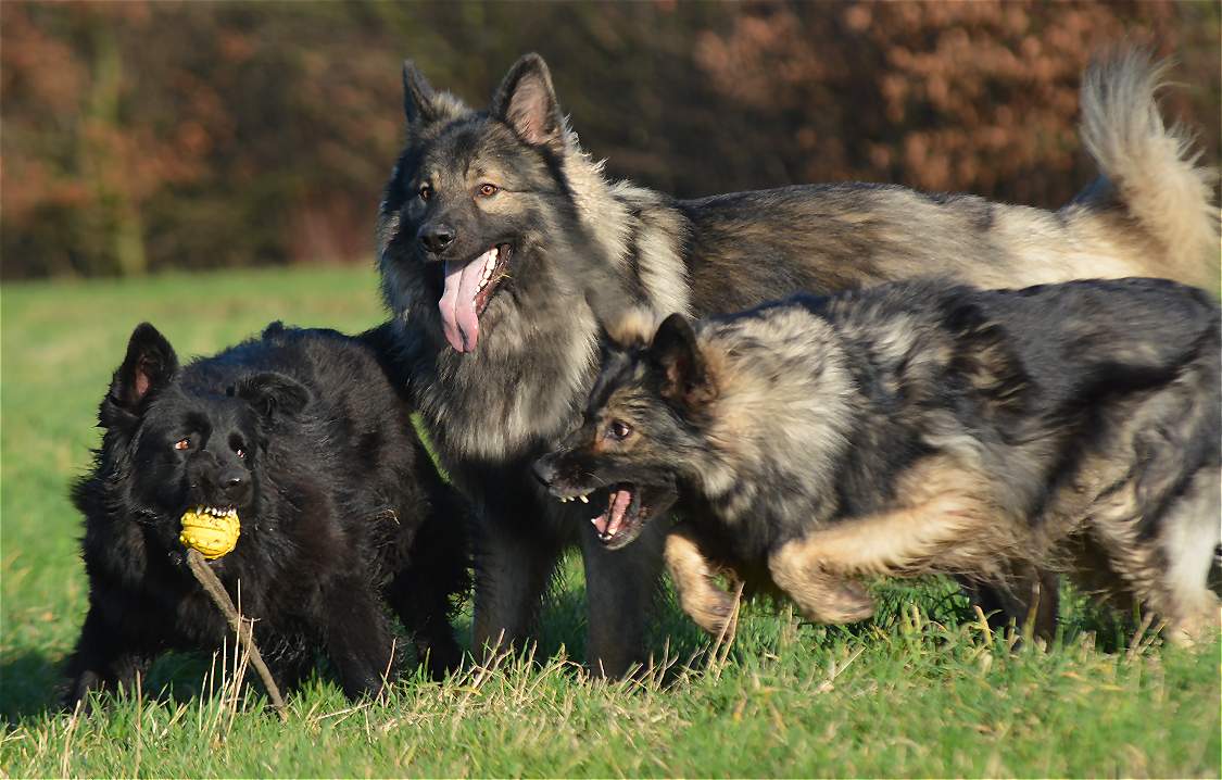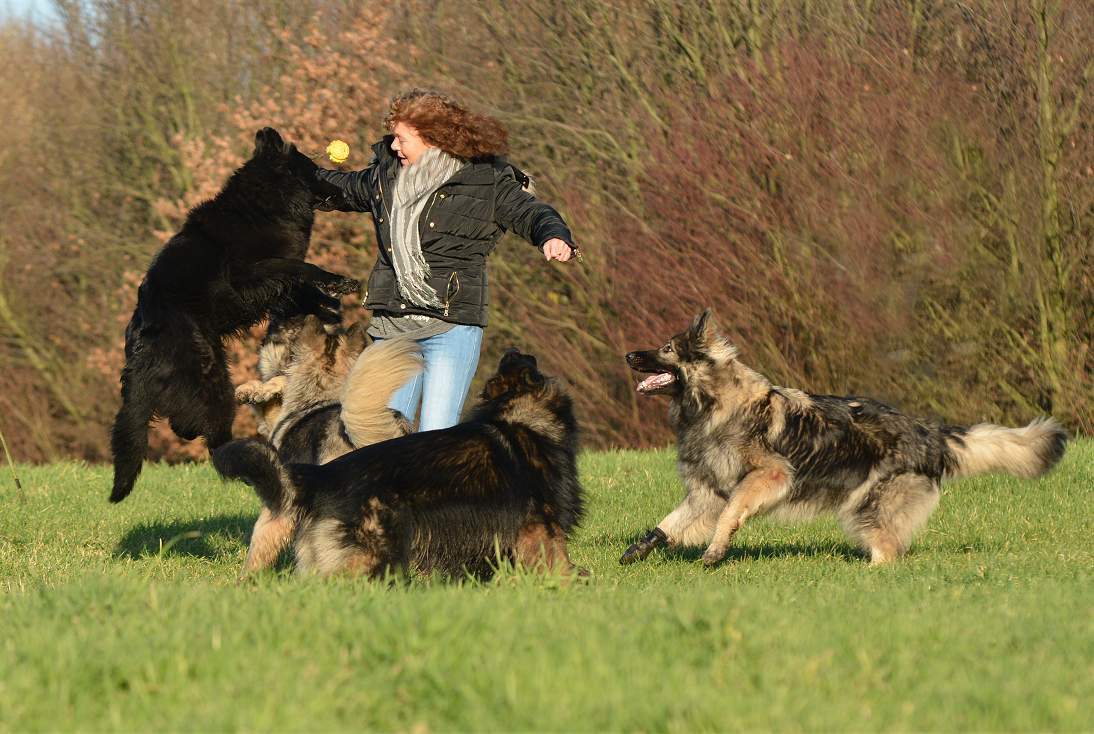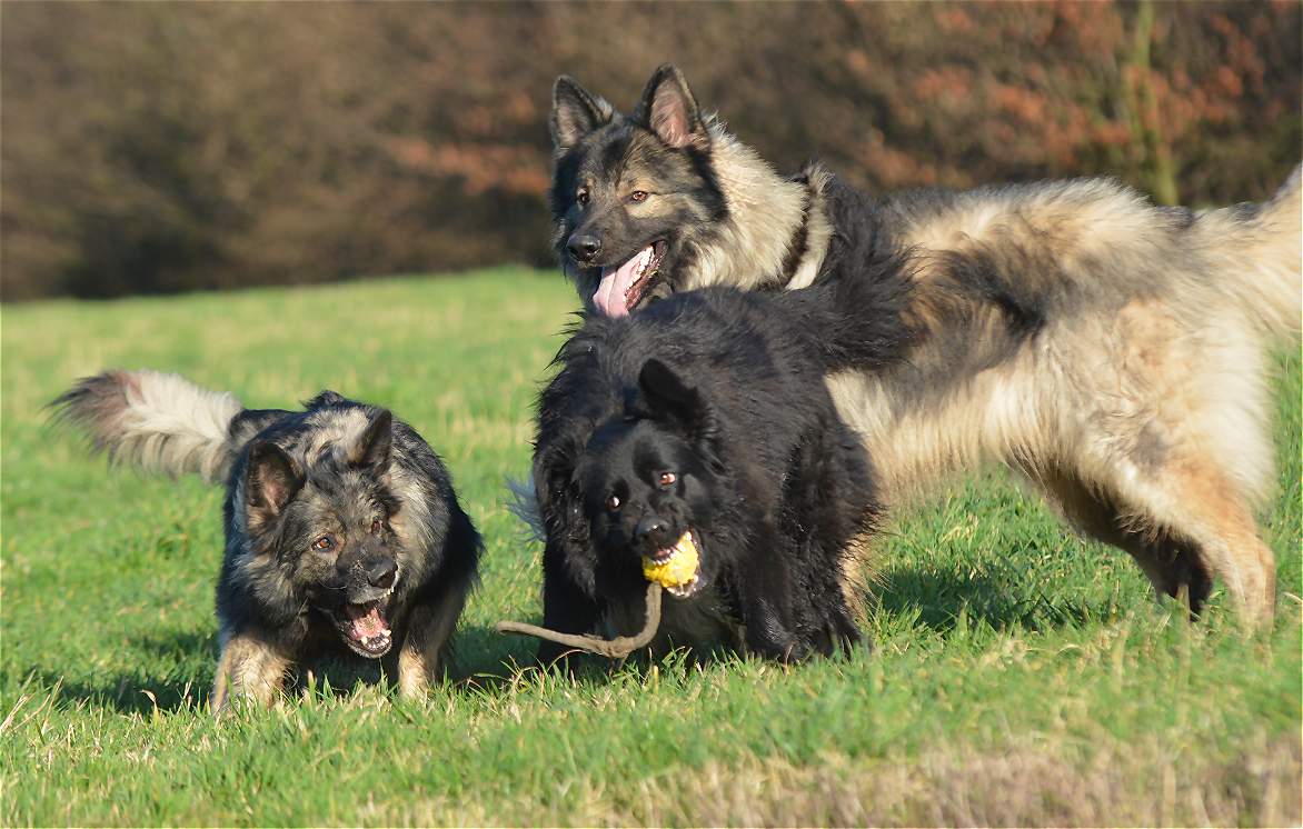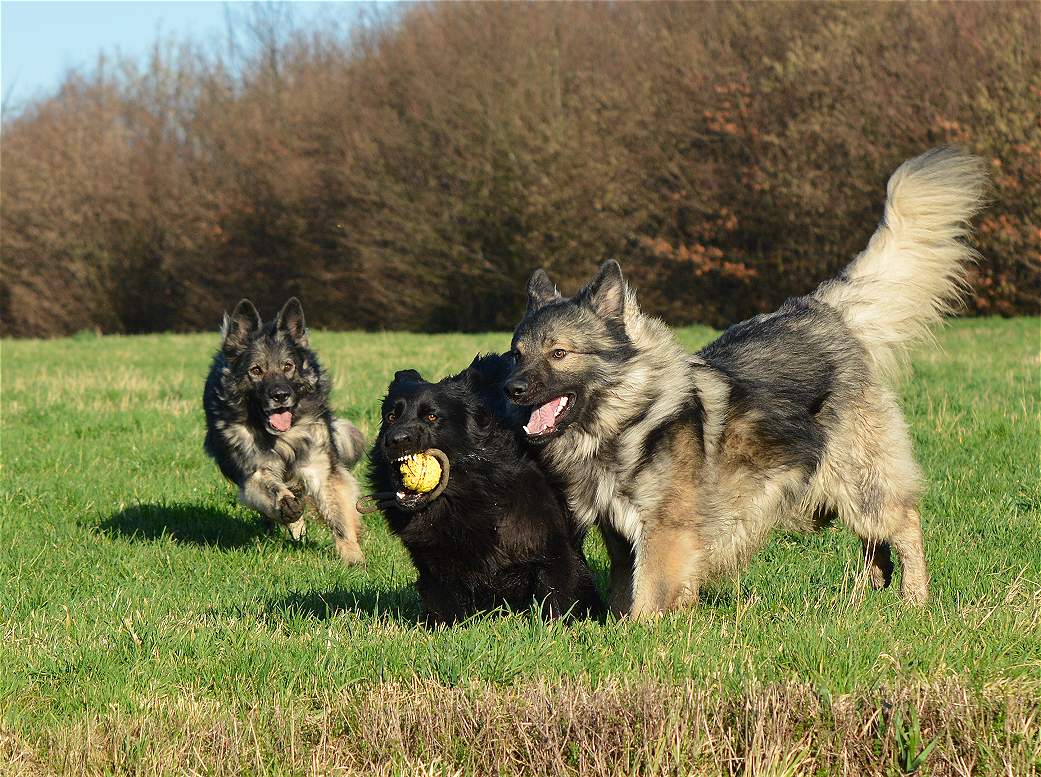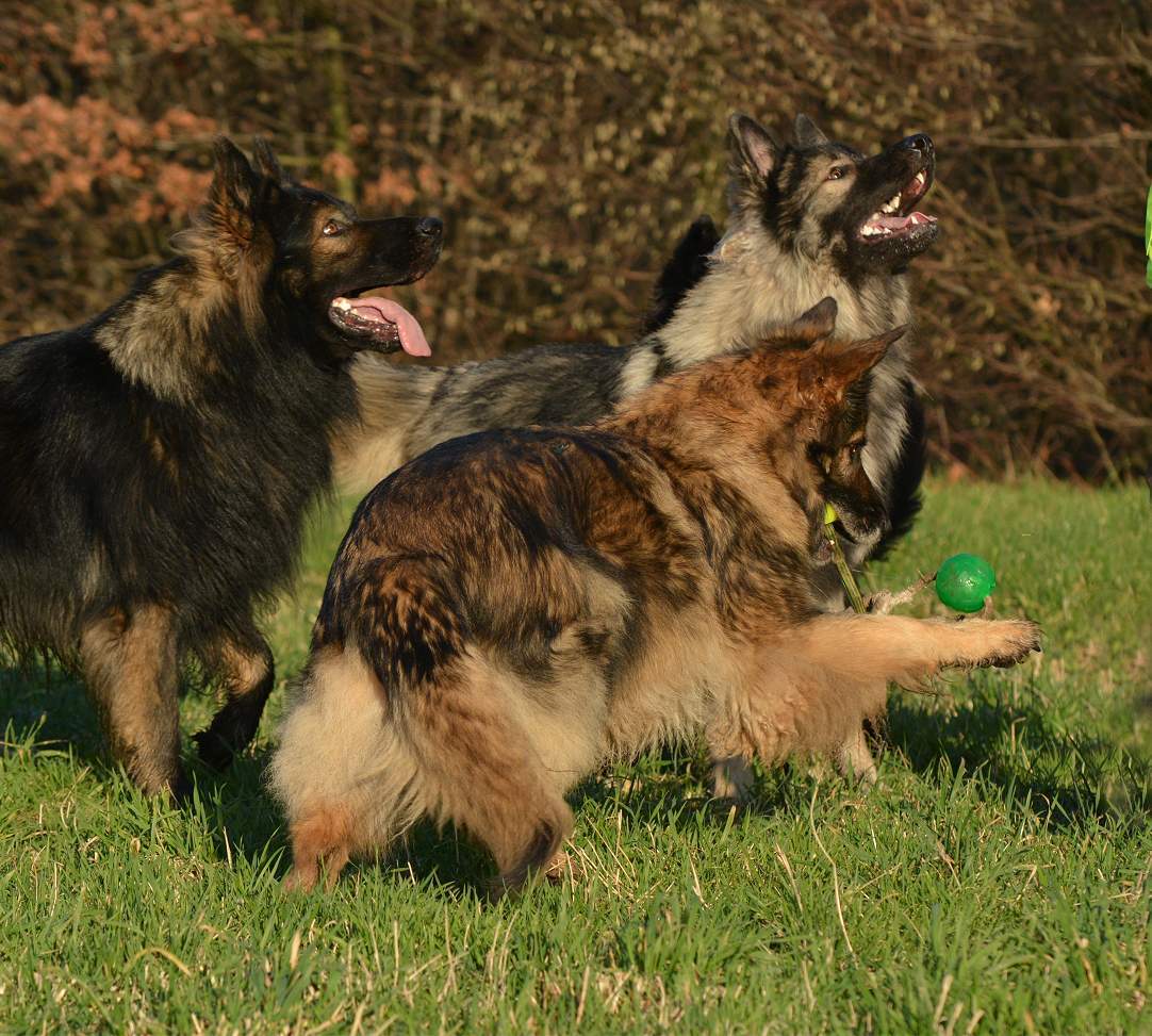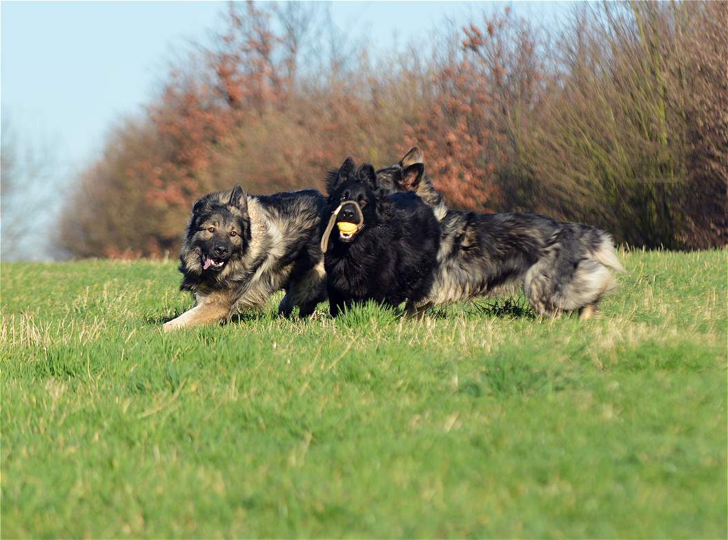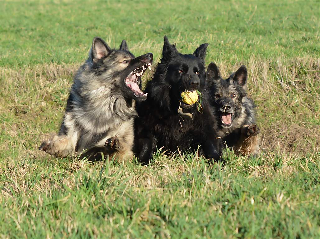 Bevor Lexa`s Mutter Chakana ganz sauer werden kann... Nazar übrigens (ist euch bestimmt schon aufgefallen) hält da mal hübsch die Klappe wenn Chefin Chakana mitrennt, weil da darf man den Mund nicht so weit aufreißen.. Das weiß ein Nazar auch sehr gut.. Und Lexa... die weiß ebenfalls genau wann Kana wirklich sauer wird und lässt dann mal ""zuuuuufällig""" natürlich den Ball fallen :-) Und allein an der Bildfolge sieht man deutlich wie fest das Gefüge ist, und wie sehr Hunde eben doch lügen können.. Nazar brüllt sonst immer rum...Lexa gibt den Ball nie und nimmer ab... Aber Im Familienverband ist Kana Cefin und da nutzt das dumme Gebrülle von Nazar gar nix und Lexa darf natürlich den Ball verteidigen und auch so tun als ob sie Kana angreift... aber nur... bis Kana sagt... Schluß...