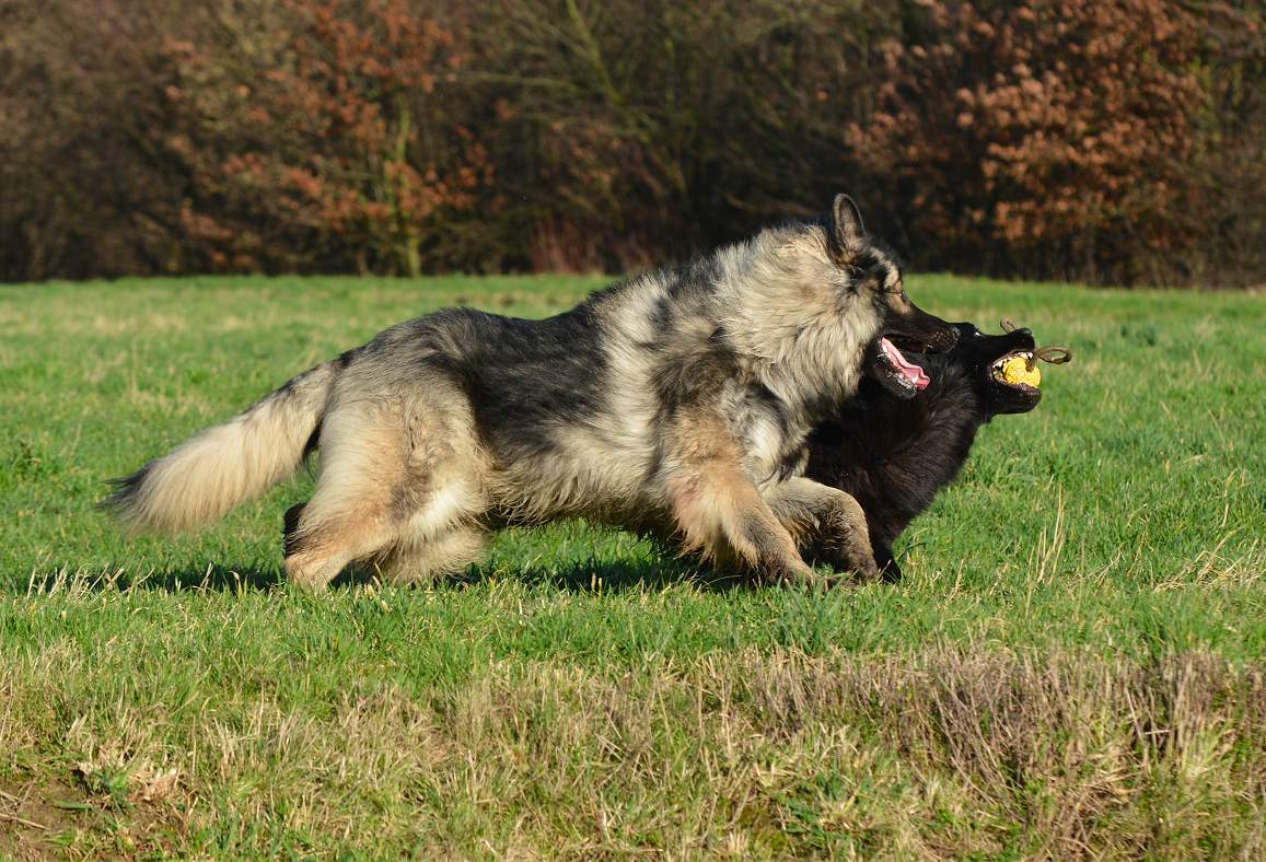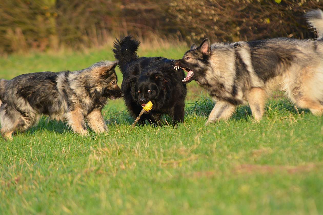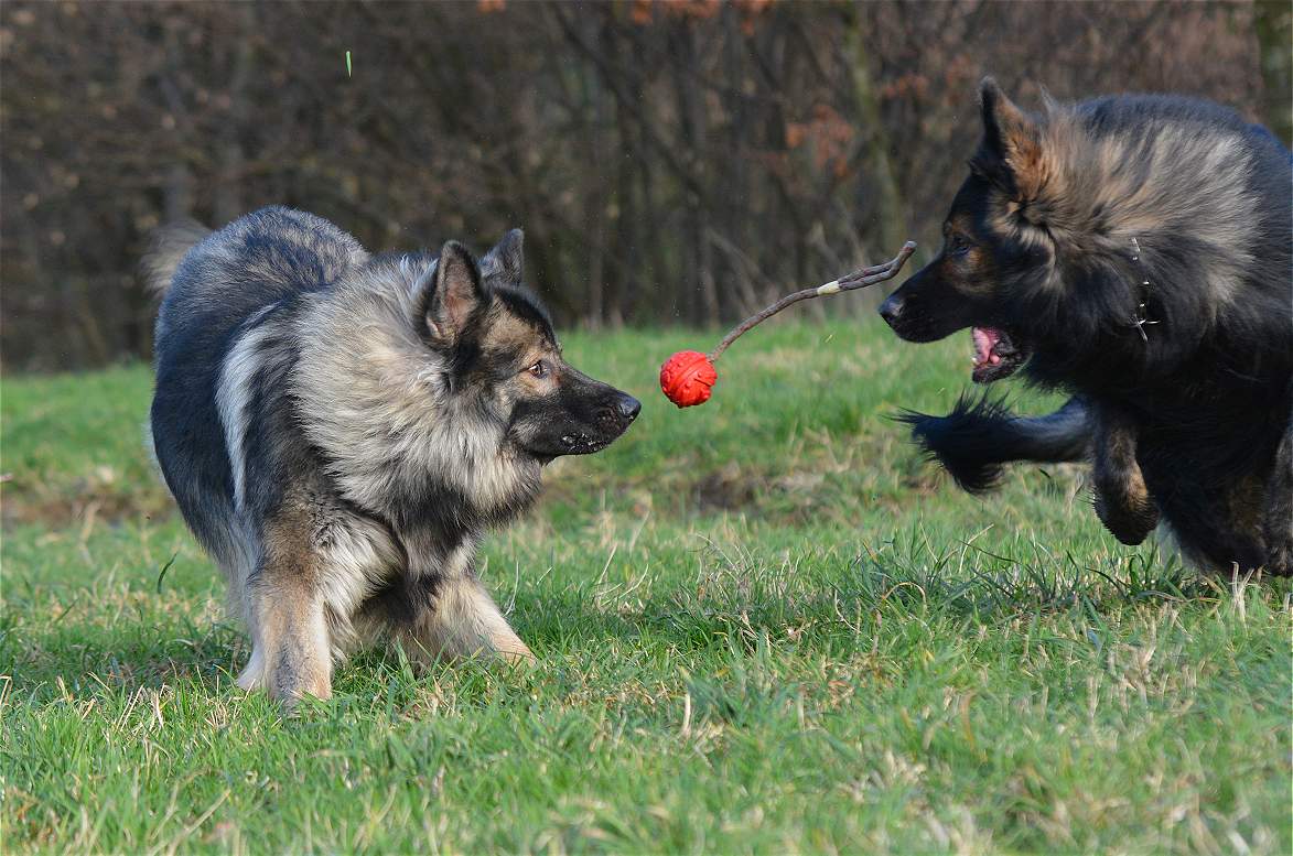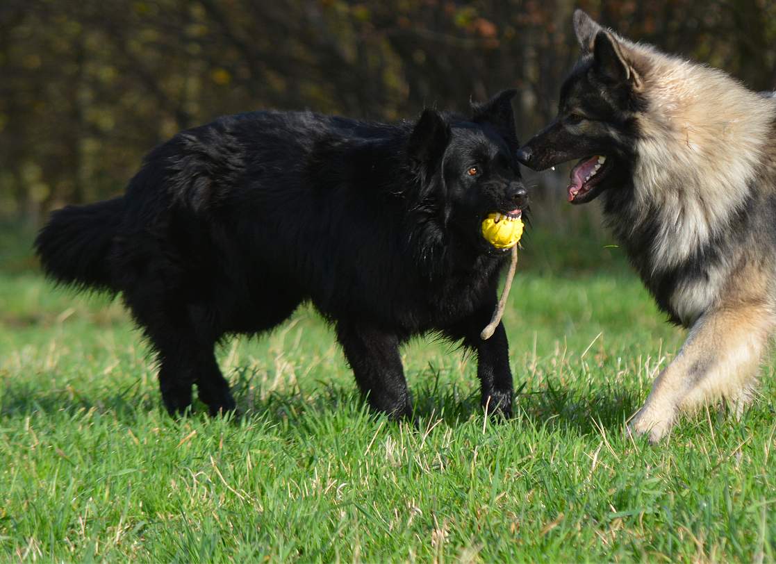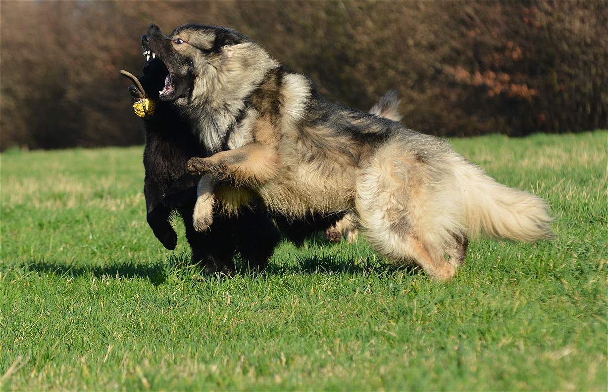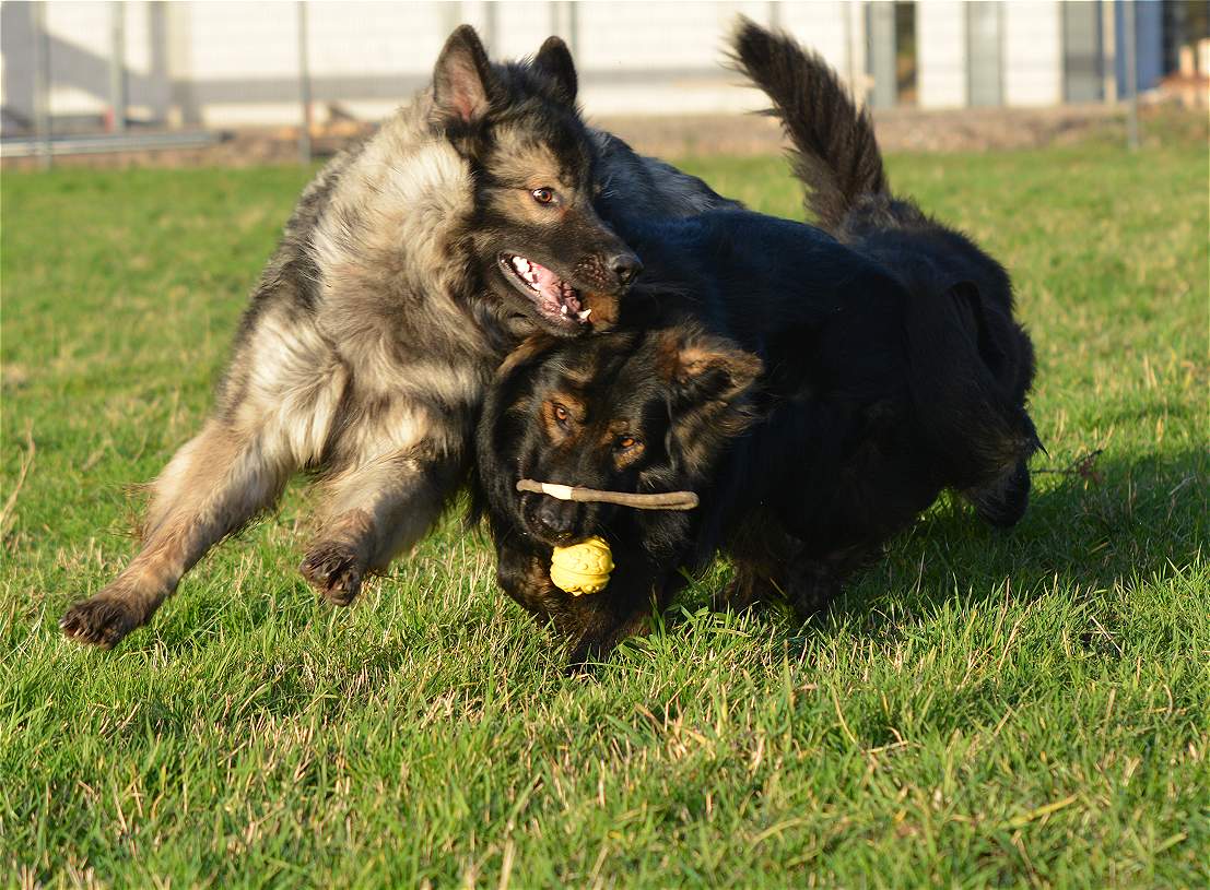 auf der Wiese wird erst mal wieder um den Ball gestritten.. Wenn ich will das Chakana viel läuft, gebe ich einfach ihrer Tochter Lexa einen Ball und ihr eben nicht.. Und schon haben wir eine Kana die unermüdlich versucht Lexa den Ball zu klauen und eine Lexa die mit aller Kraft versucht, diesen zu behalten.. Sie schreien sich an... und keifen umeinander.. aber nur Show.. Und da behaupten Menschen ""Hunde lügen nicht"" Natürlich tun sie das, zumindest soweit es im Rahmen bleibt... So schlimm das draußen aussieht ... passieren tut nichts...