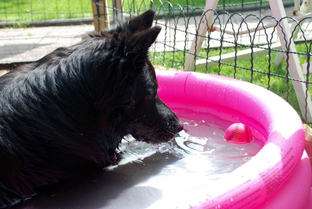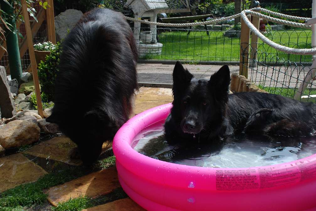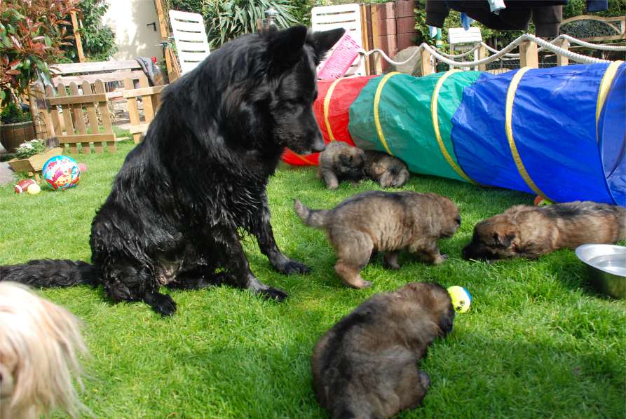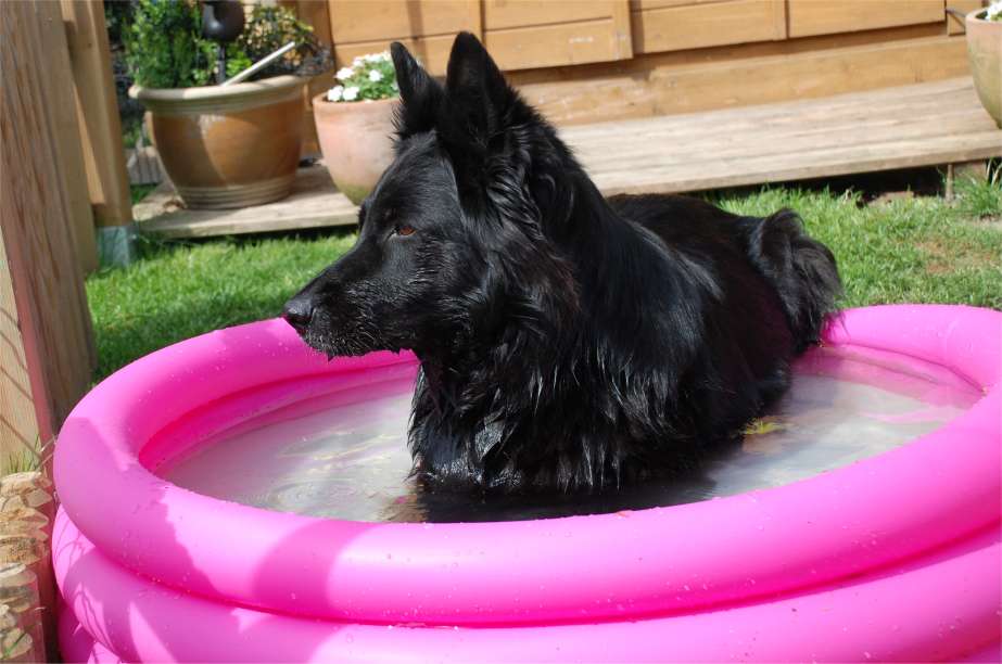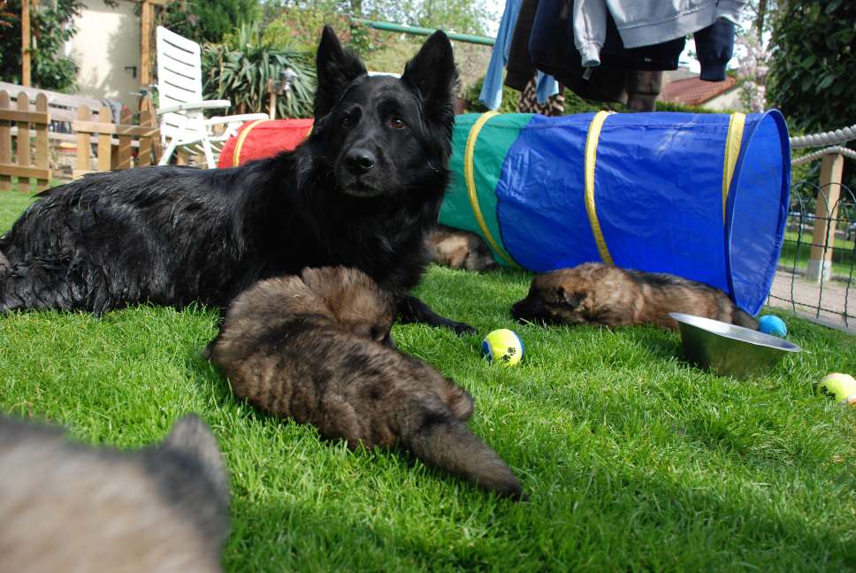 Gestern nachmittag, da hatten wir einen wunderschönen Tag, den ganzen Nachmittag war ich mit Jess und den Welpen draußen, sie lag in ihrem Plantschbecken, und wenn sie nicht mehr wollte dann eben neben mir im Schatten auf der Wiese , sie lag mitten in den Welpen ...... und sie hat gelacht!