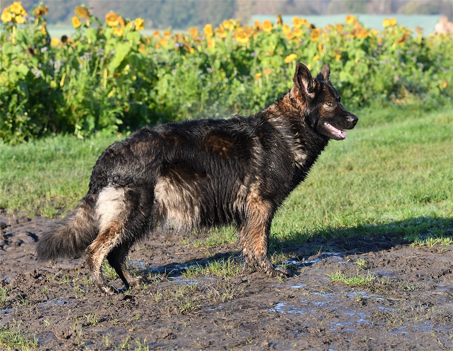 ![]() LaToya heute beim Morgenspaziergang in den Feldern. Natürlich darf da tägliche waschen nicht ausfallen, also...rin in den Schlamm, damit Frauchen zuhause auch gut was zum überbaden bekommt. |