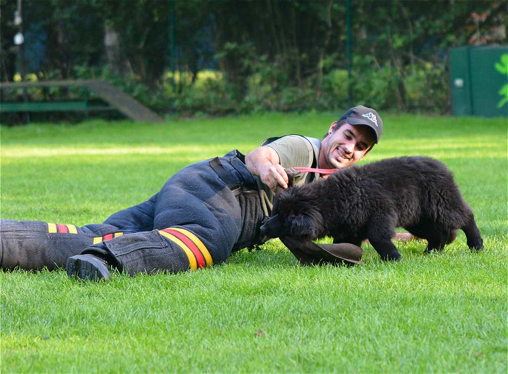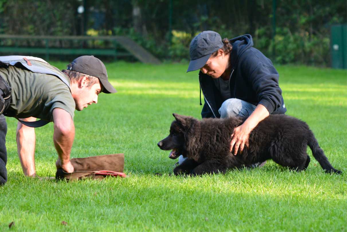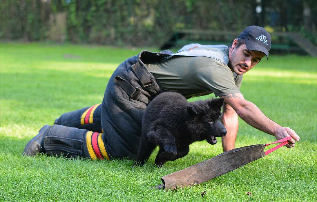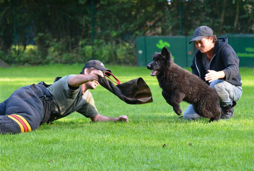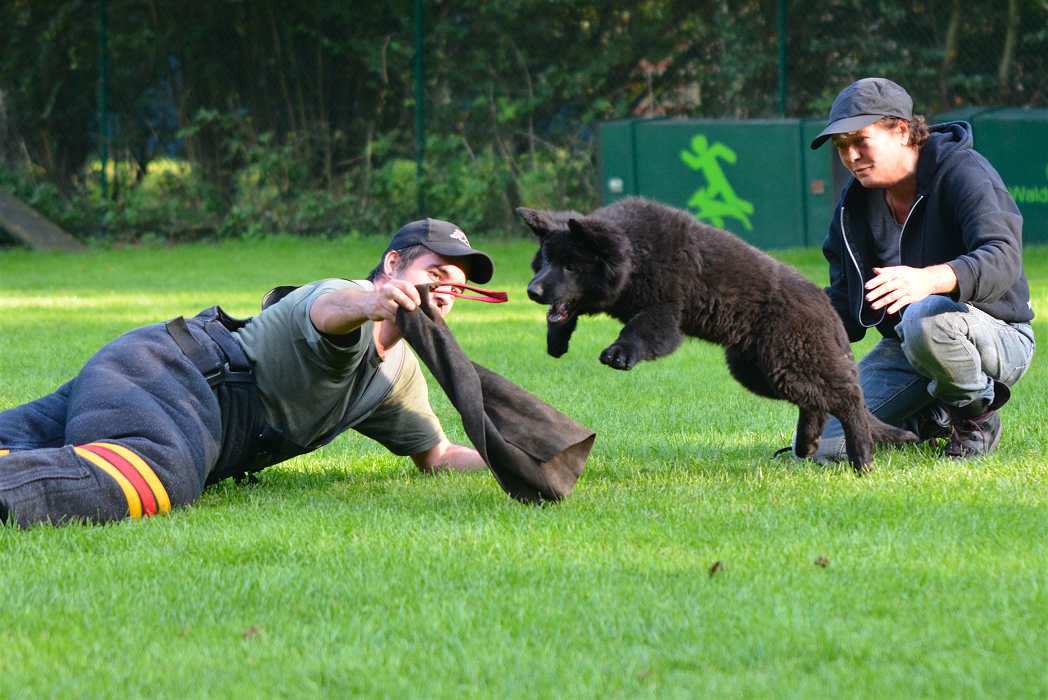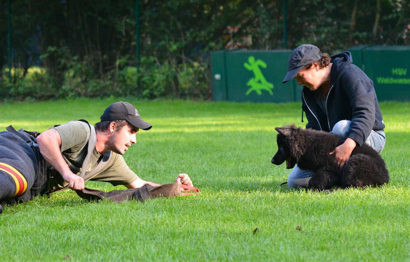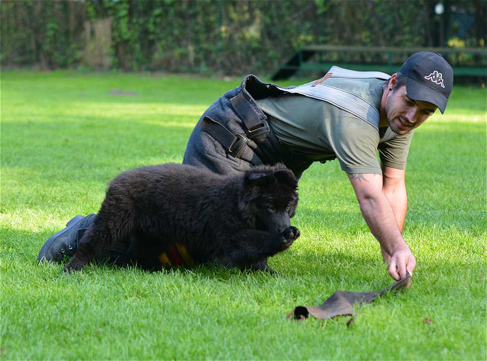 Hundeplatz, auch kein Thema. Wir haben ihr schon mal ein bisschen den ""Schutzdienst"" gezeigt. Und diese Bilder stelle ich mit voller Absicht ein, denn besser als diese Fotos kann man nicht klarmachen, das es beim VPG Sport nicht darum geht, Menschen zu beißen, sondern darum ein Beutespiel perfekt zu beherrschen. Auch so kleine Hunde wie Lexa mit gerade 12 Wochen können sehr wohl lernen, was sie sollen. Und das Lernen gestaltet sich reinweg als Spiel und spaß für den Hund.