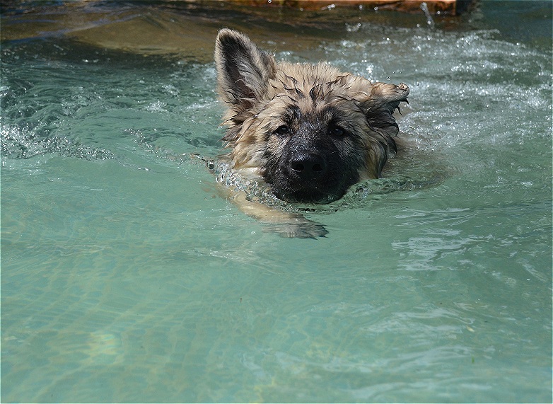 ![]() Inzwischen sind einige weitere Wochen vergangen und Luxe ist eine sichere und geübte Schwimmerin geworden. Sie geht begeistert und oft auch alleine schwimmen, einfach um der Bewegung willen. Dazu sollte ich sagen, daß die Hunde nur Zugriff auf den Hundepool haben wenn einer von uns dabei ist. Ansonsten ist er gesichert. Ich denke es ist gefährlich eine Horde halberwachsende und übermütige sowie.... ""ich kann besser als du"" Hunde, alleine im Wasser rumplantschen zu lassen. Es sei denn man hat keine Lust das Erwachsenwerden der jeweiligen Jungspundes zu erleben. Wie kleine Kinder haben sie es echt drauf sich gegenseitig auch mal feste unter zu döppen... Vor allen Dark hat die Vorzüge dieser Vorgehensweise für sich entdeckt, kann man doch der so überraschten Gdöppten , mal eben und ohne viel Federlesens den Ball aus der Schnüss ziehen. Denn die so schäbig behandelten mit dem Kopf unter Wasser gedrückten, haben meist mehr Lust wieder Luft zu kriegen als das Spielzeug noch länger festzuhalten. #Ihr seht bei uns isses nicht so wirklich langweilig und aus diesem Grunde dürfen die Hunde nur in den Pool wen Frauchen, Herrchen oder Sandra die Oberaufsicht haben ;) |
