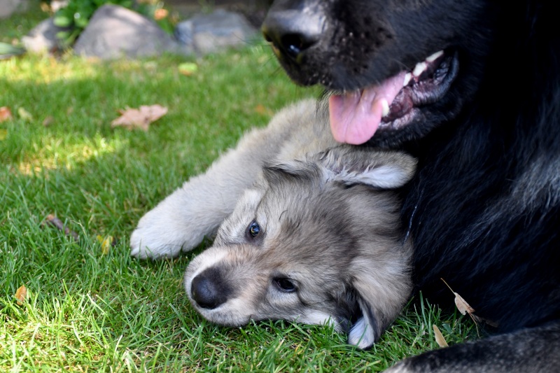 ![]() Maniac inzwischen 4 Monate alt ist ein furchtbar großer Hunderabauke geworden. Er hat ziemlich beeindruckend dicke Beine und ist schon halb so groß wie Diego. |